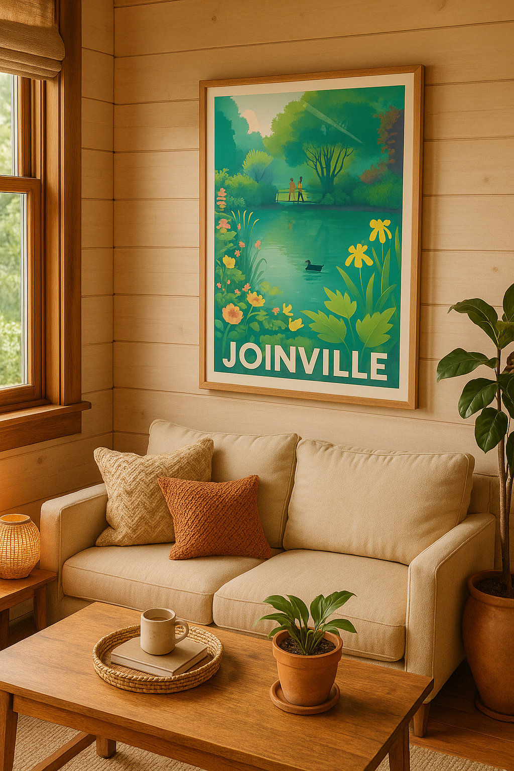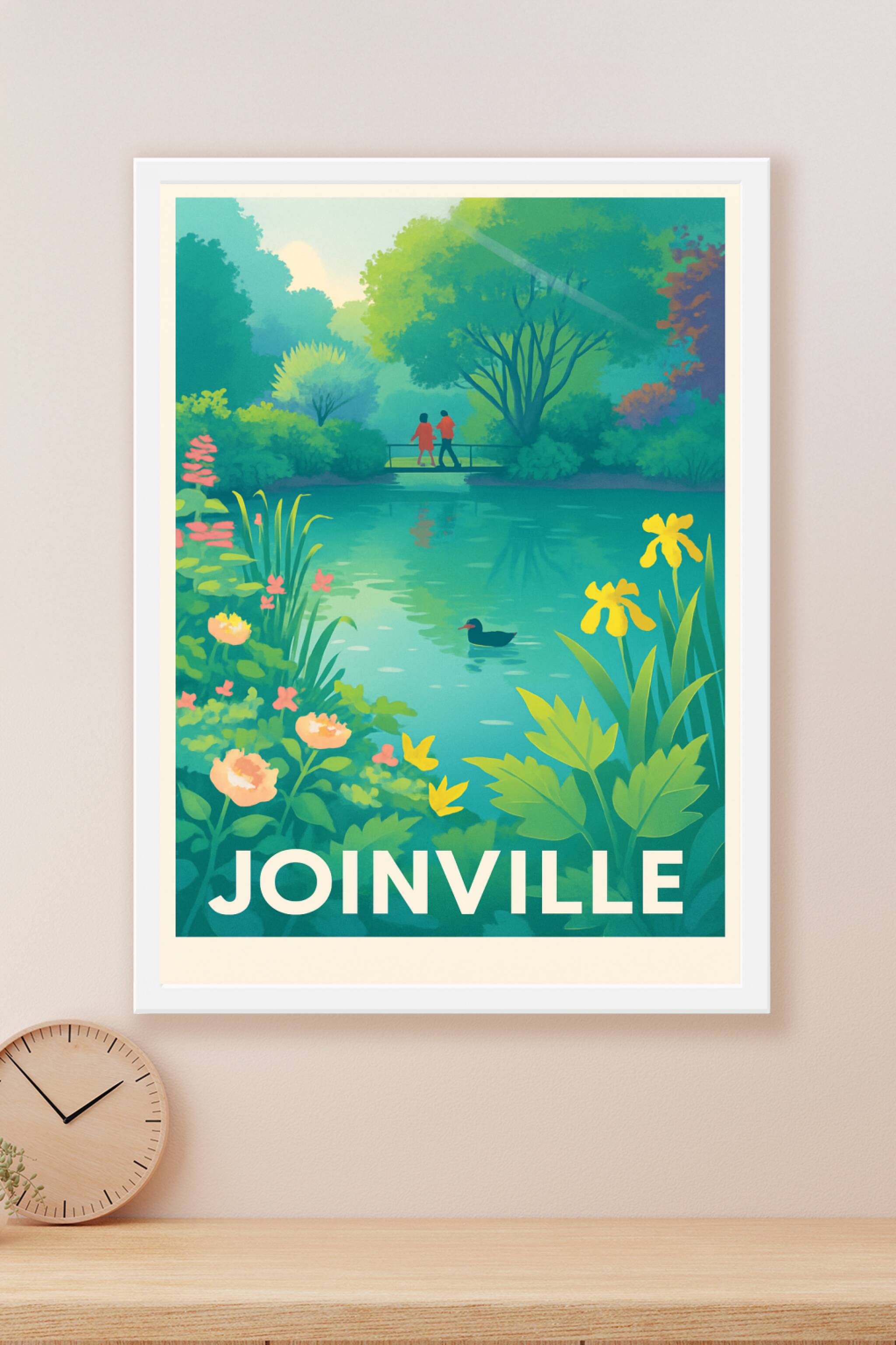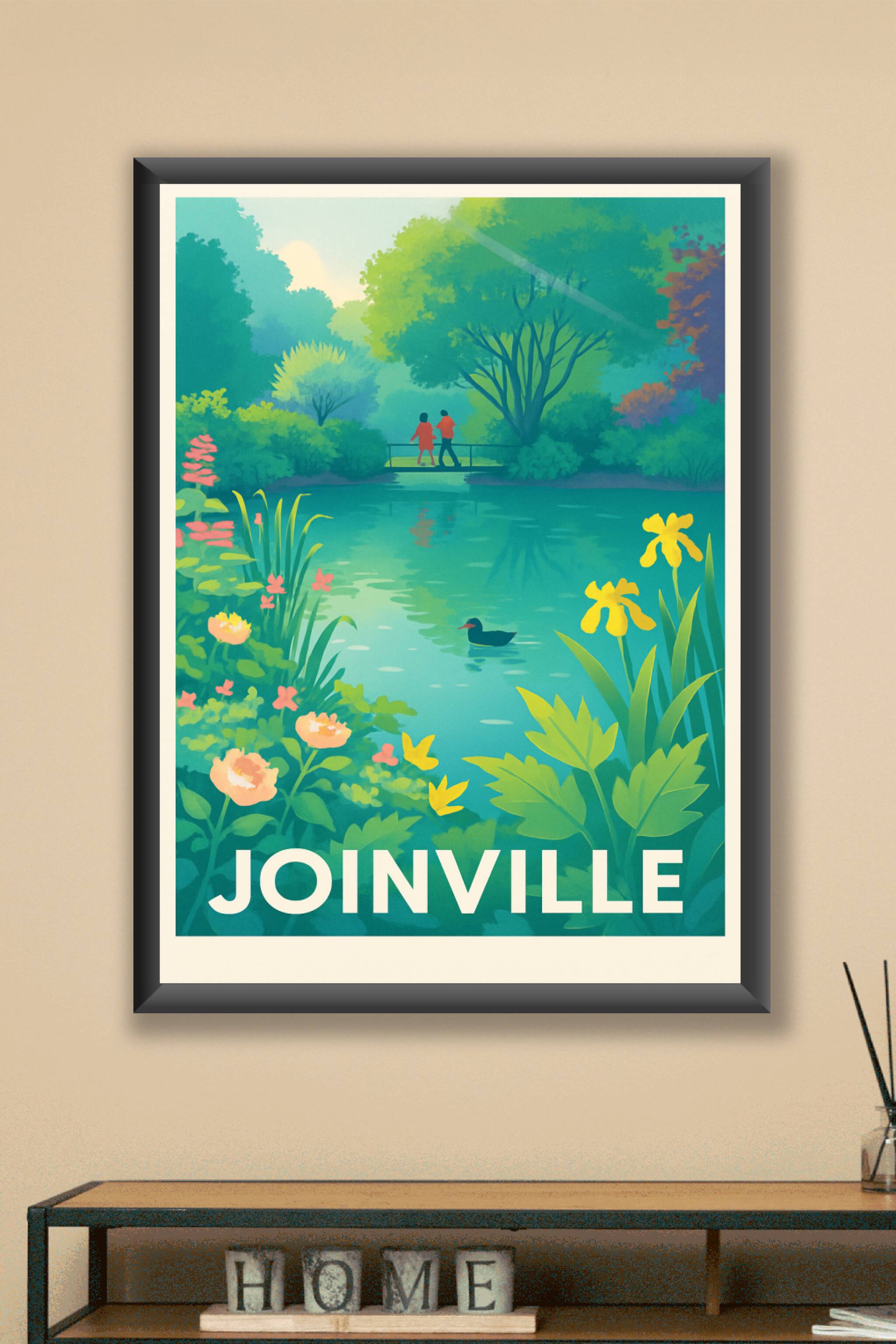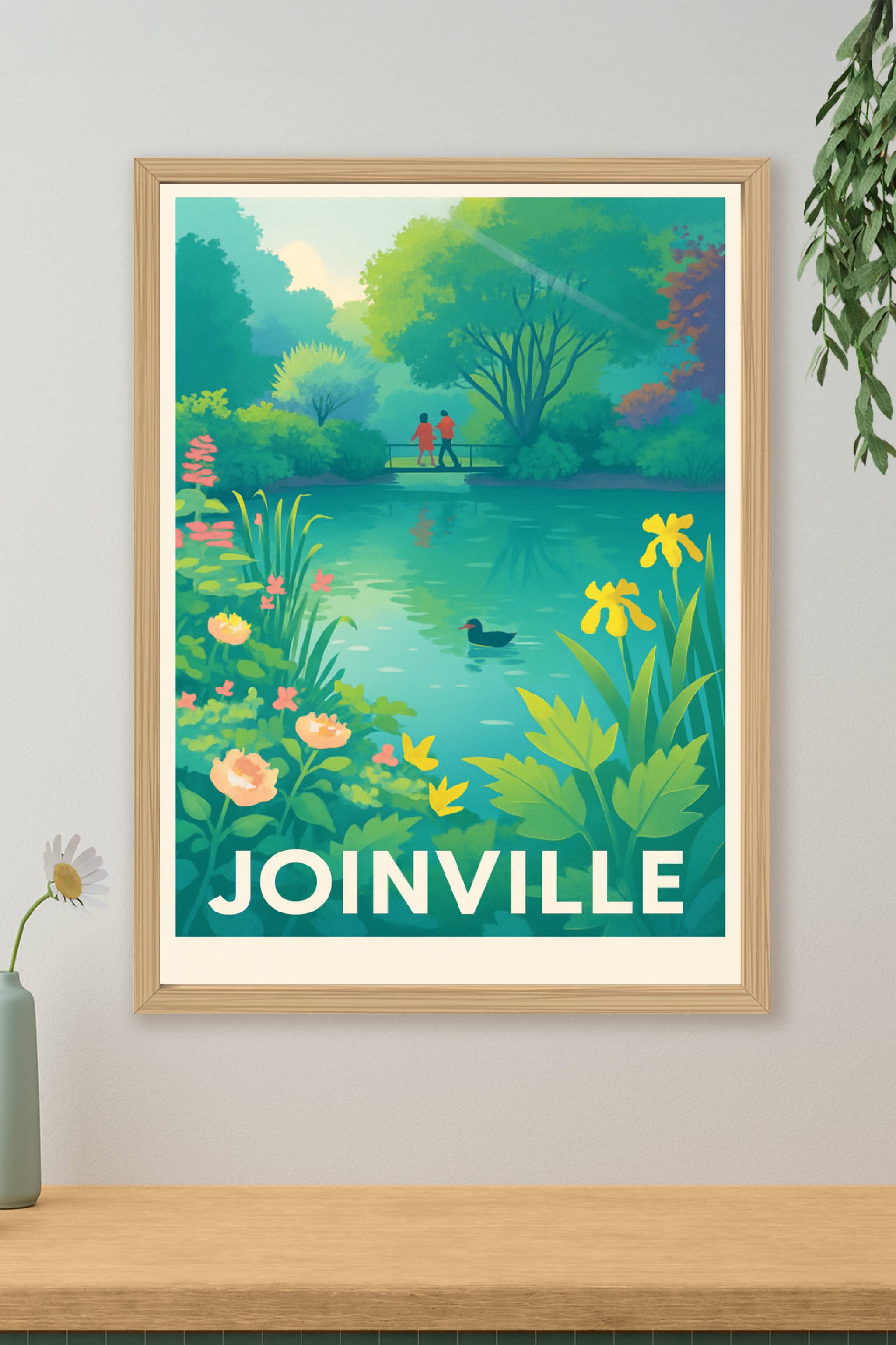 Découvrez la sérénité de Joinville à travers cette affiche illustrée représentant un paisible étang entouré de végétation luxuriante, où un couple ...