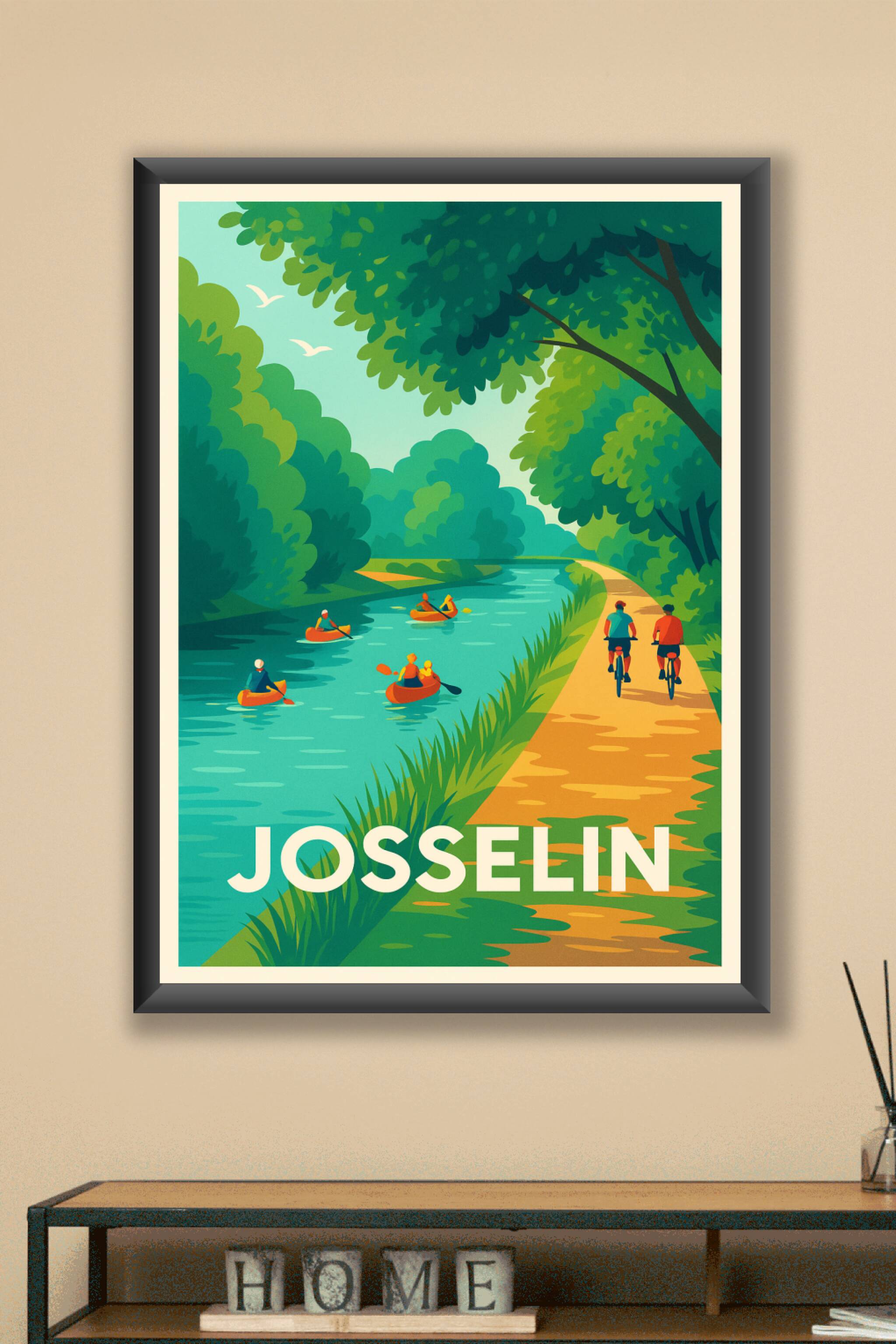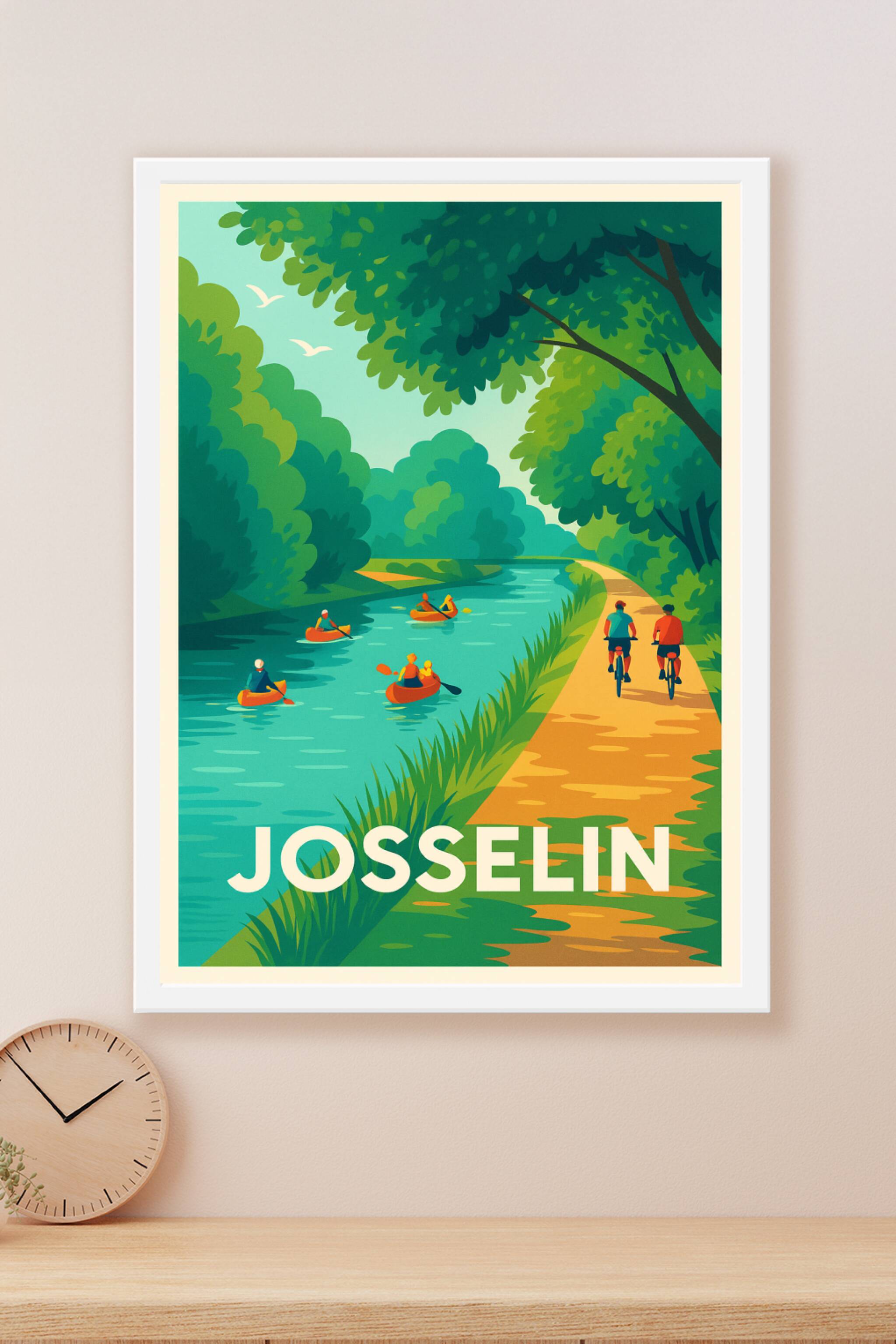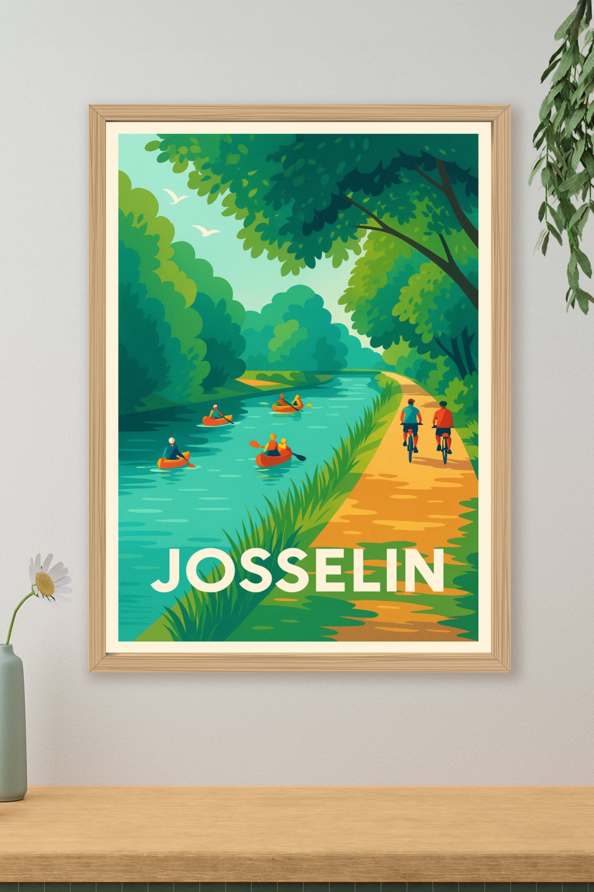 Découvrez la sérénité de Josselin à travers cette affiche illustrée mettant en scène une douce balade au bord du canal, où canoës et cyclistes se p...