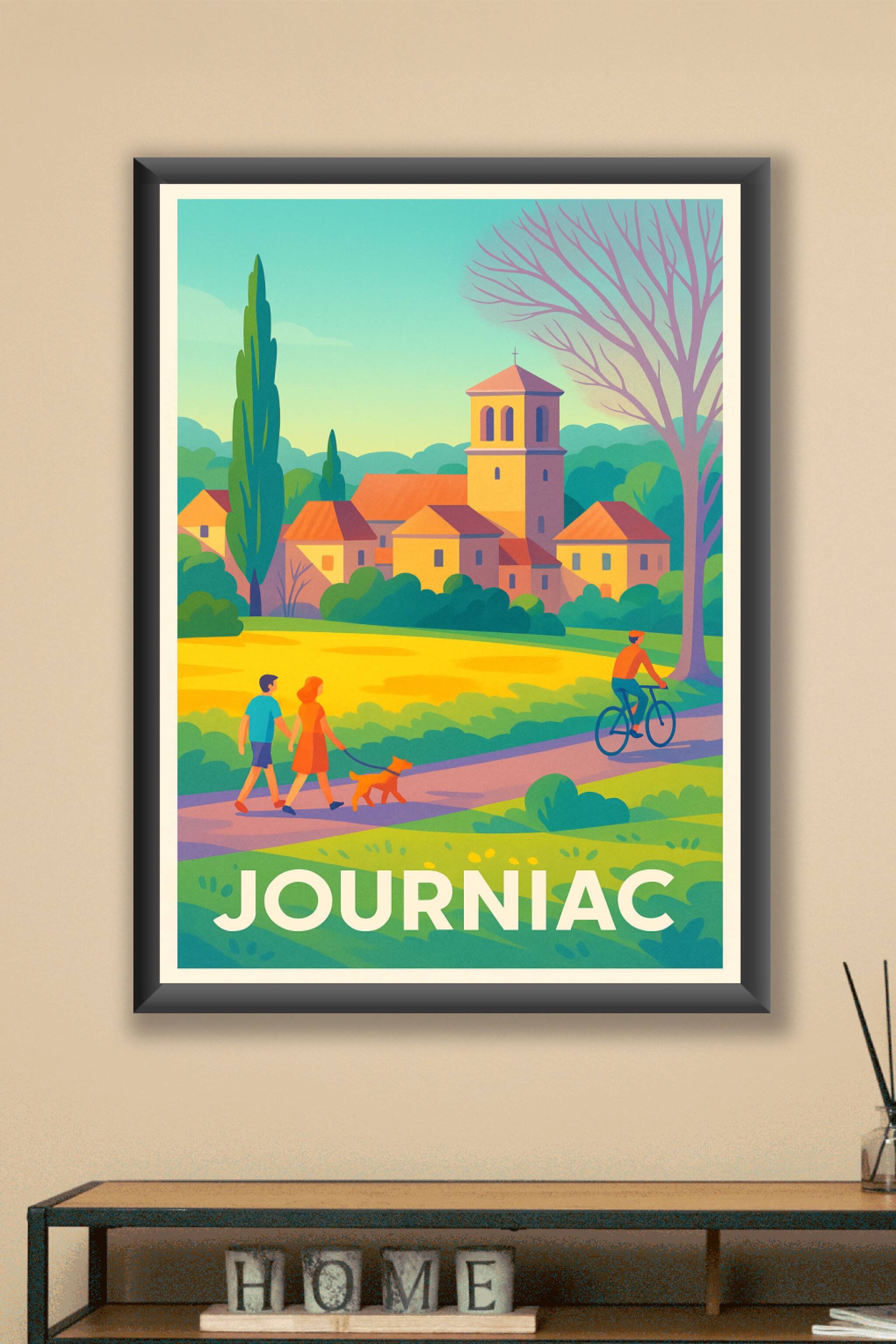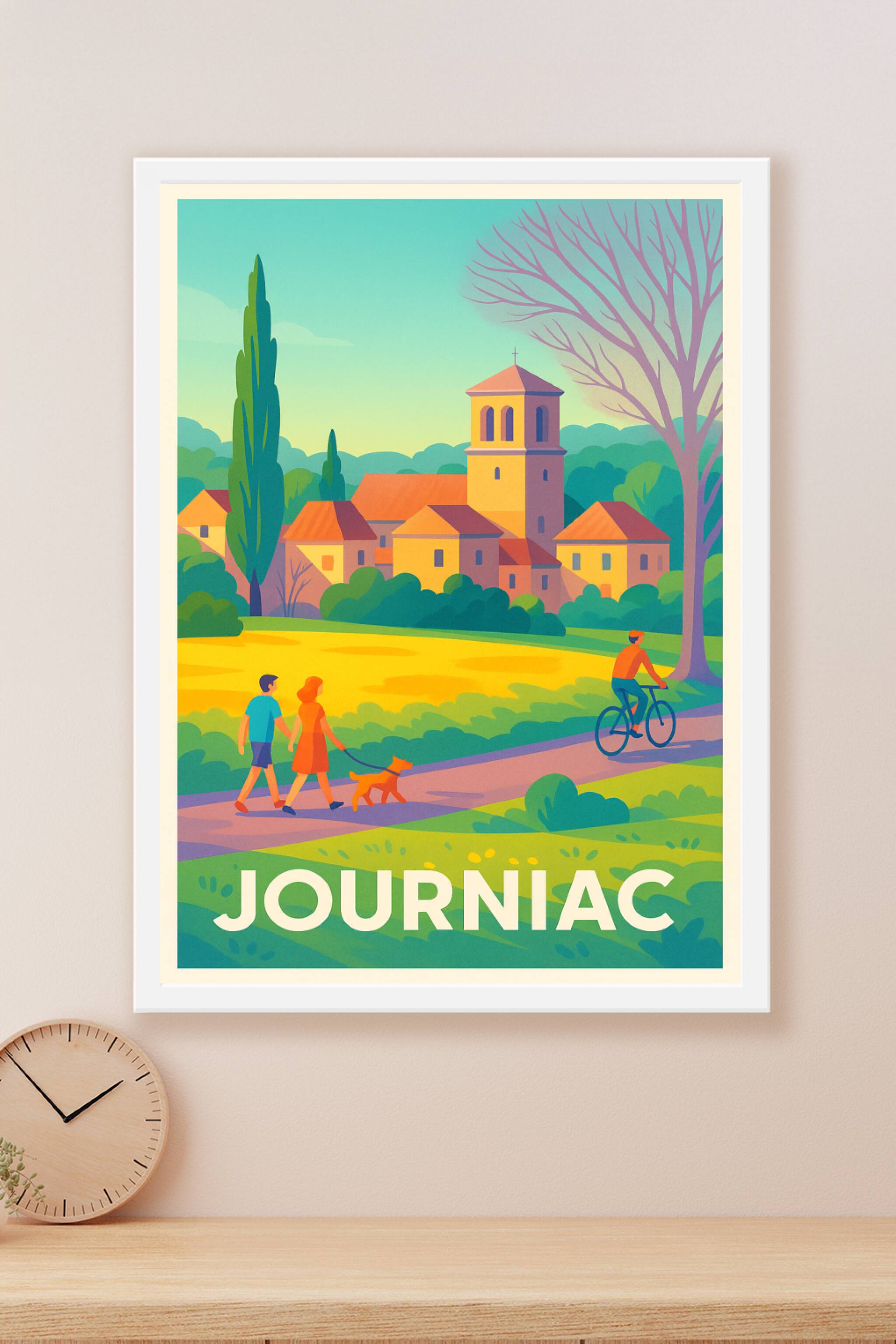 Découvrez l'atmosphère paisible et conviviale de Journiac à travers cette affiche vintage aux couleurs chaleureuses et douces. Ce poster met en lum...