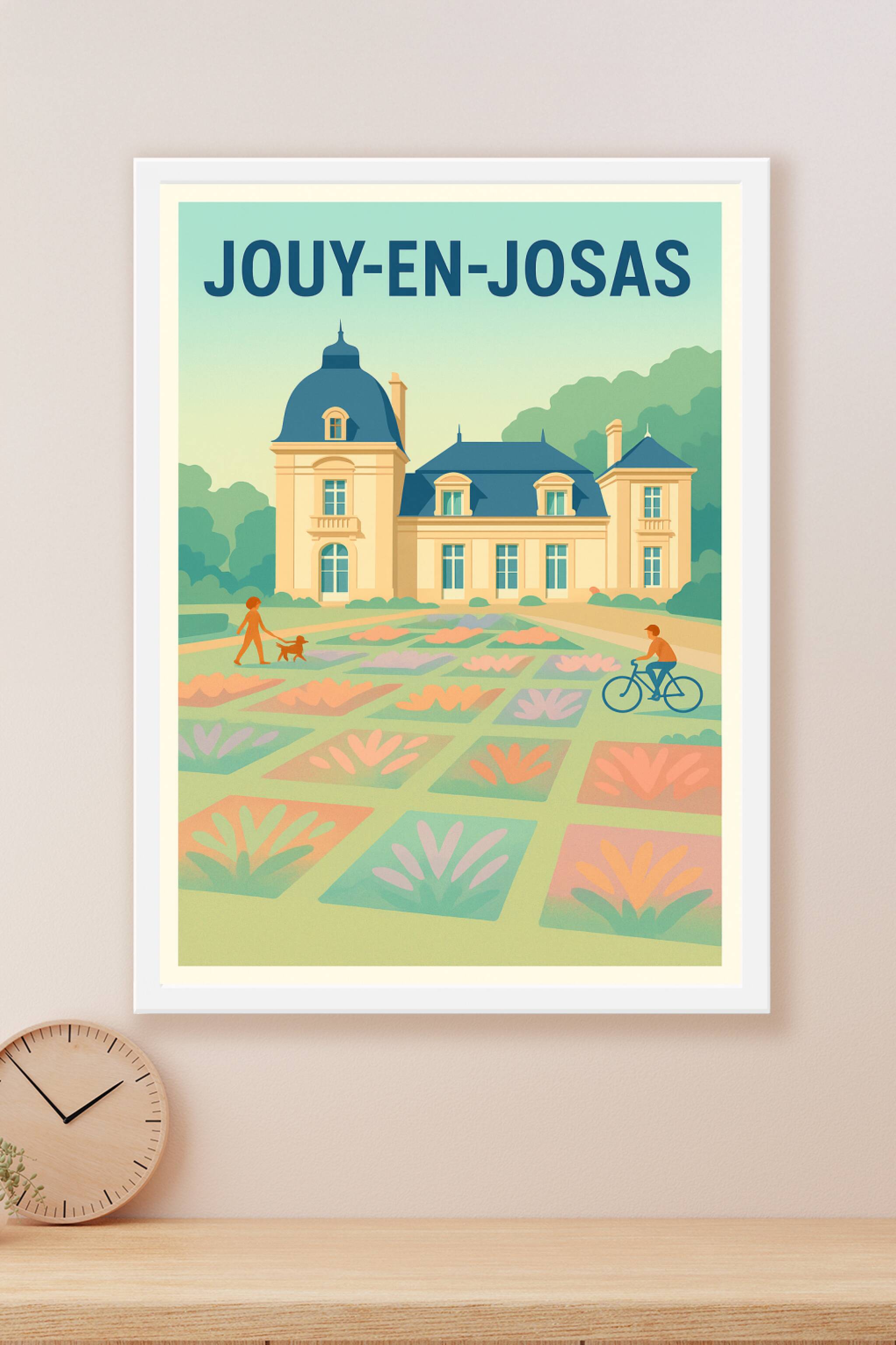 Découvrez le charme paisible de Jouy-en-Josas à travers cette magnifique affiche illustrée, où un élégant château se dresse au cœur d'un jardin har...