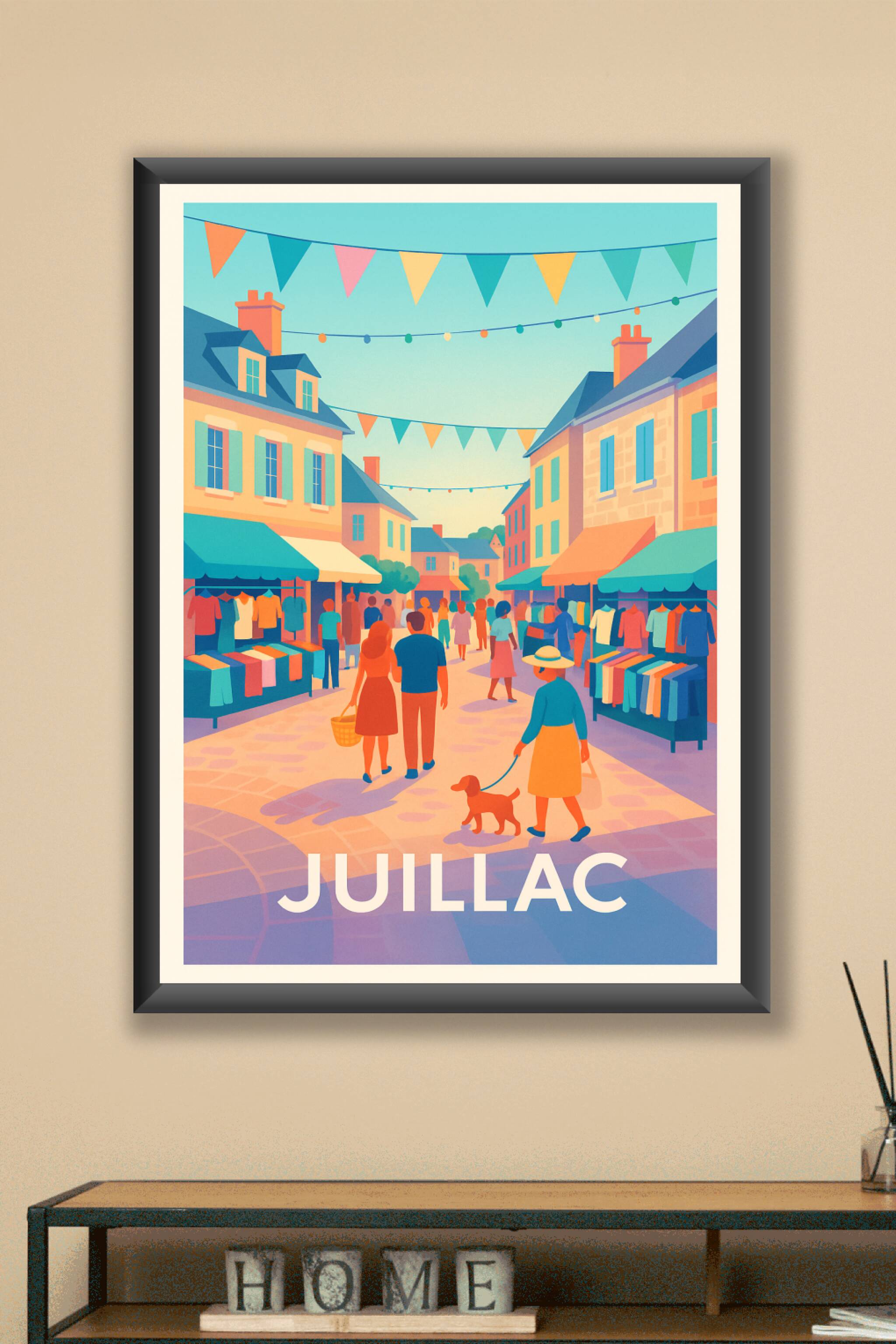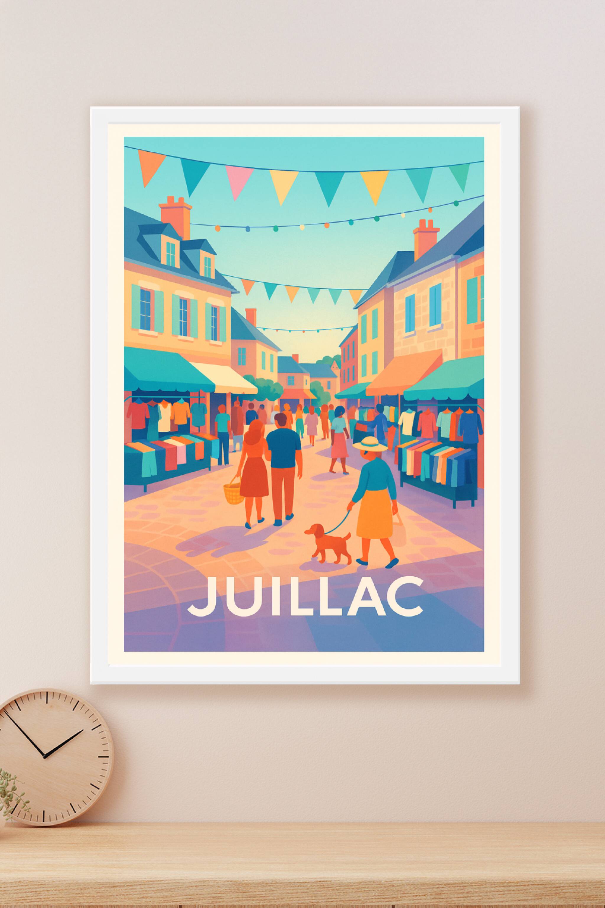 Découvrez l'esprit vivant et convivial de Juillac avec cette affiche illustrée qui capture une journée animée sur les marchés locaux, sous un ciel ...