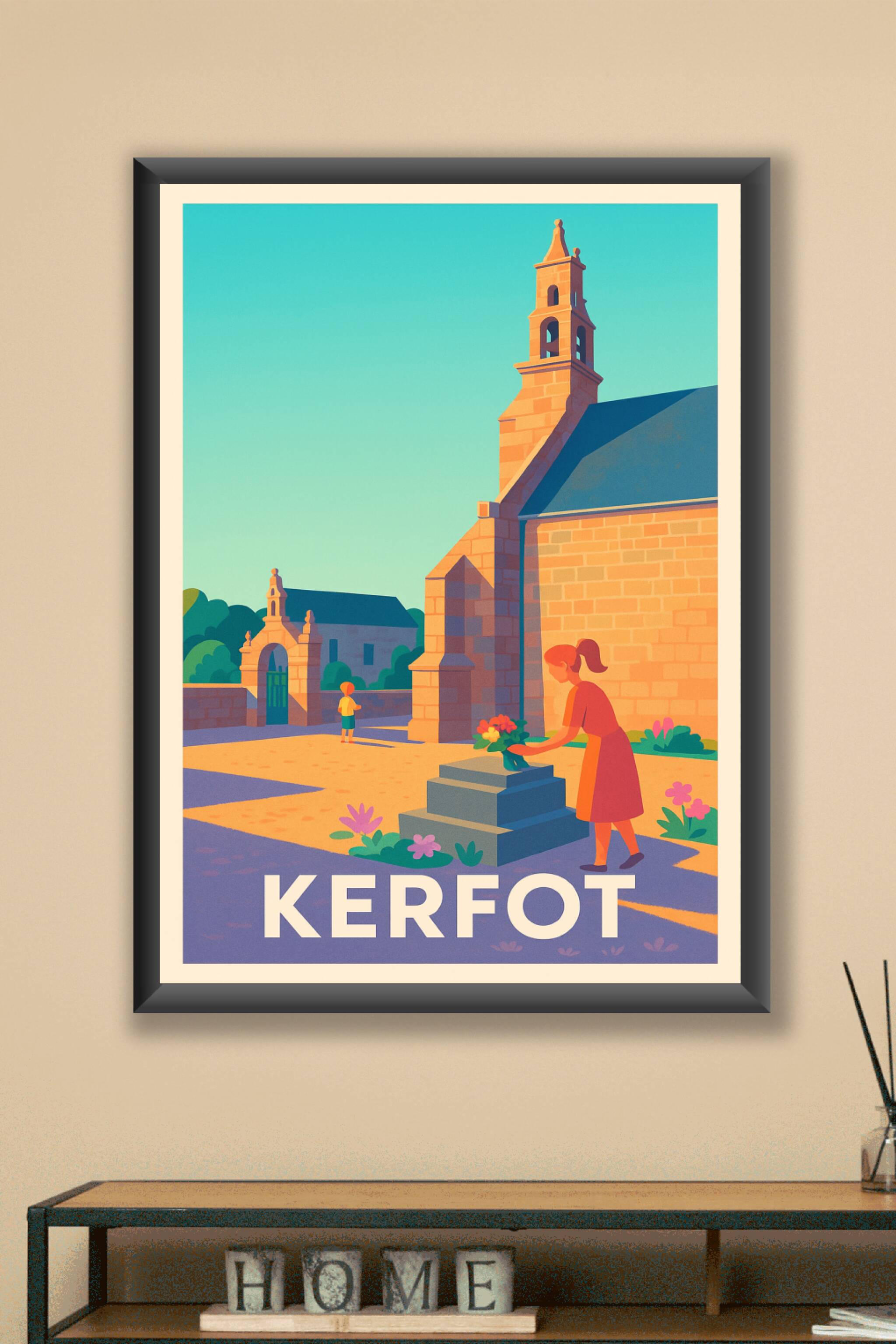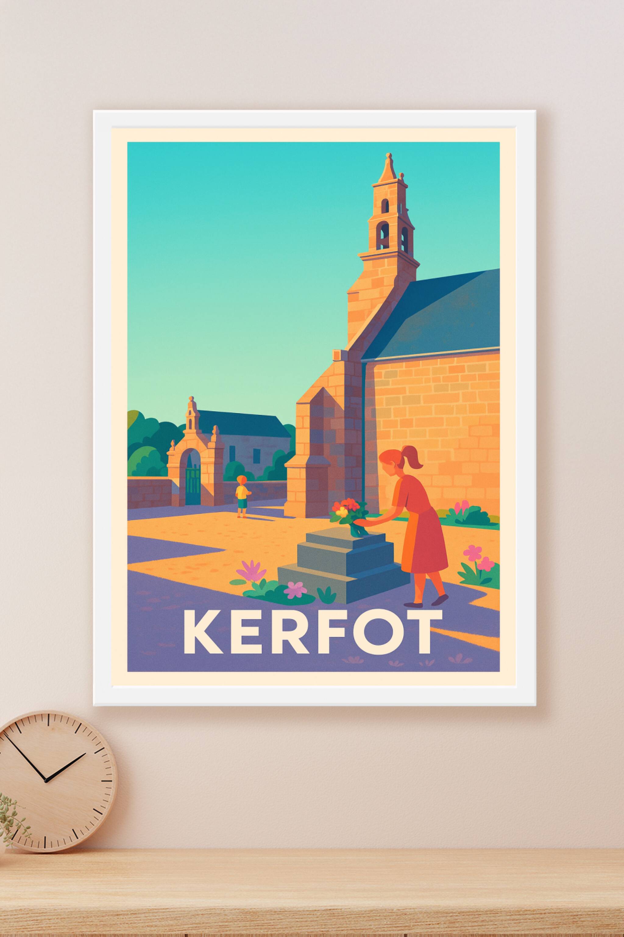 Découvrez l'atmosphère tranquille et chargée d'histoire de Kerfot avec cette affiche illustrée dans des tons chaleureux et doux. Ce poster met en l...
