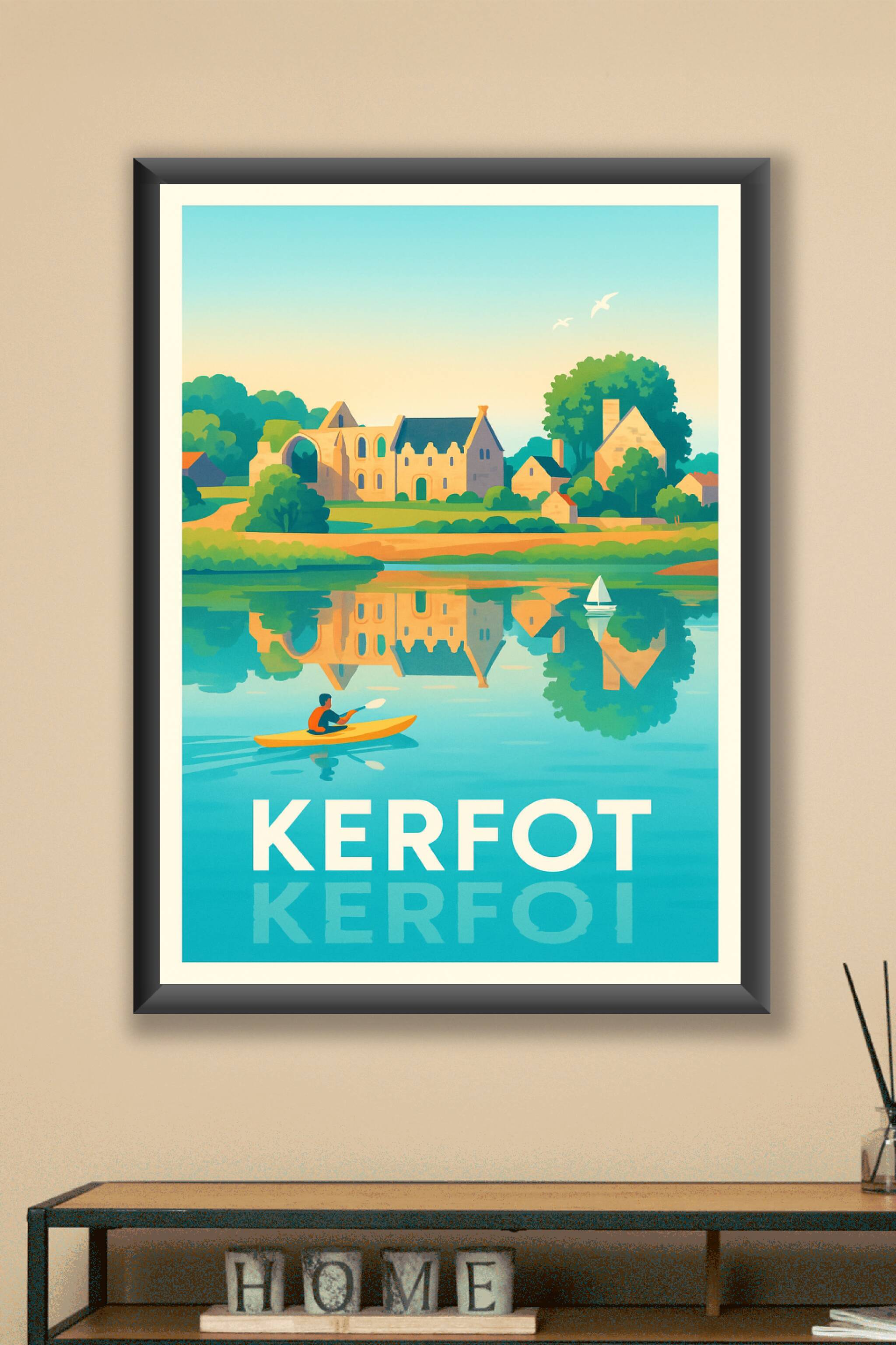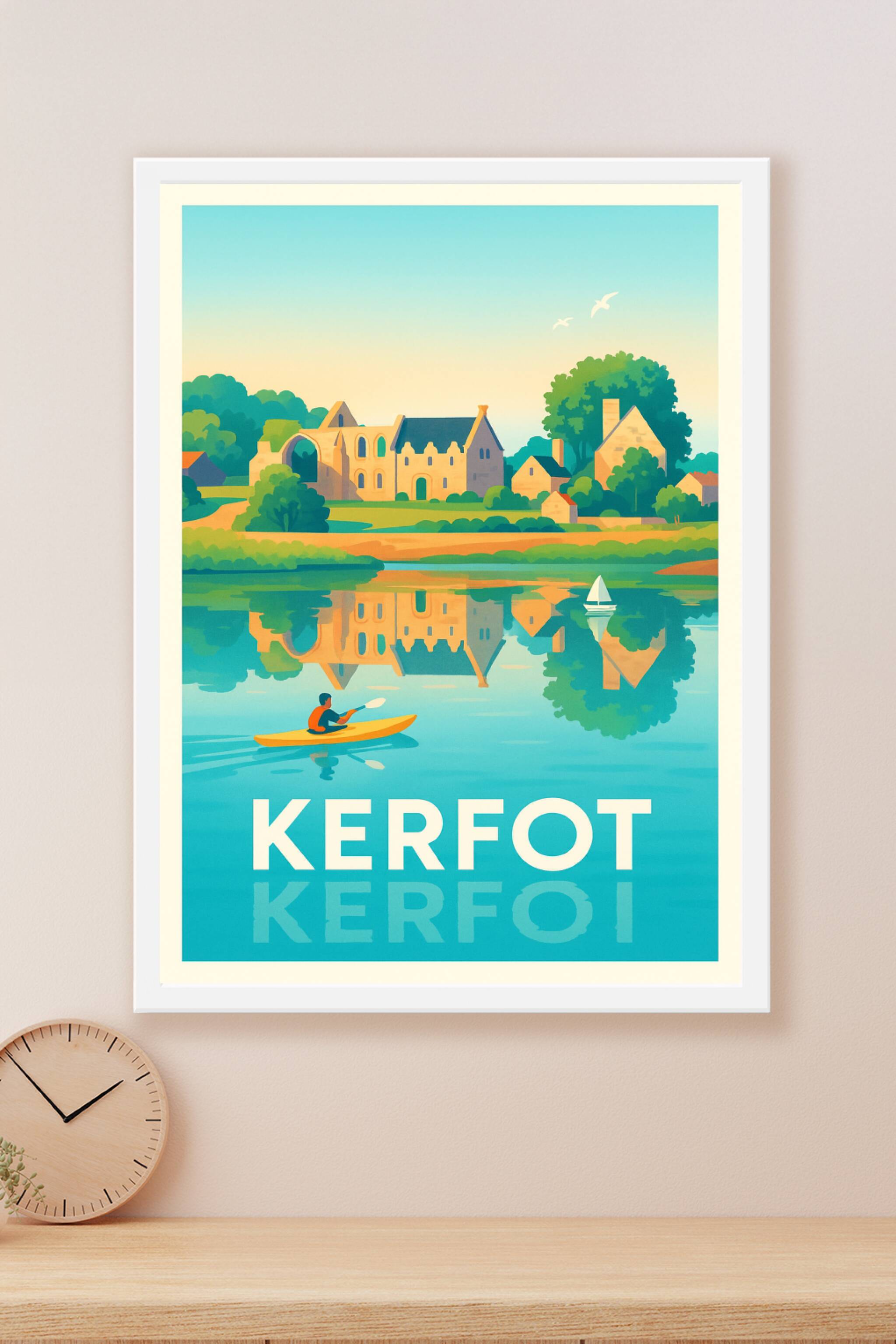 Découvrez la sérénité de Kerfot à travers cette affiches illustrée aux couleurs douces et lumineuses, mettant en scène un kayak glissant sur une ea...