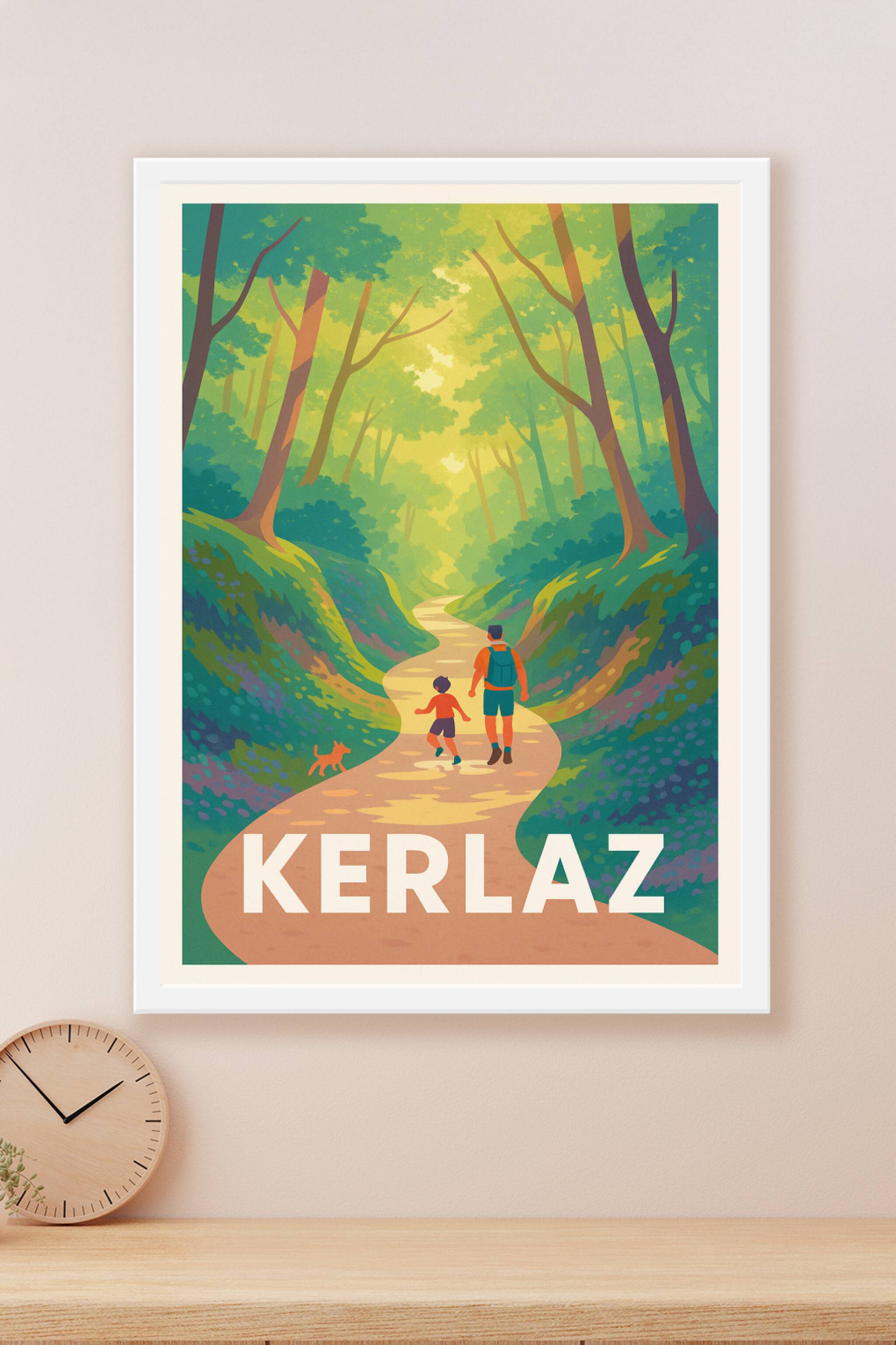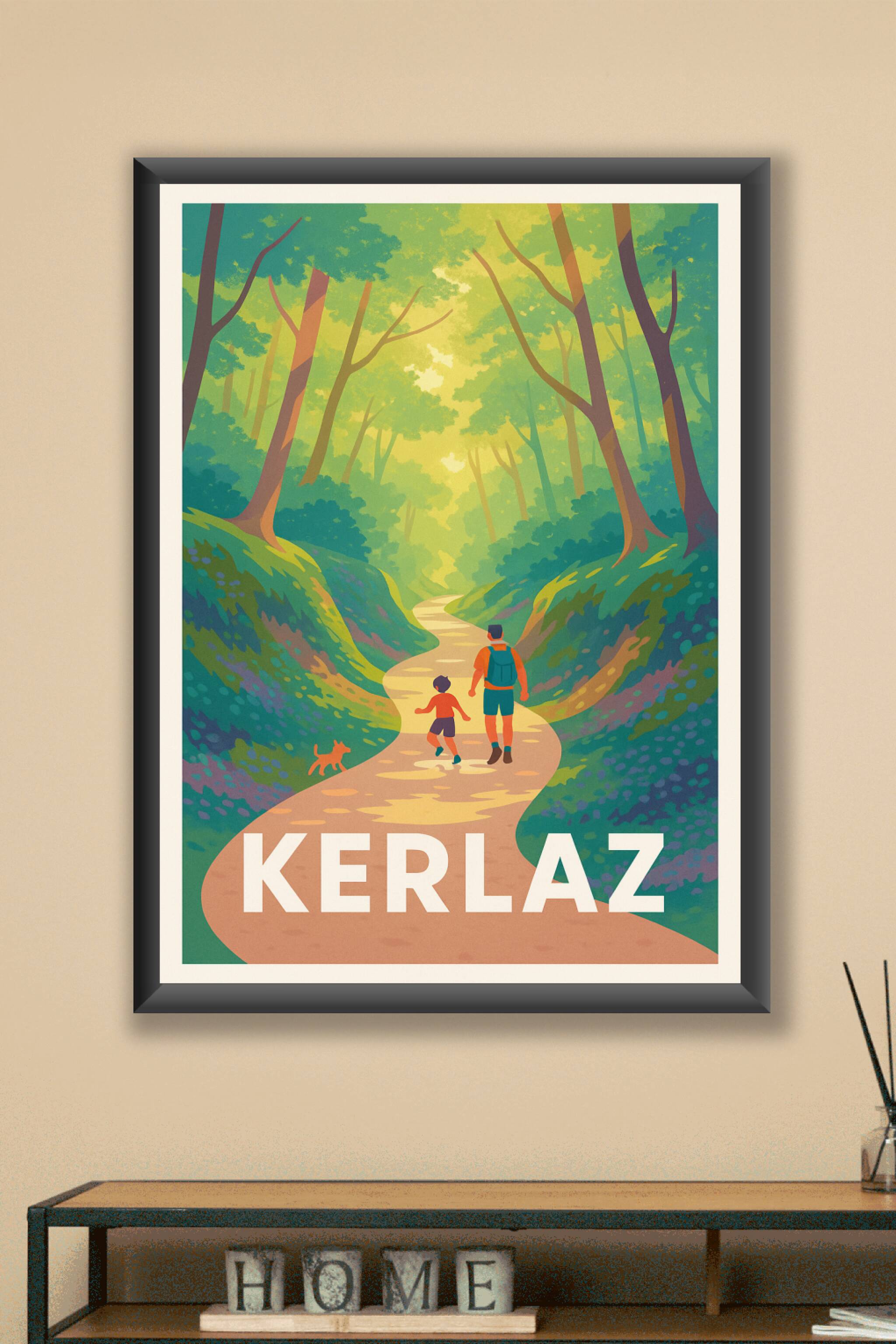 Découvrez la sérénité et la douceur de la nature bretonne avec cette affiche illustrant une promenade en forêt à Kerlaz. Un père et son enfant, acc...