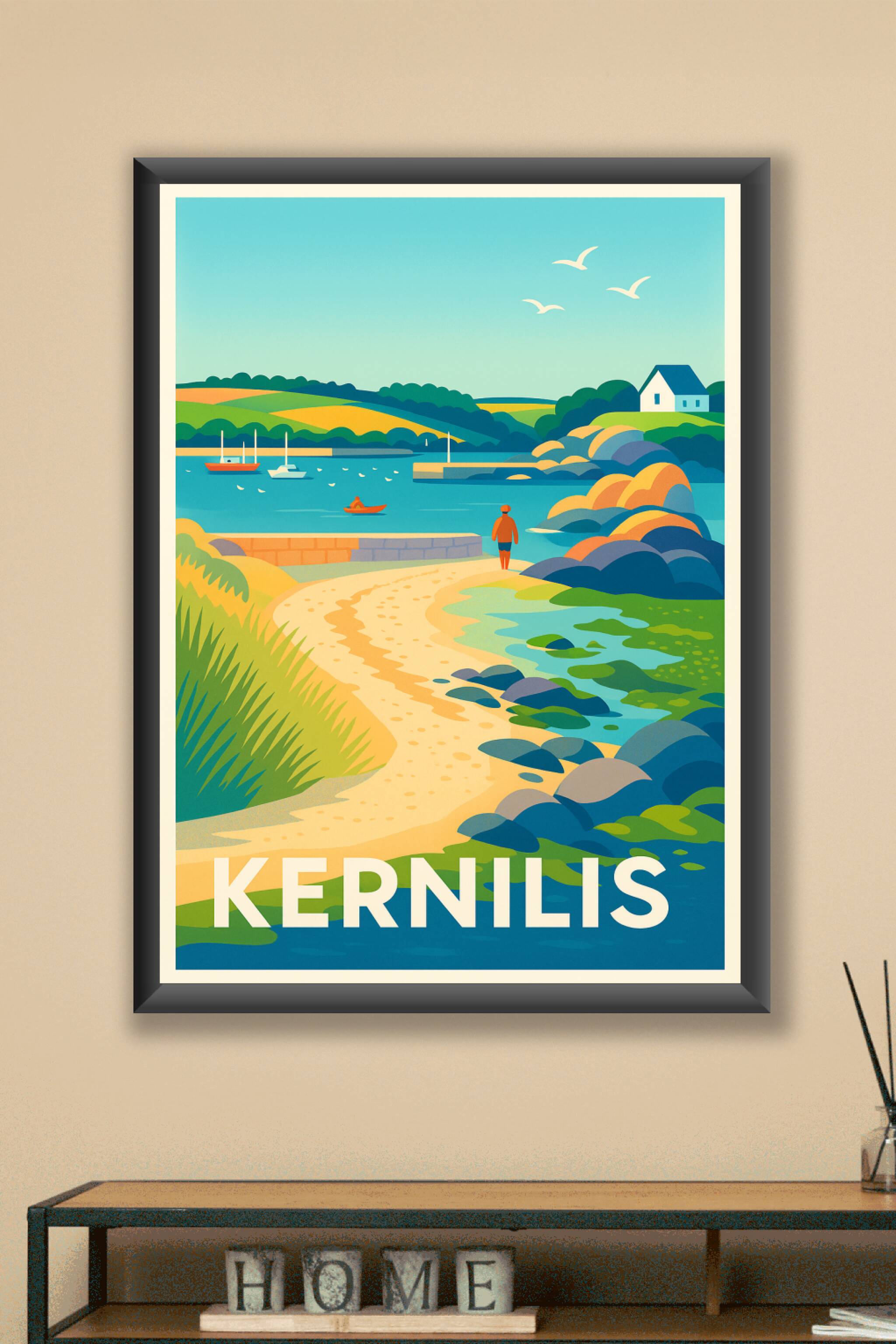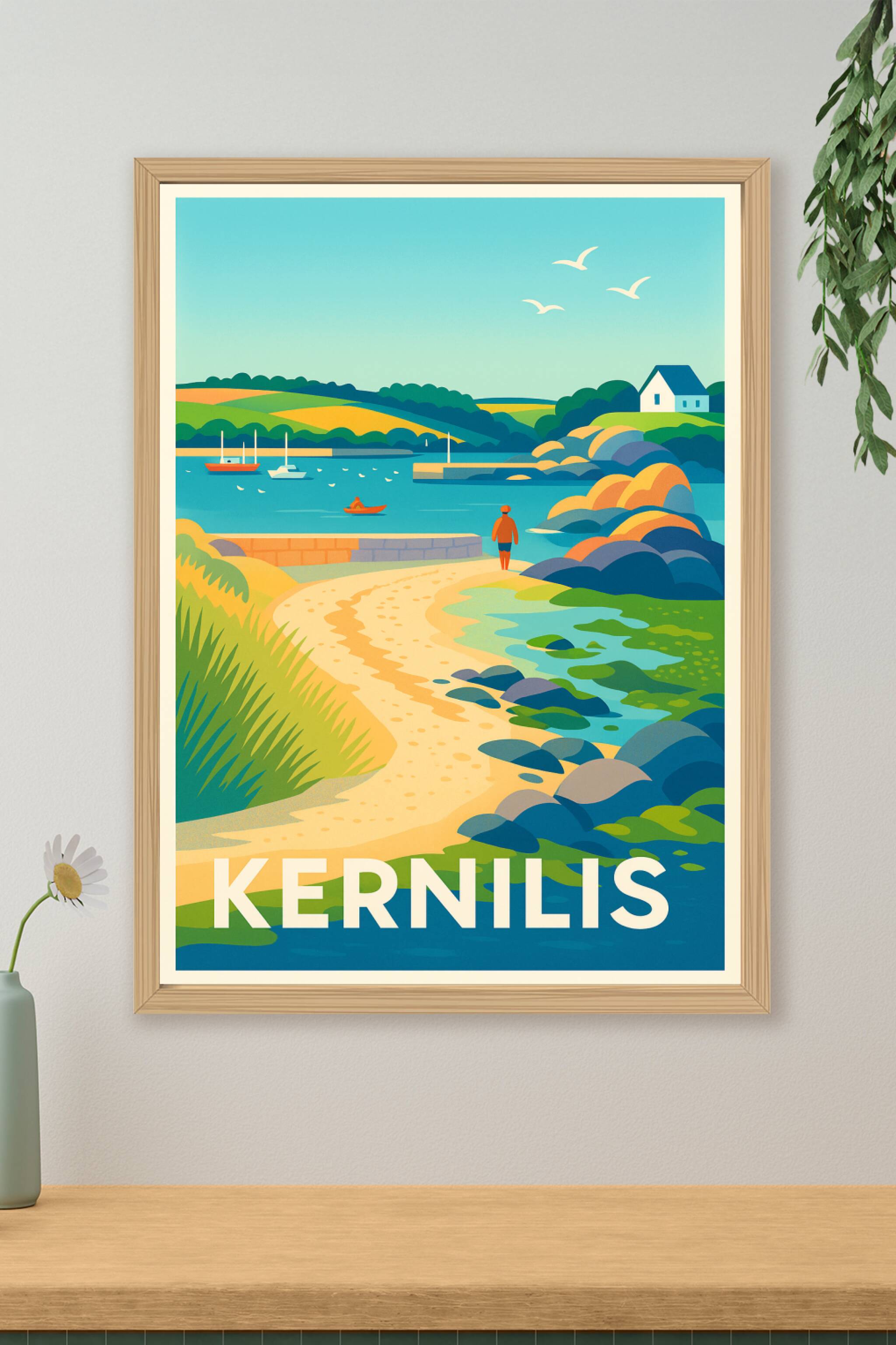 Découvrez le calme et la beauté naturelle de Kernilis avec cette affiche artistique qui capture un paysage côtier idyllique. Le poster met en valeur une promenade paisible le long de la mer, avec ses rochers colorés, ses voiliers et ses collines verdoyantes sous un ciel clair. Imprimée en tirage "Fine Art" sur un papier 305g coton, cette affiche garantit une qualité d'impression exceptionnelle, idéale pour sublimer votre intérieur ou offrir un souvenir unique. Disponible en plusieurs formats du A1 au A4, avec ou sans cadre, c'est un choix parfait pour donner vie à vos murs avec cette scène maritime authentique.