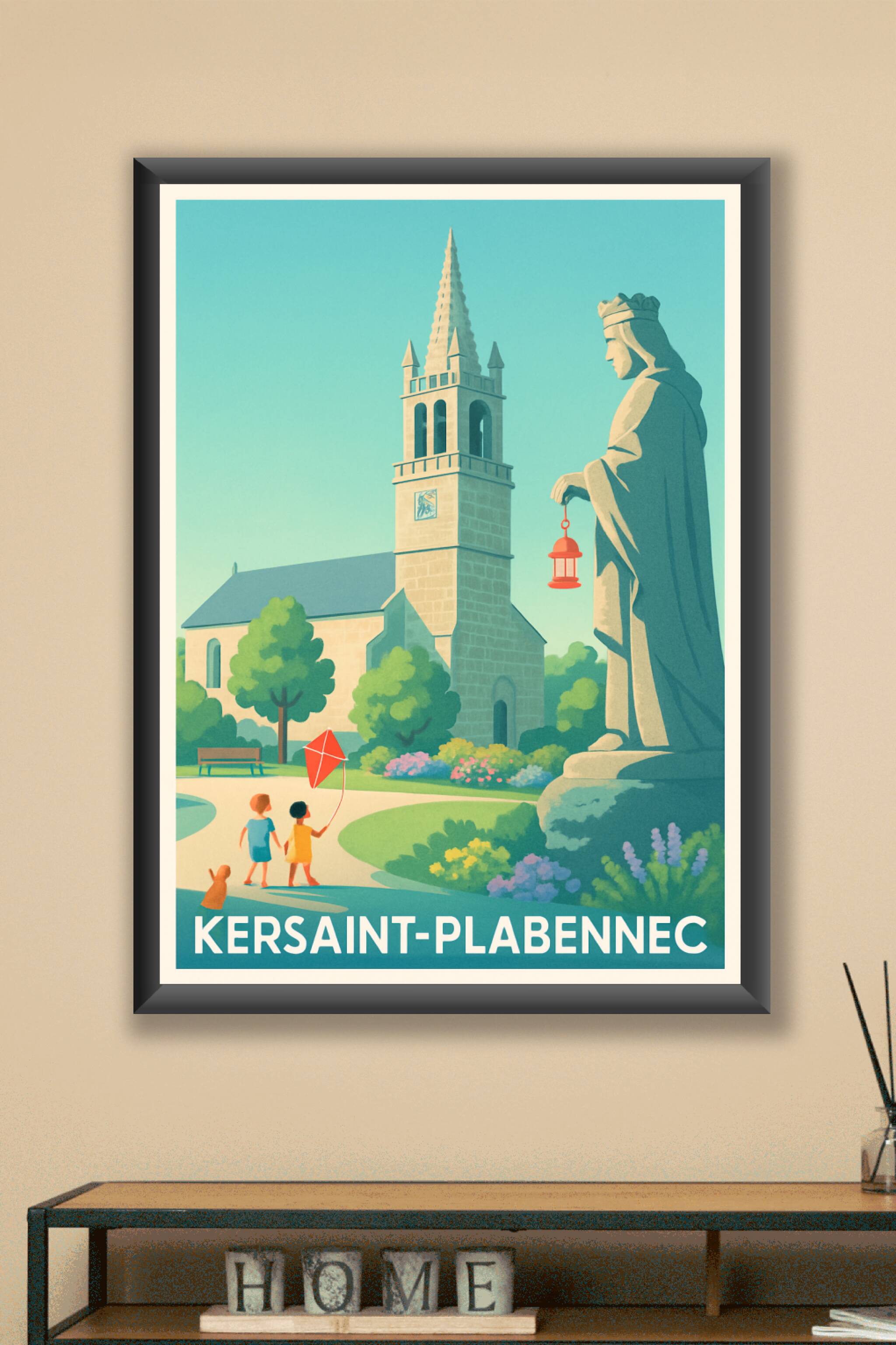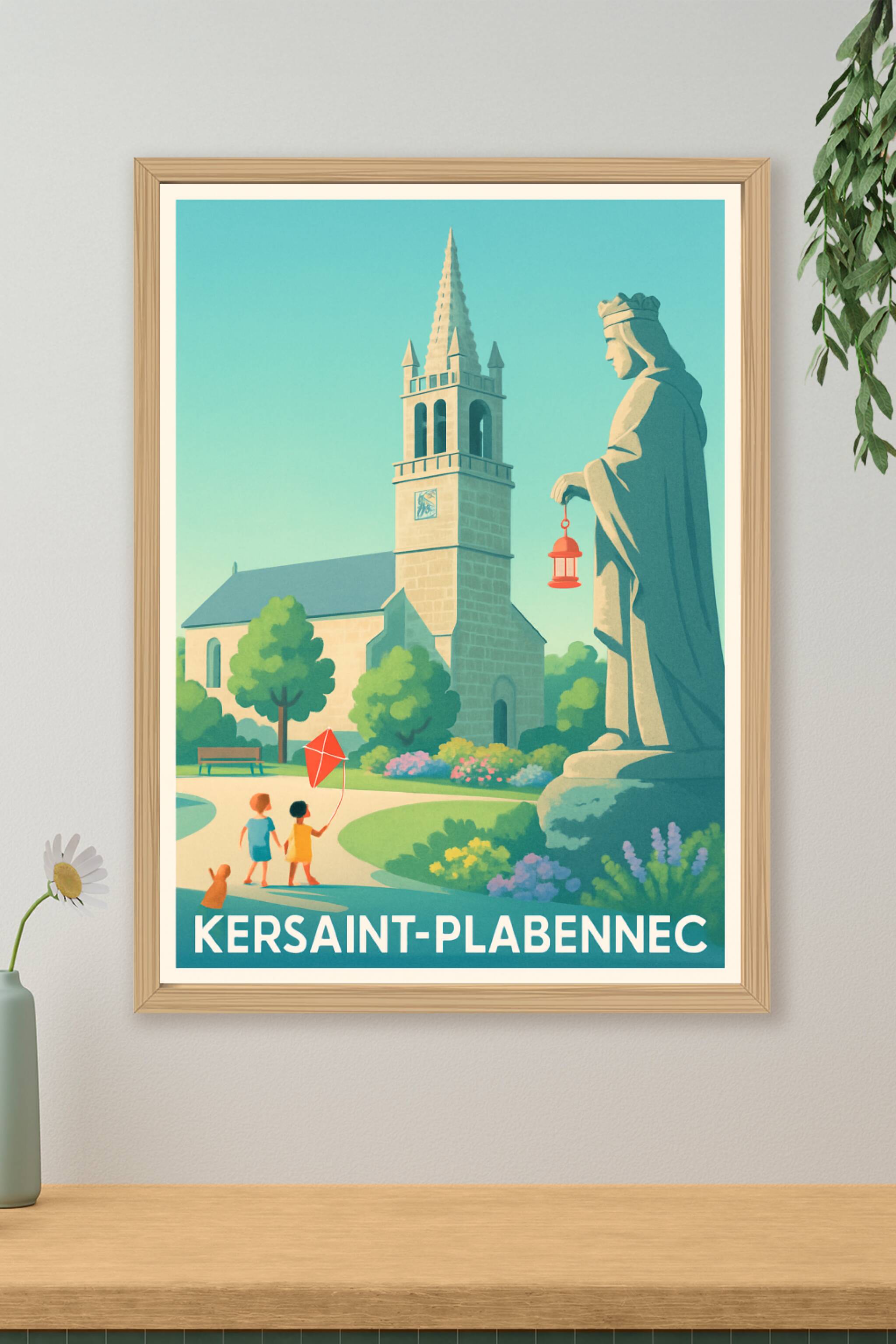 Découvrez l'authenticité et la douceur de vivre de Kersaint-Plabennec à travers cette affiche illustrée au style vintage qui met en lumière son église emblématique et la statue royale tenant une lanterne rouge. Deux enfants volant un cerf-volant dans un jardin fleuri accentuent la tranquillité de cette scène bucolique.Bien plus qu'un simple poster, cette affiche est imprimée en tirage "Fine Art" sur papier 305g coton de haute qualité, garantissant une durabilité et une netteté exceptionnelles des couleurs. Disponible en formats A1 à A4, avec ou sans cadre, elle s'adapte parfaitement à tous les intérieurs pour apporter une touche d'élégance bretonne.Profitez d'une impression premium 100% réalisée en France pour sublimer votre décoration ou offrir un souvenir unique aux passionnés de Bretagne et d'art graphique.