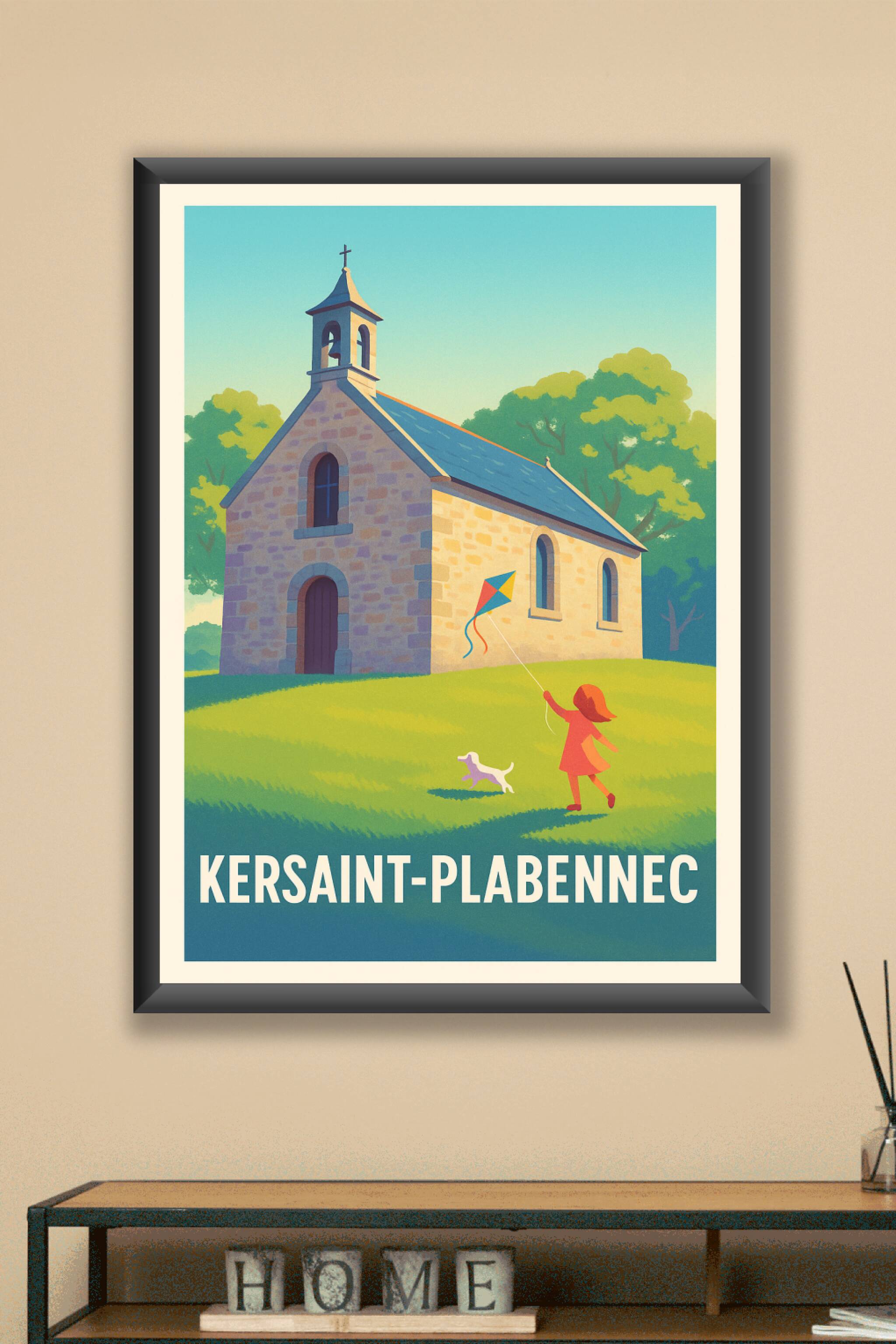 Découvrez cette affiche délicate illustrant la charmante campagne de Kersaint-Plabennec, avec sa petite chapelle en pierre baignée de lumière douce, un enfant jouant au cerf-volant accompagné d'un chien. Ce poster évoque la sérénité et la simplicité d'une journée paisible à la campagne bretonne. Imprimée en tirage "Fine Art" sur un papier coton 305g, cette affiche offre une qualité d'impression exceptionnelle et des couleurs vibrantes, pour une décoration intérieure chaleureuse et authentique. Disponible en formats A1 à A4, avec ou sans cadre, elle s'adapte à tous les espaces, que ce soit pour sublimer votre salon ou comme cadeau raffiné pour les amoureux des paysages bretons.
