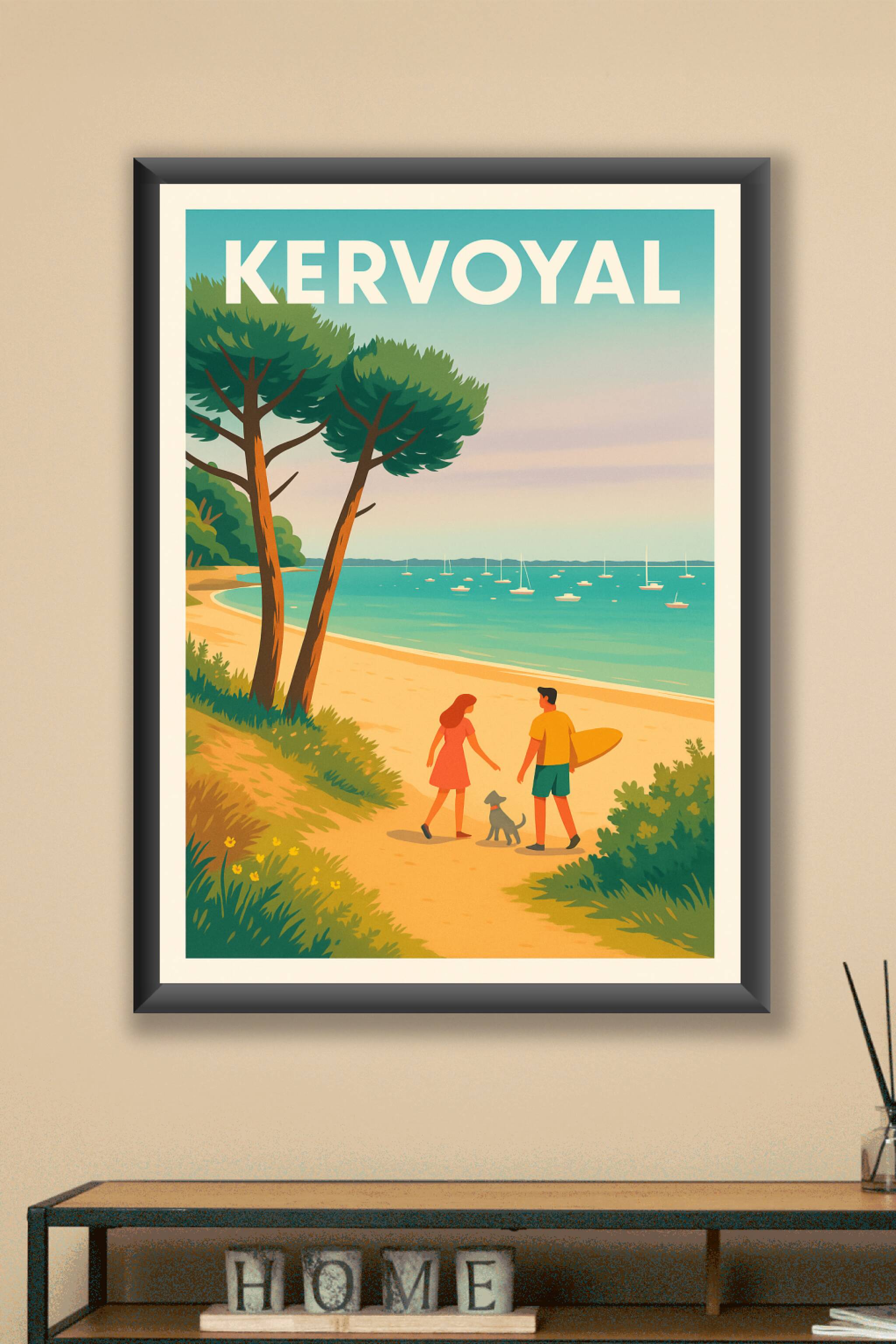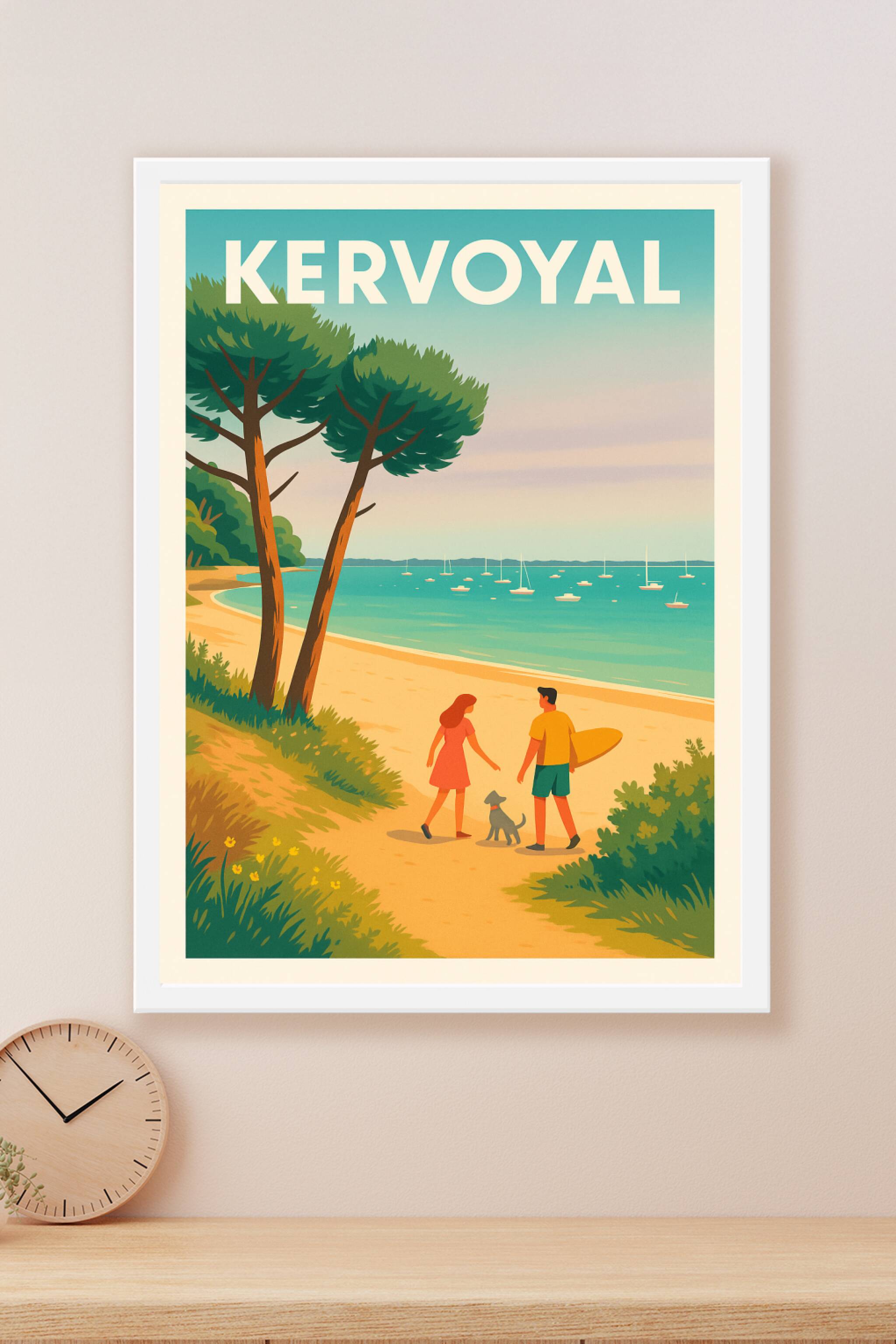 Découvrez la sérénité de Kervoyal avec cette affiche illustrée qui capture une promenade paisible au bord de la plage, entourée de pins et d'une me...