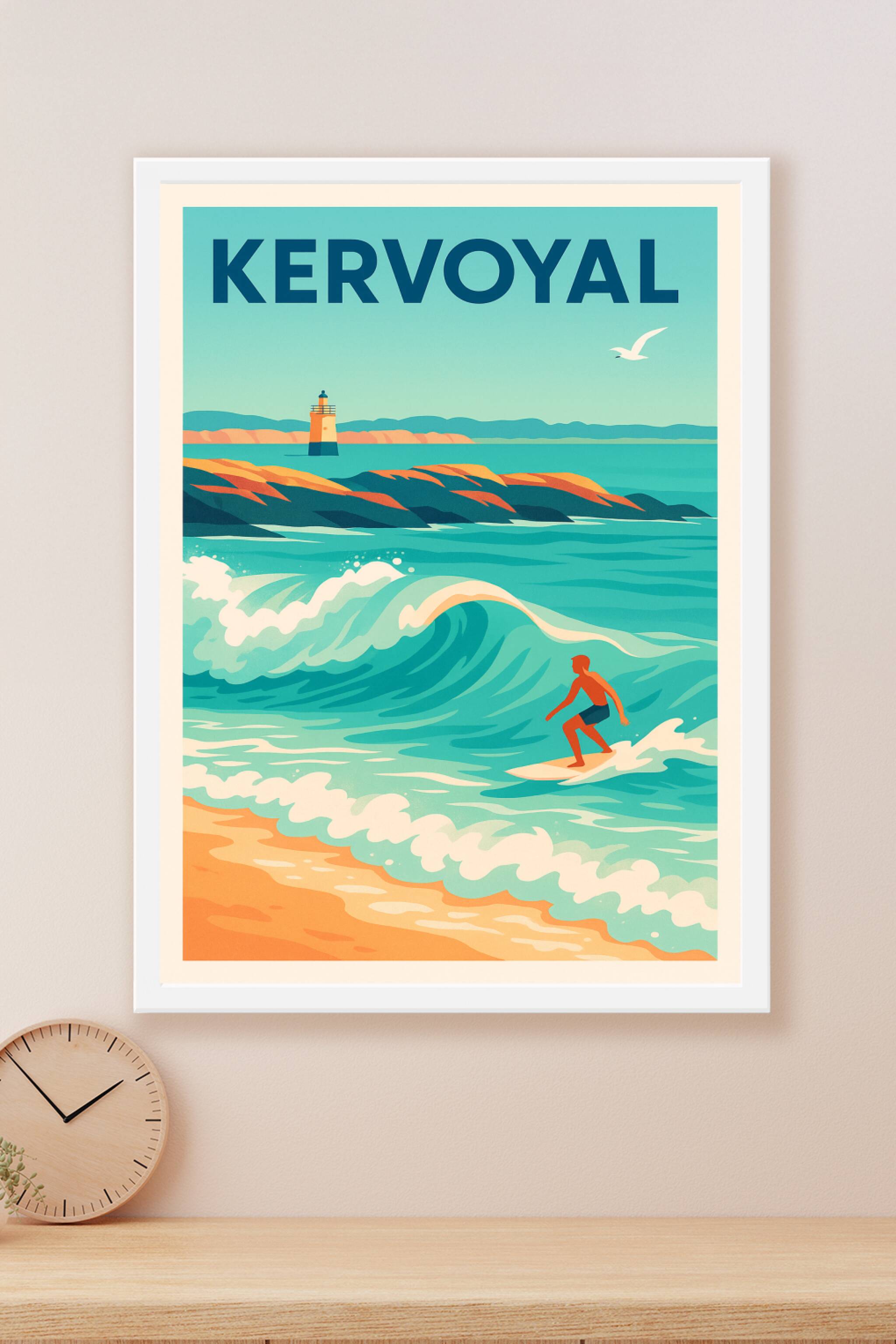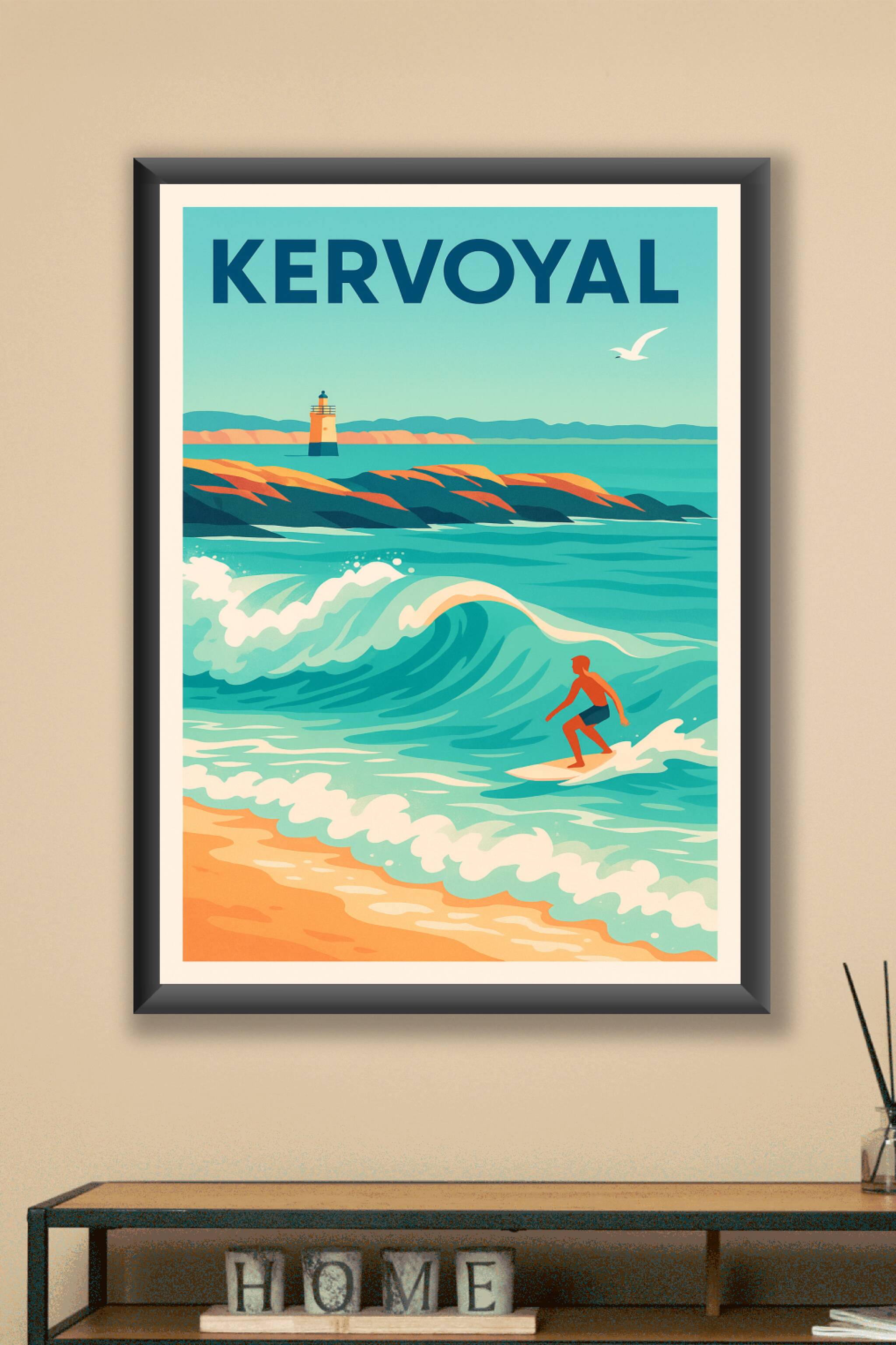 Découvrez l'ambiance vivifiante de Kervoyal avec cette affiche vintage mettant en scène un surfeur domptant les vagues turquoise, face à un phare e...