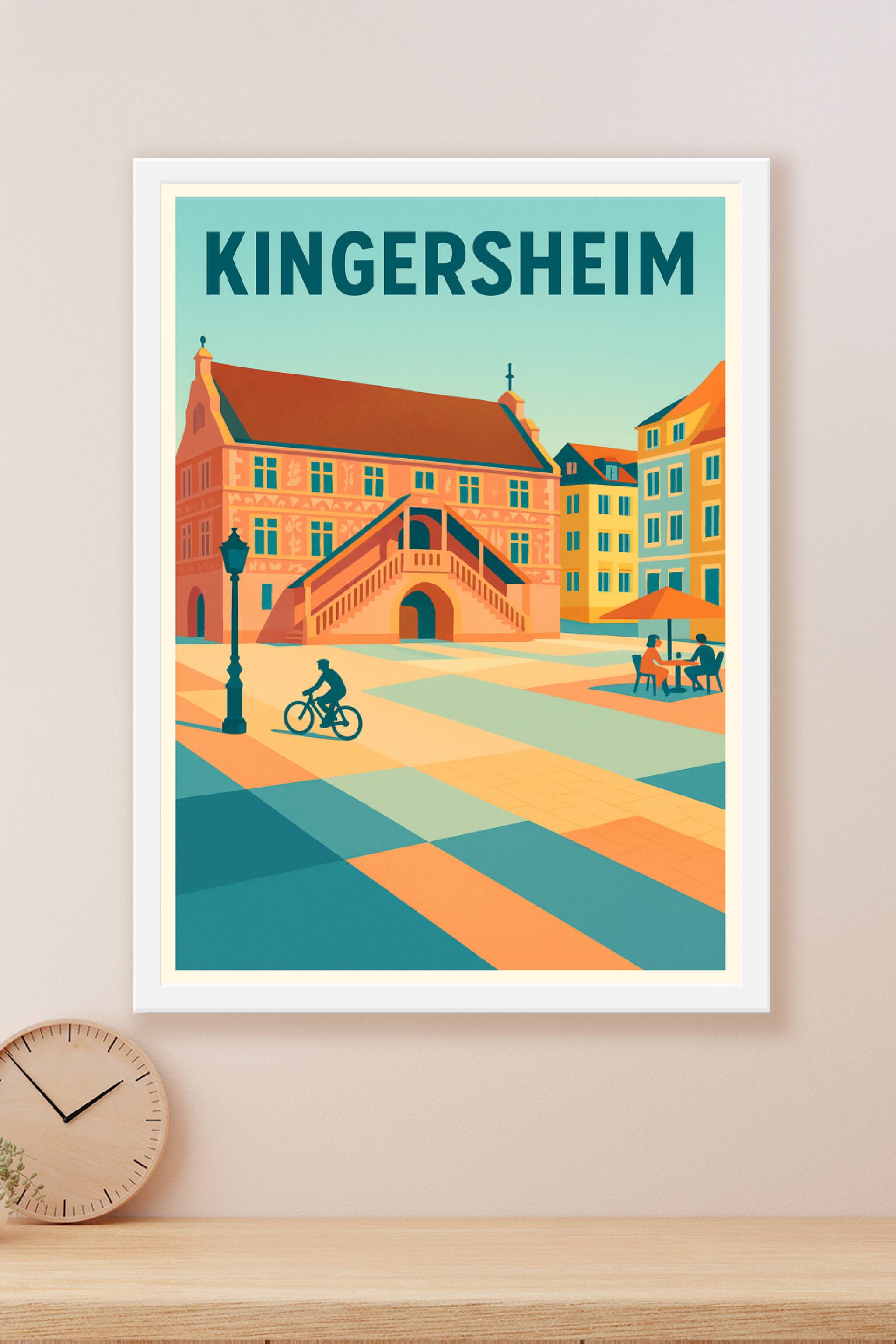 Découvrez le charme unique de Kingersheim à travers cette affiche illustrée au style rétro moderne. L'image met en valeur la magnifique architectur...
