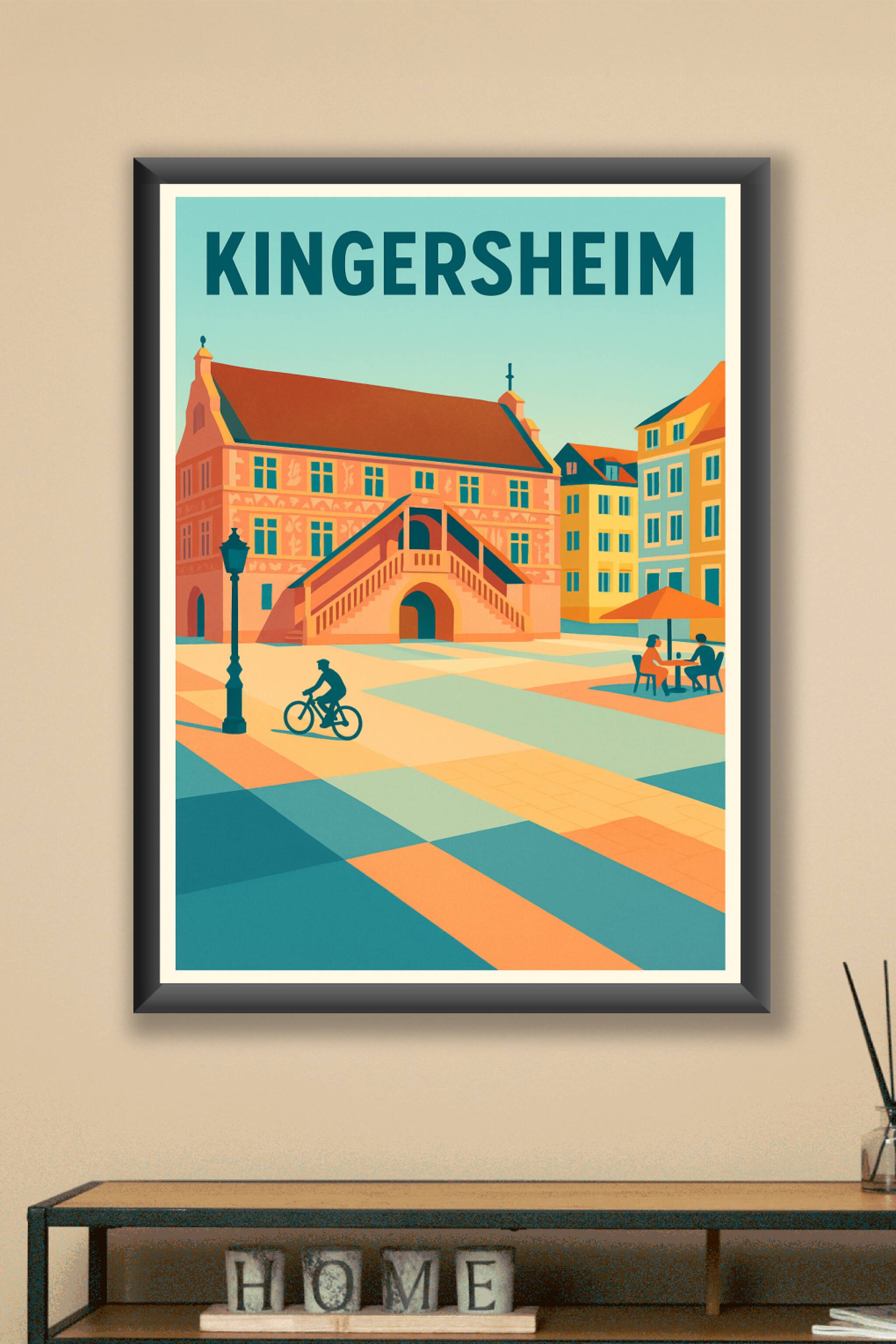 Découvrez le charme unique de Kingersheim à travers cette affiche illustrée au style rétro moderne. L'image met en valeur la magnifique architecture locale et l'ambiance paisible d'une place animée, où un cycliste et des promeneurs profitent du cadre. Ce poster est imprimé en tirage "Fine Art" sur un papier de qualité 305g coton, garantissant des couleurs vives et une finition premium. Disponible en plusieurs formats de A1 à A4, avec ou sans cadre, cette affiche apportera une touche d'élégance et de convivialité à votre intérieur. Chaque tirage est produit avec soin en France, pour une décoration authentique et raffinée.