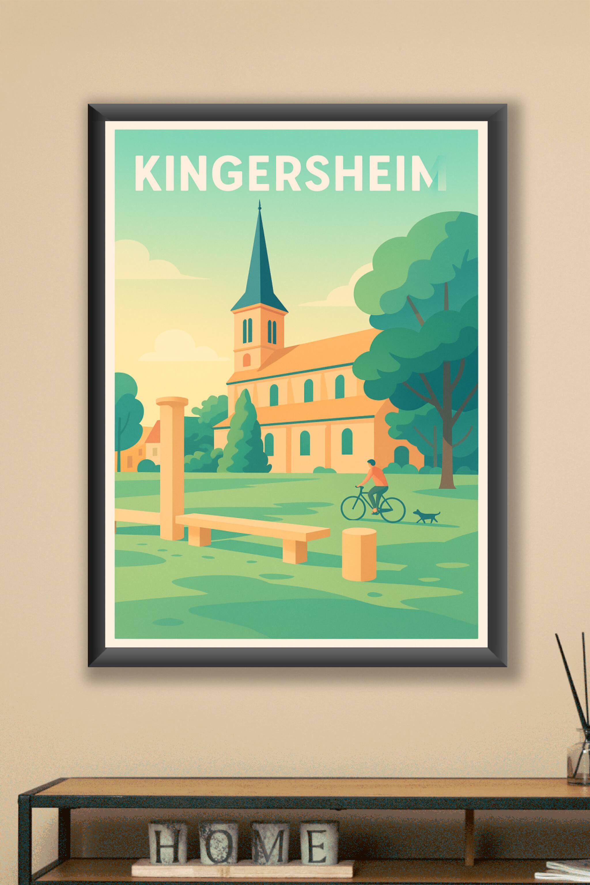 Découvrez cette affiche illustrée qui capture la douceur de vivre à Kingersheim, entre architecture traditionnelle et espaces verts apaisants. La s...