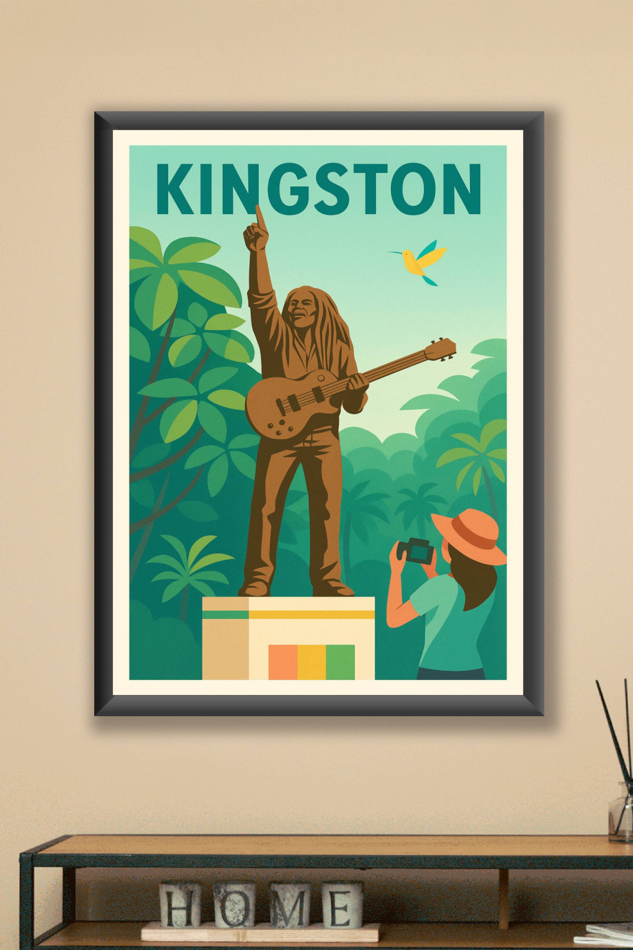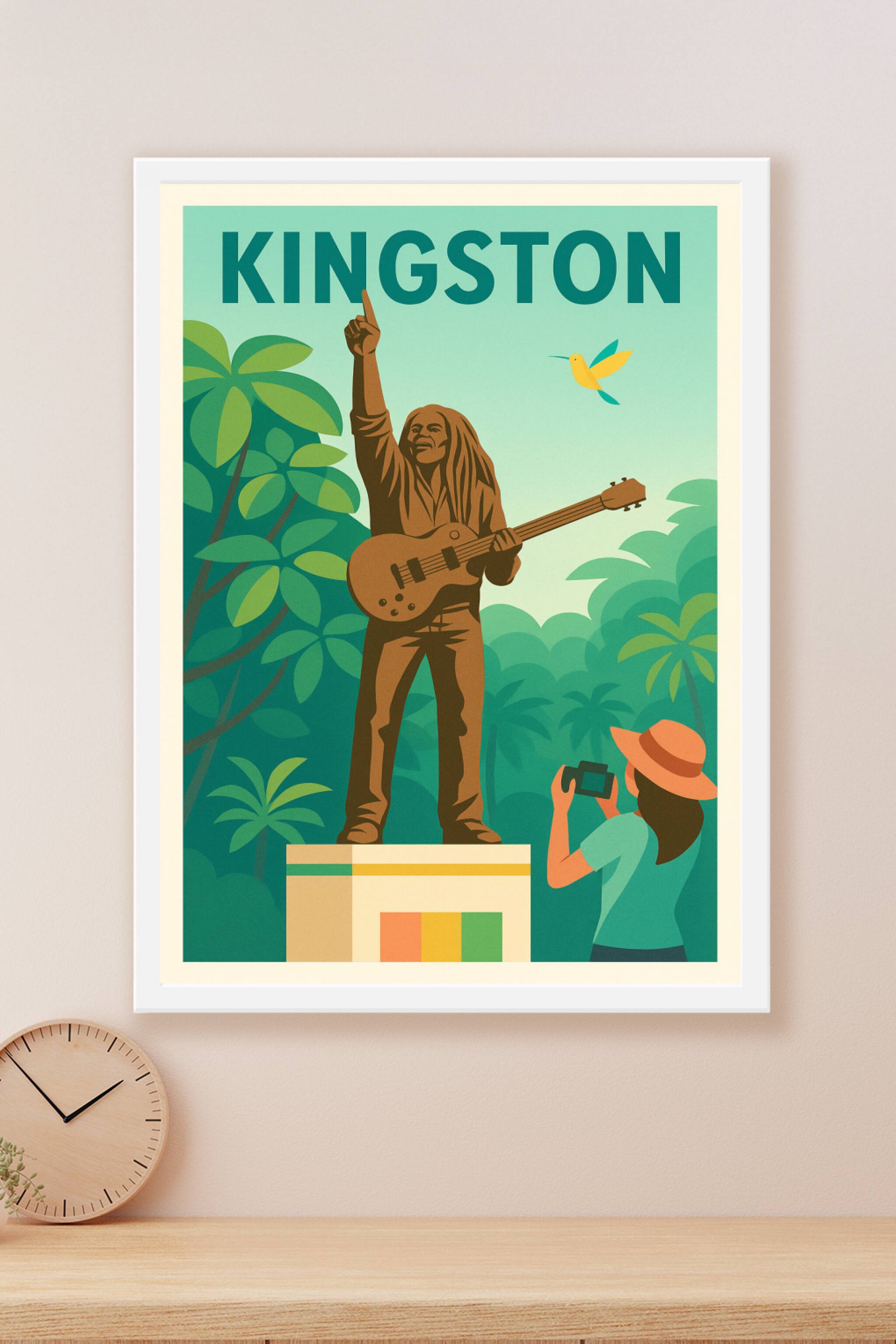 Découvrez l'âme vibrante de Kingston à travers cette affiche illustrée représentant la statue emblématique de Bob Marley, icône mondiale du reggae,...