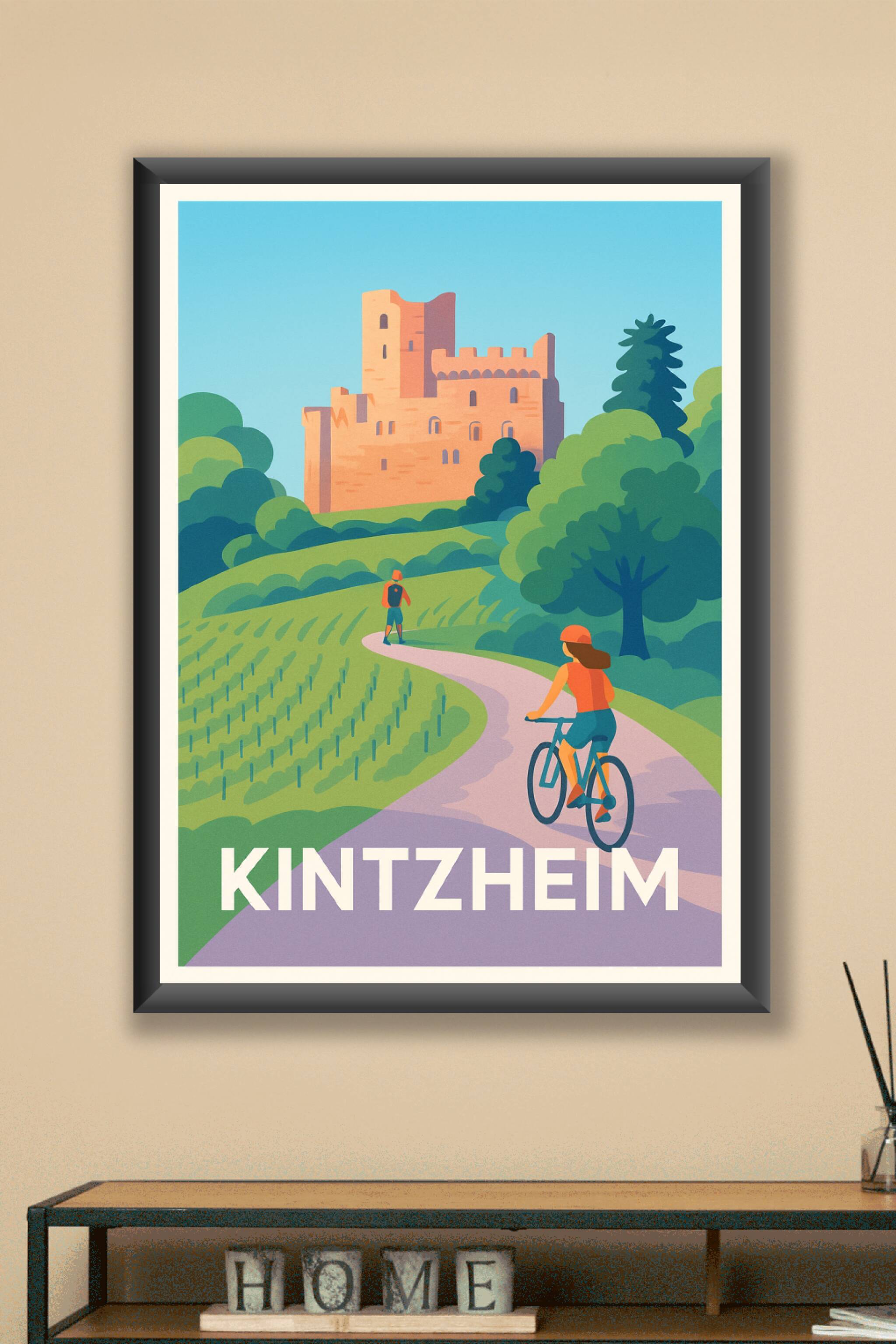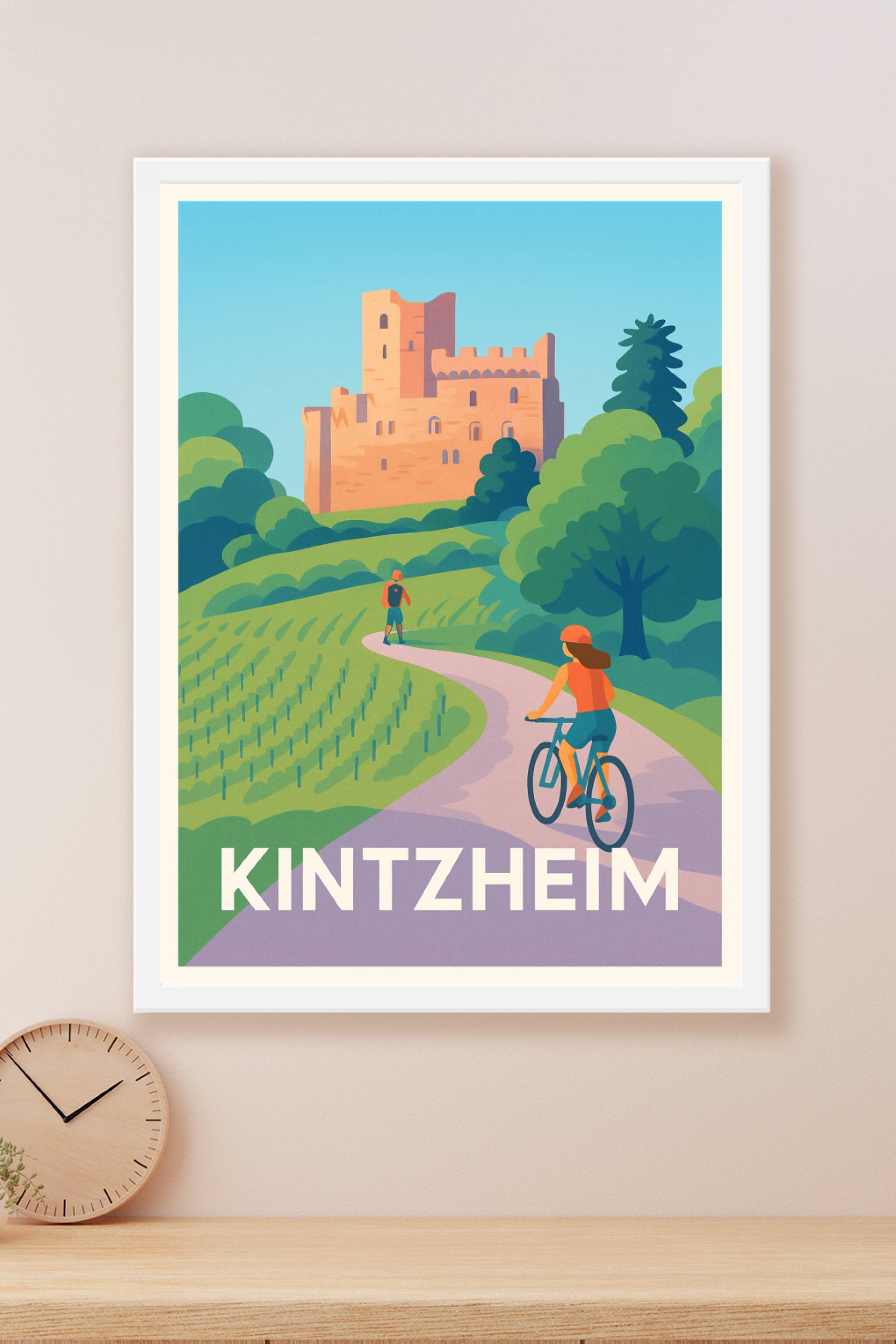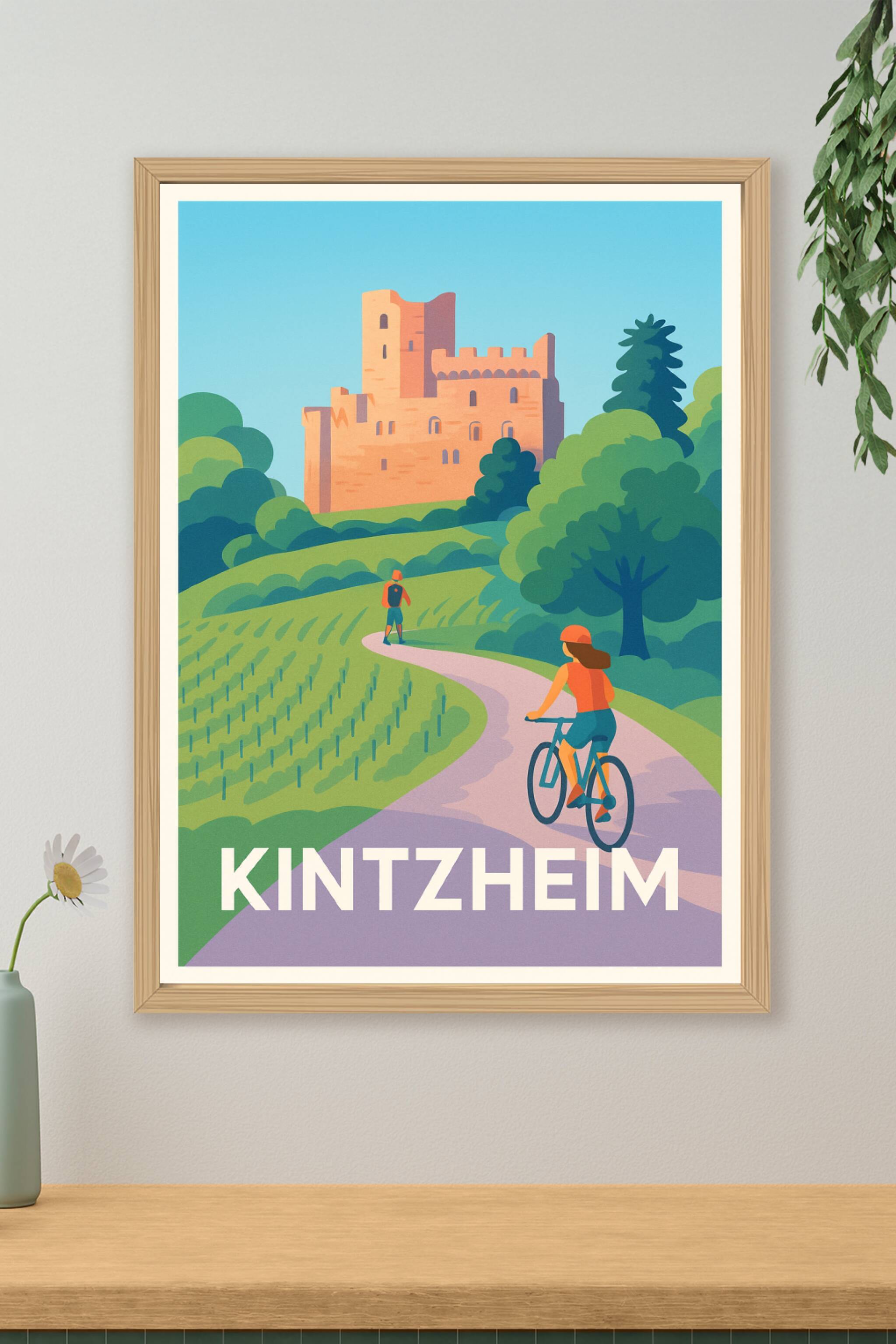 Laissez-vous transporter au cœur des paysages verdoyants de Kintzheim avec cette affiche illustrée mettant en scène un château médiéval majestueux....