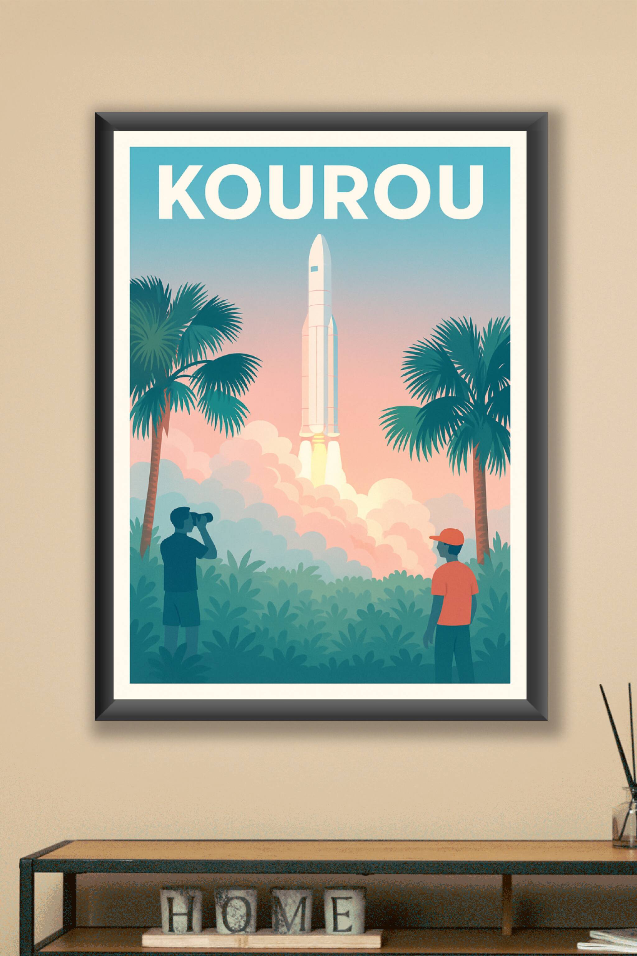 Plongez dans l'univers fascinant de Kourou avec cette affiche évoquant le célèbre centre spatial. Ce poster, aux tons doux et rêveurs, met en scène...