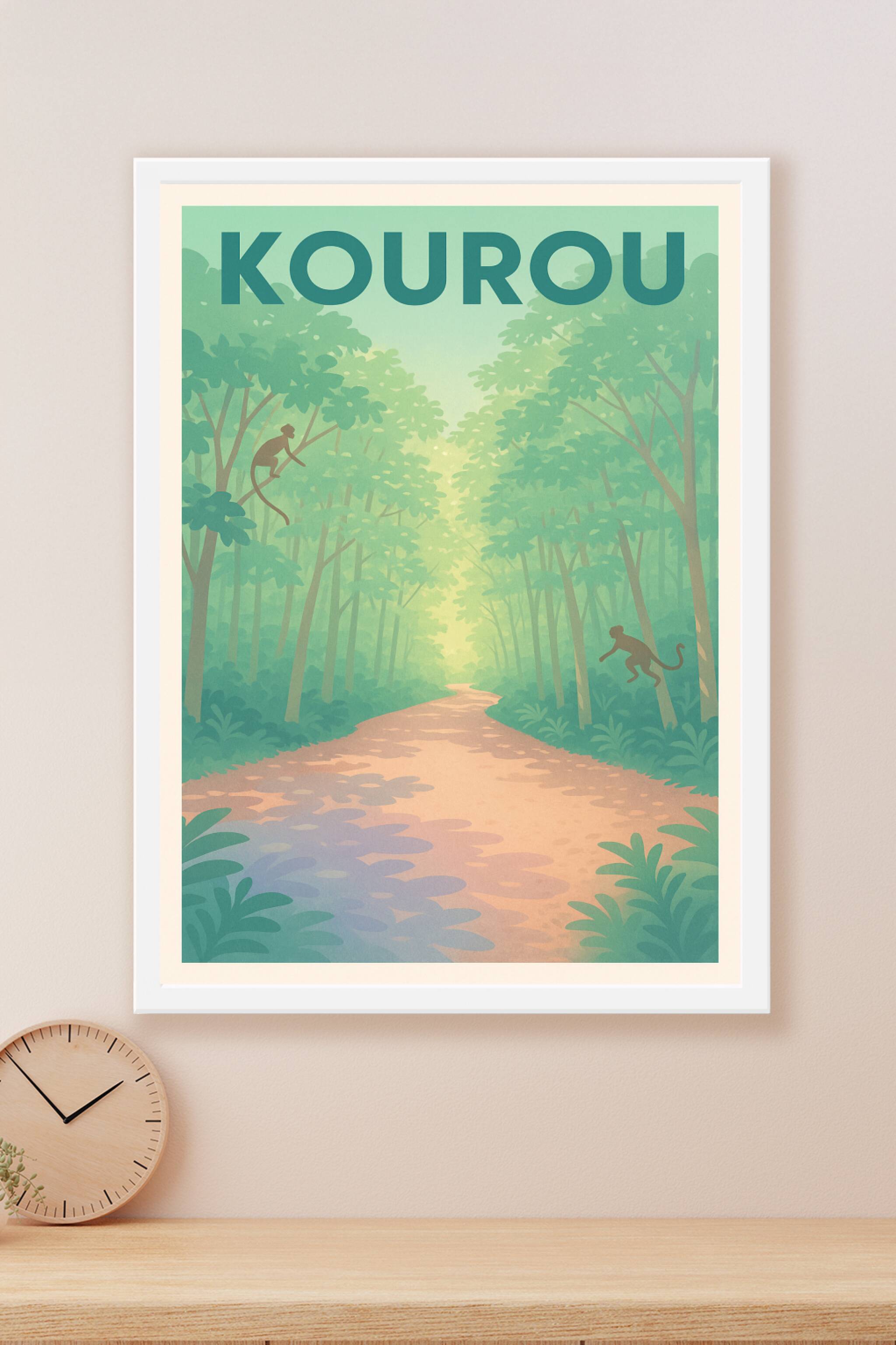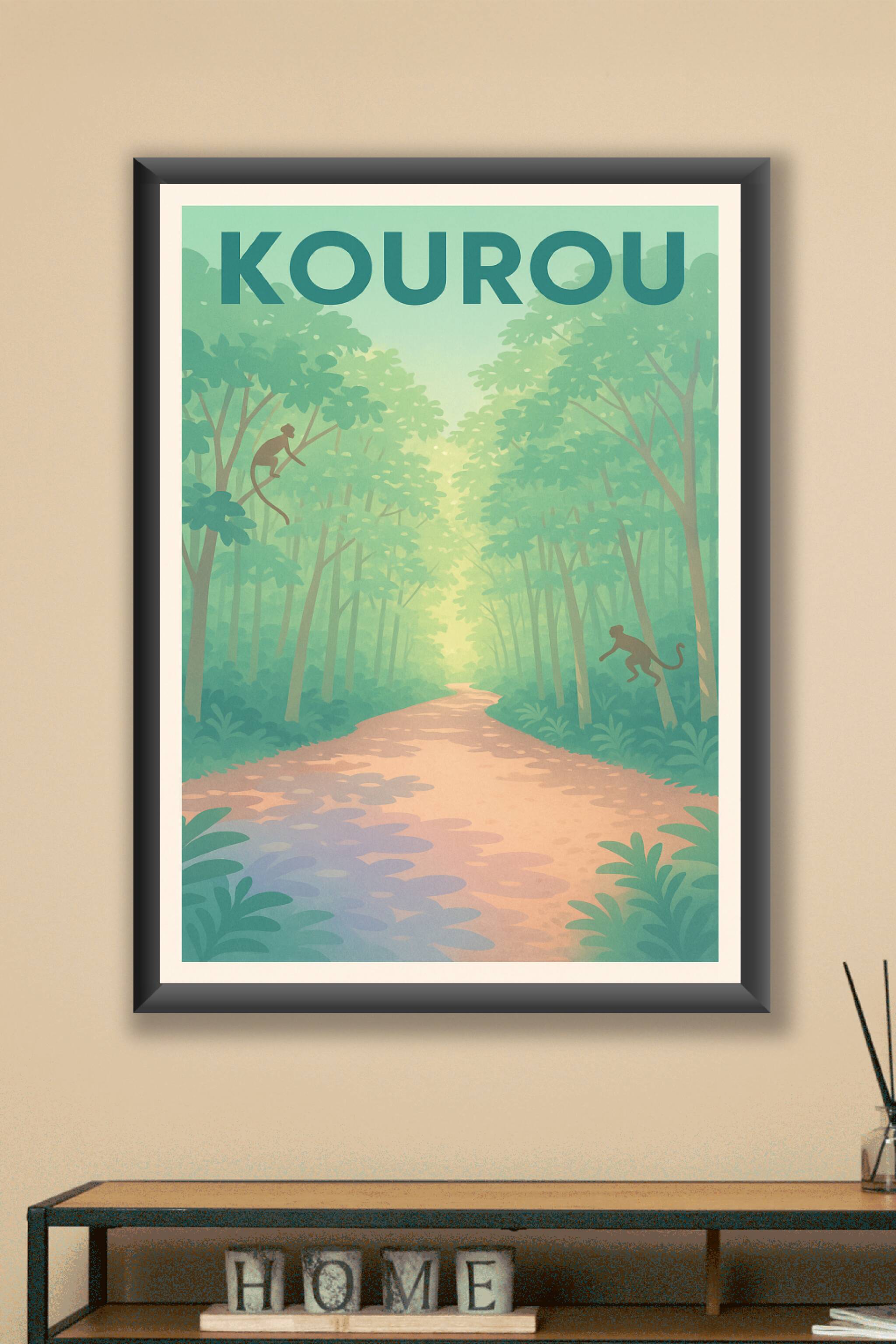 Découvrez l'envoûtante forêt de Kourou avec cette affiche élégante illustrant un chemin paisible bordé d'arbres luxuriants et peuplé de singes curi...