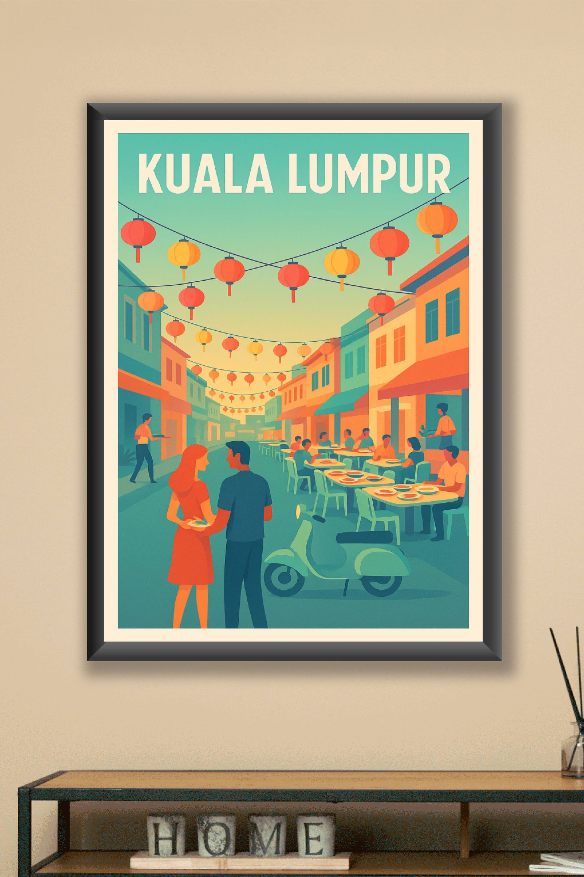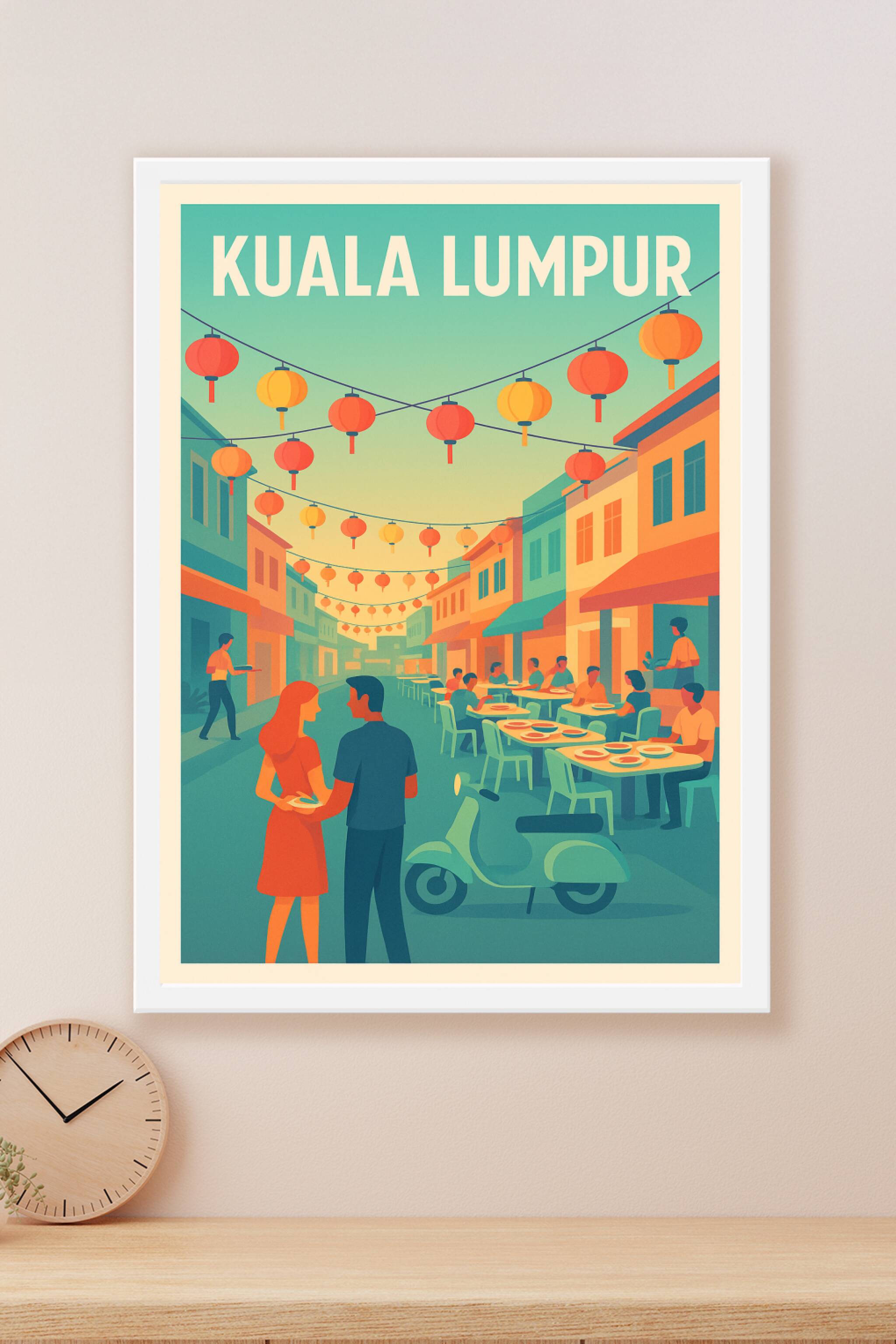 Découvrez l'atmosphère animée et conviviale de Kuala Lumpur à travers cette affiche au style rétro illustrant une rue bordée de lanternes colorées ...