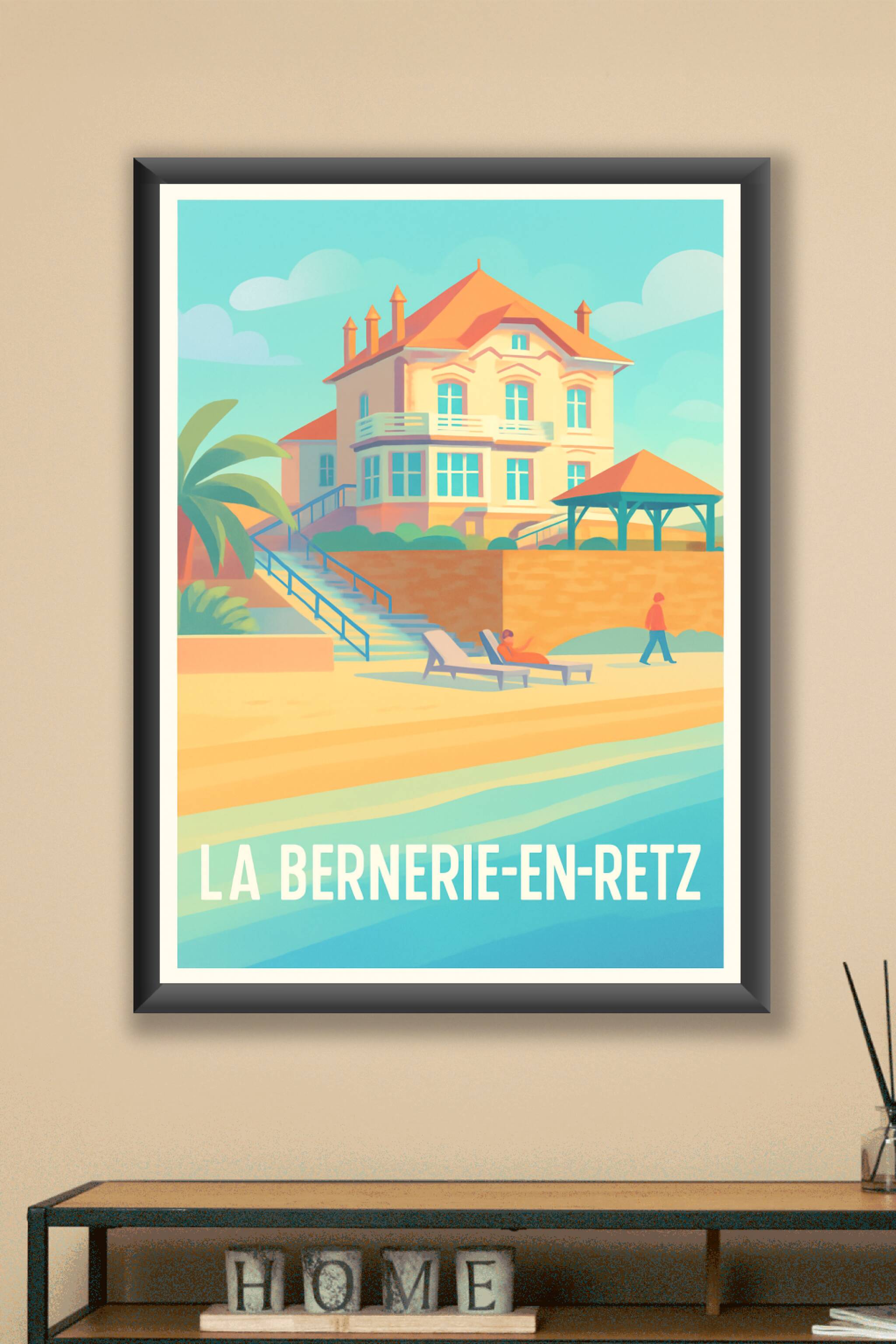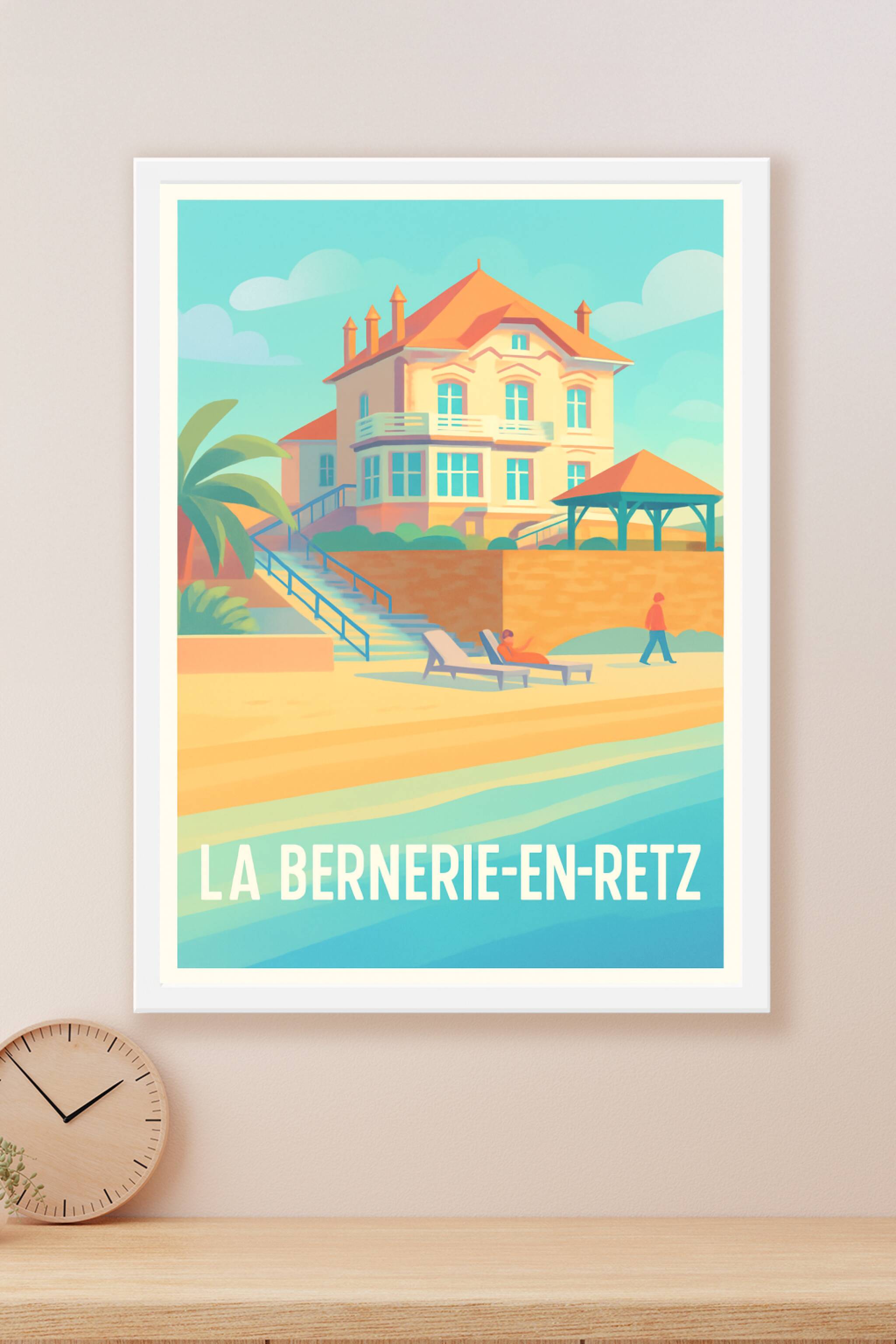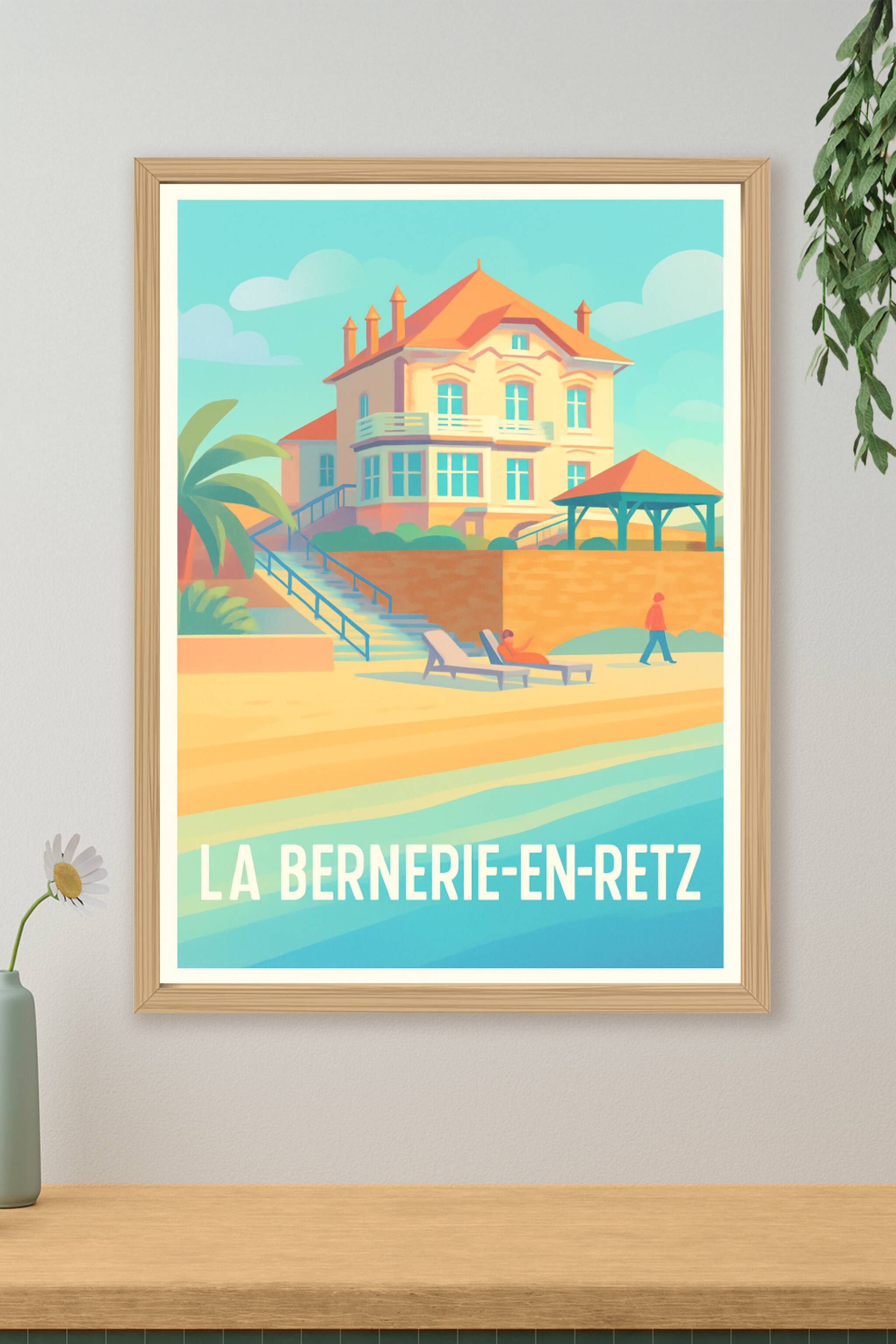 Découvrez l'élégance et la douceur de vivre de La Bernerie-en-Retz avec ce poster au style vintage et lumineux. Cette affiche illustre une maison t...