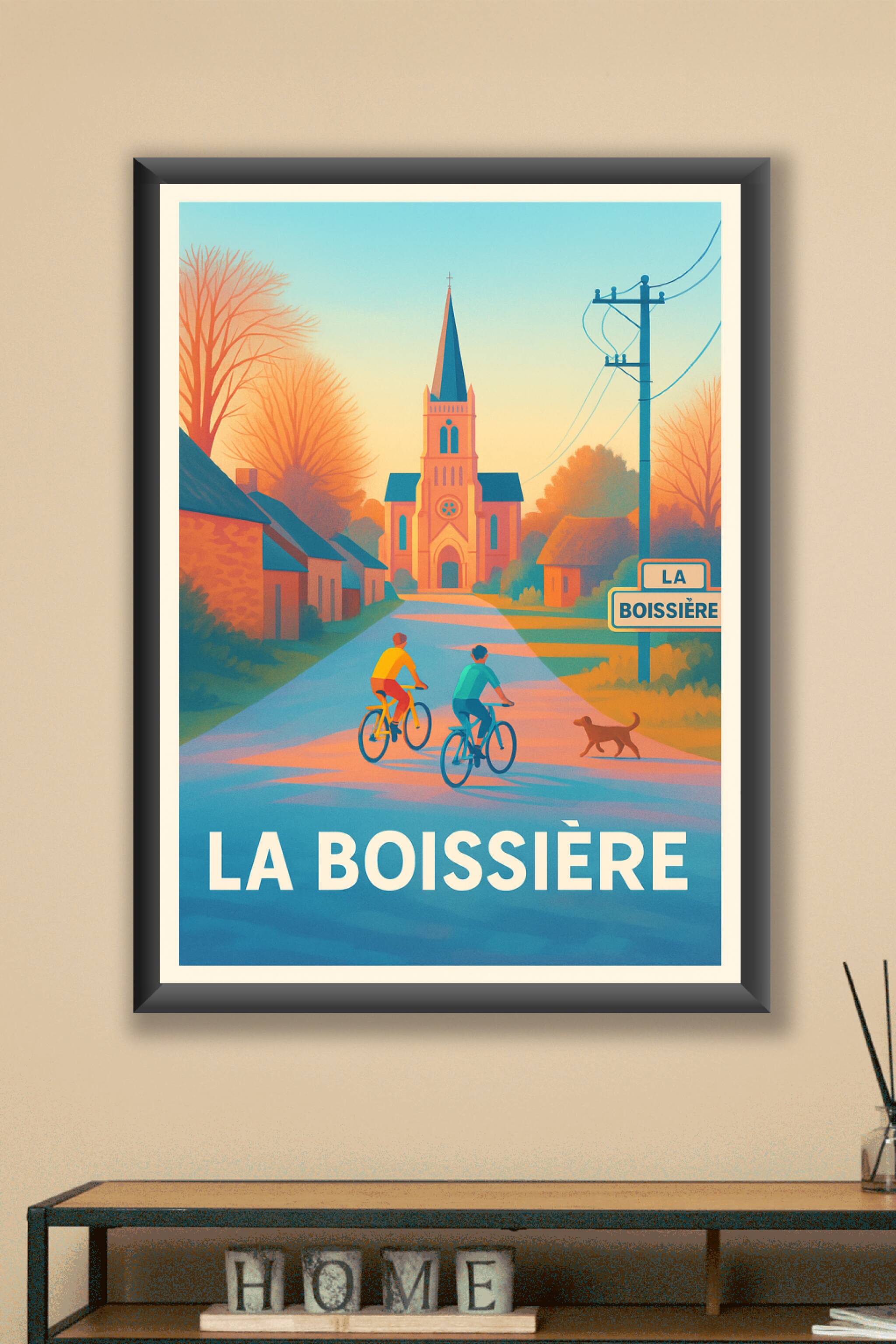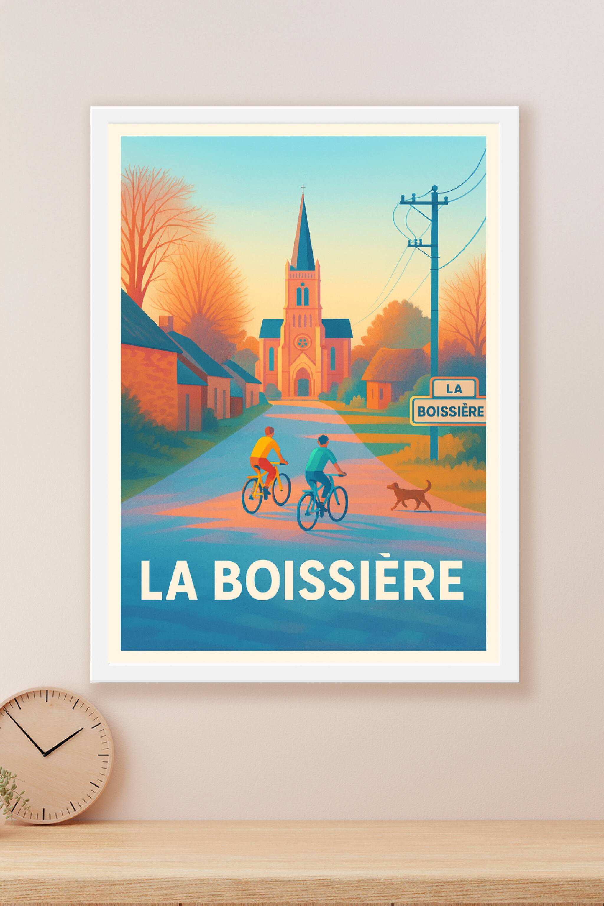 Découvrez le charme paisible de La Boissière avec cette affiche au style illustratif élégant, où deux cyclistes parcourent la route bordée de maiso...