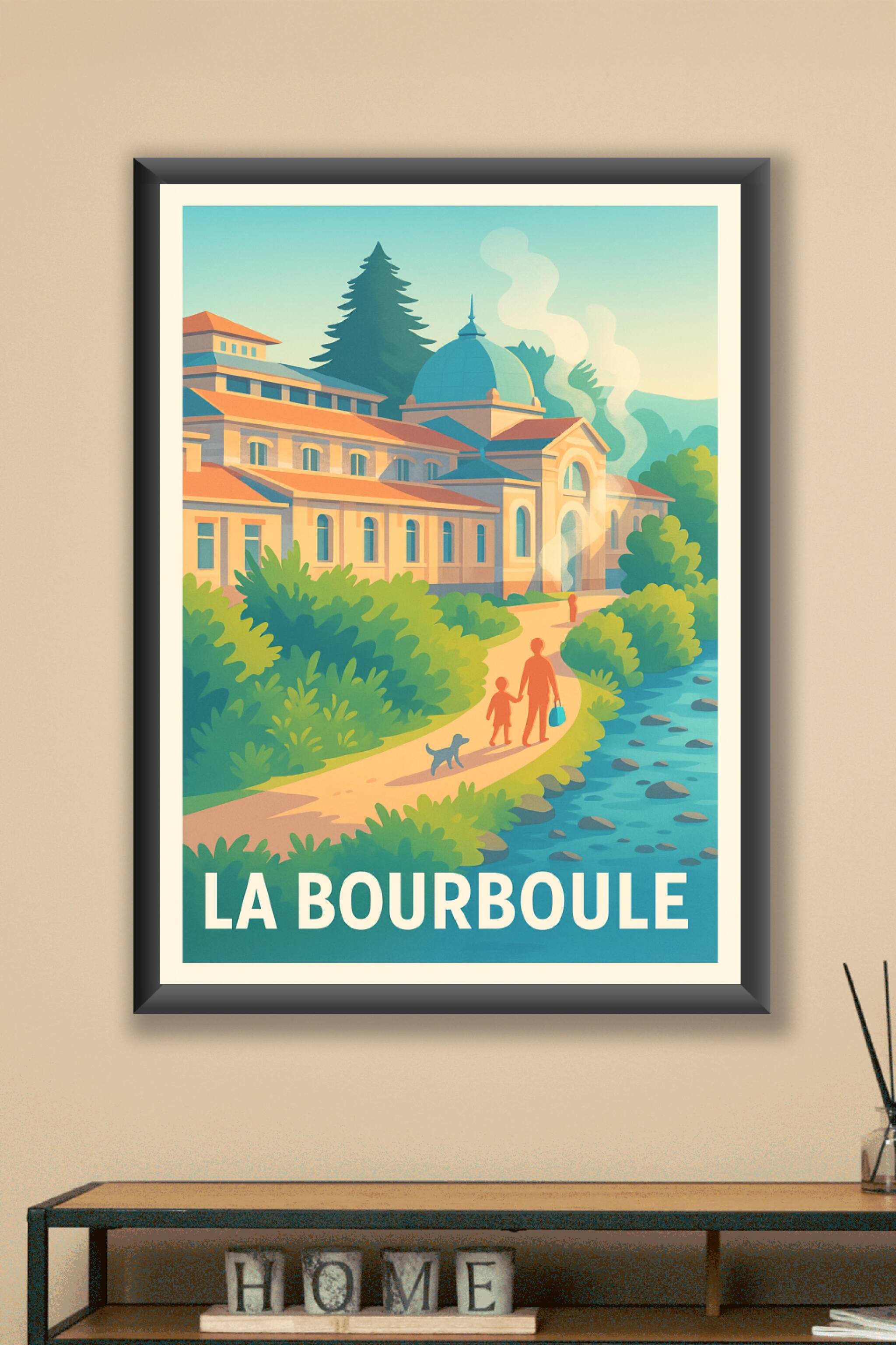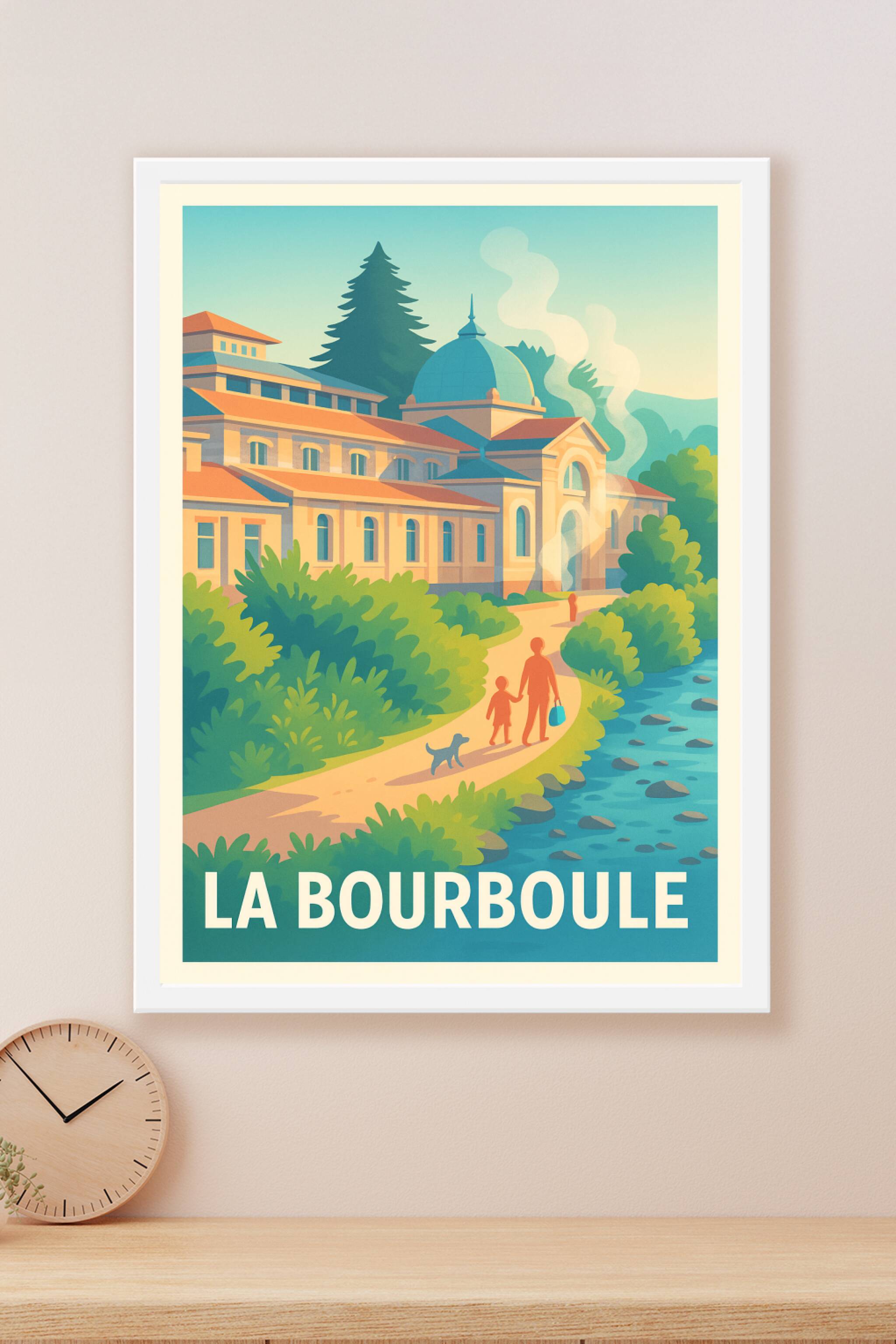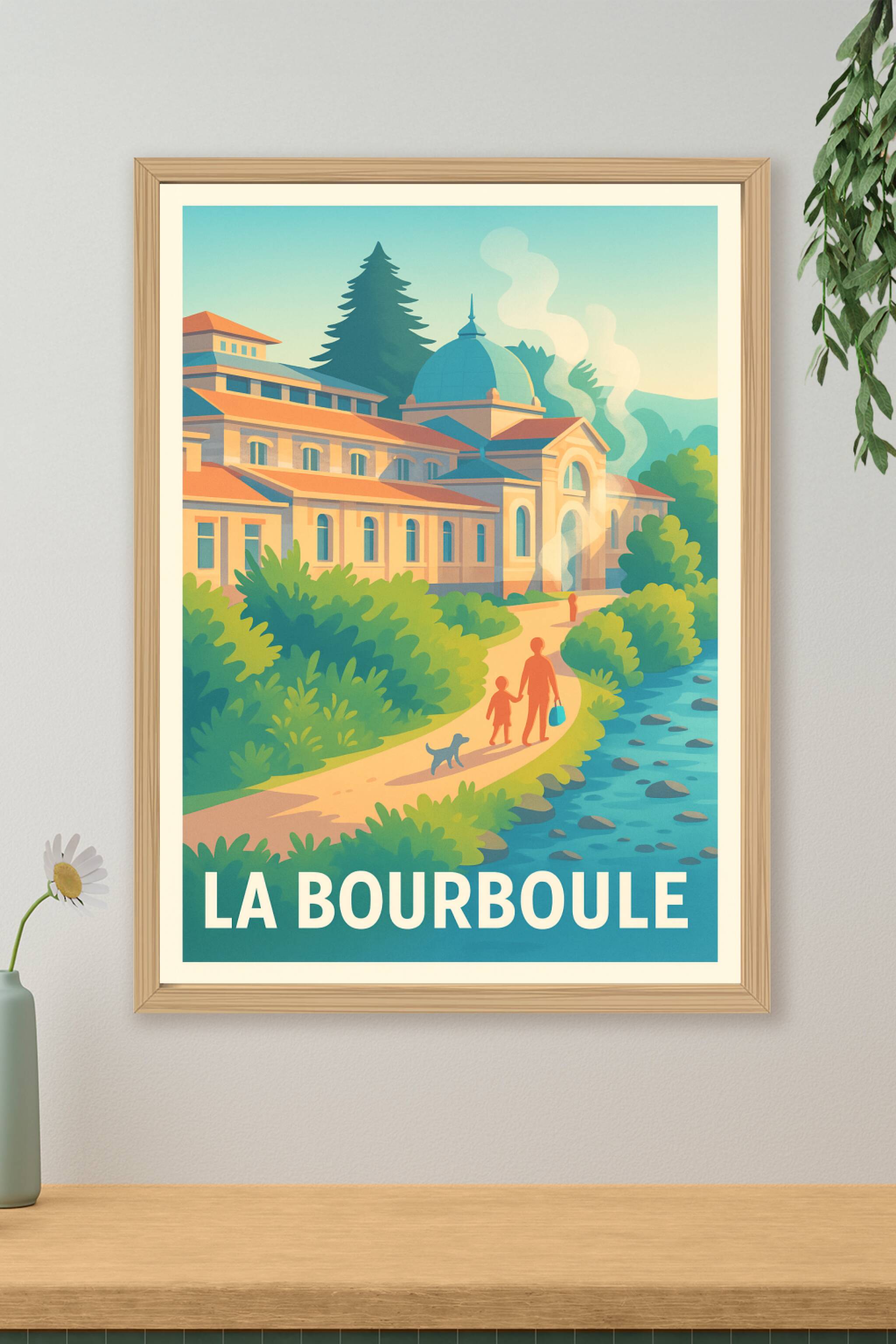 Découvrez le charme unique de La Bourboule avec cette affiche rétro illustrant l'harmonie parfaite entre nature apaisante et architecture emblémati...
