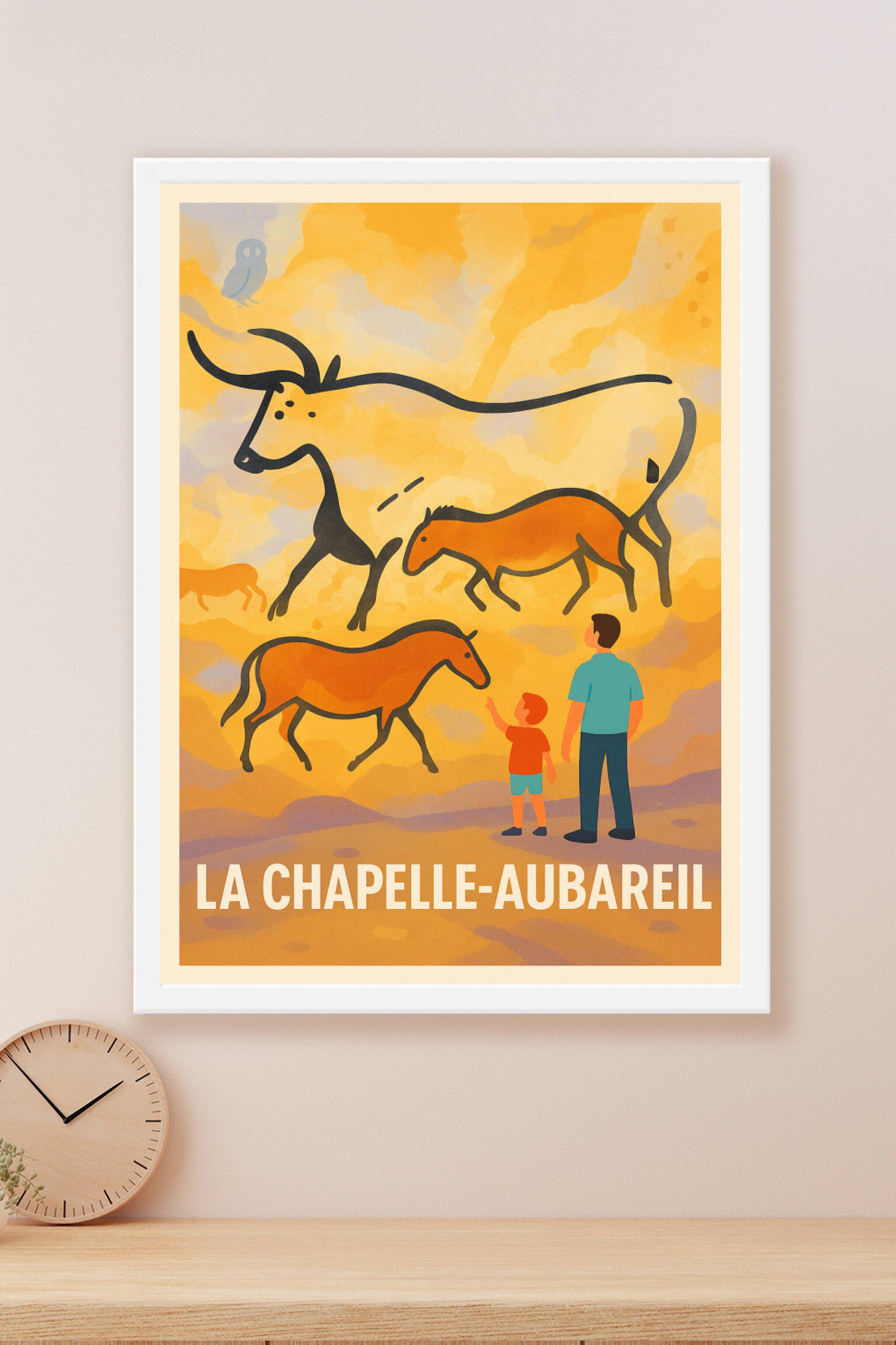 Découvrez l'univers fascinant de La Chapelle-Aubareil à travers cette affiche illustrée mettant en scène les célèbres peintures pariétales. Ce post...