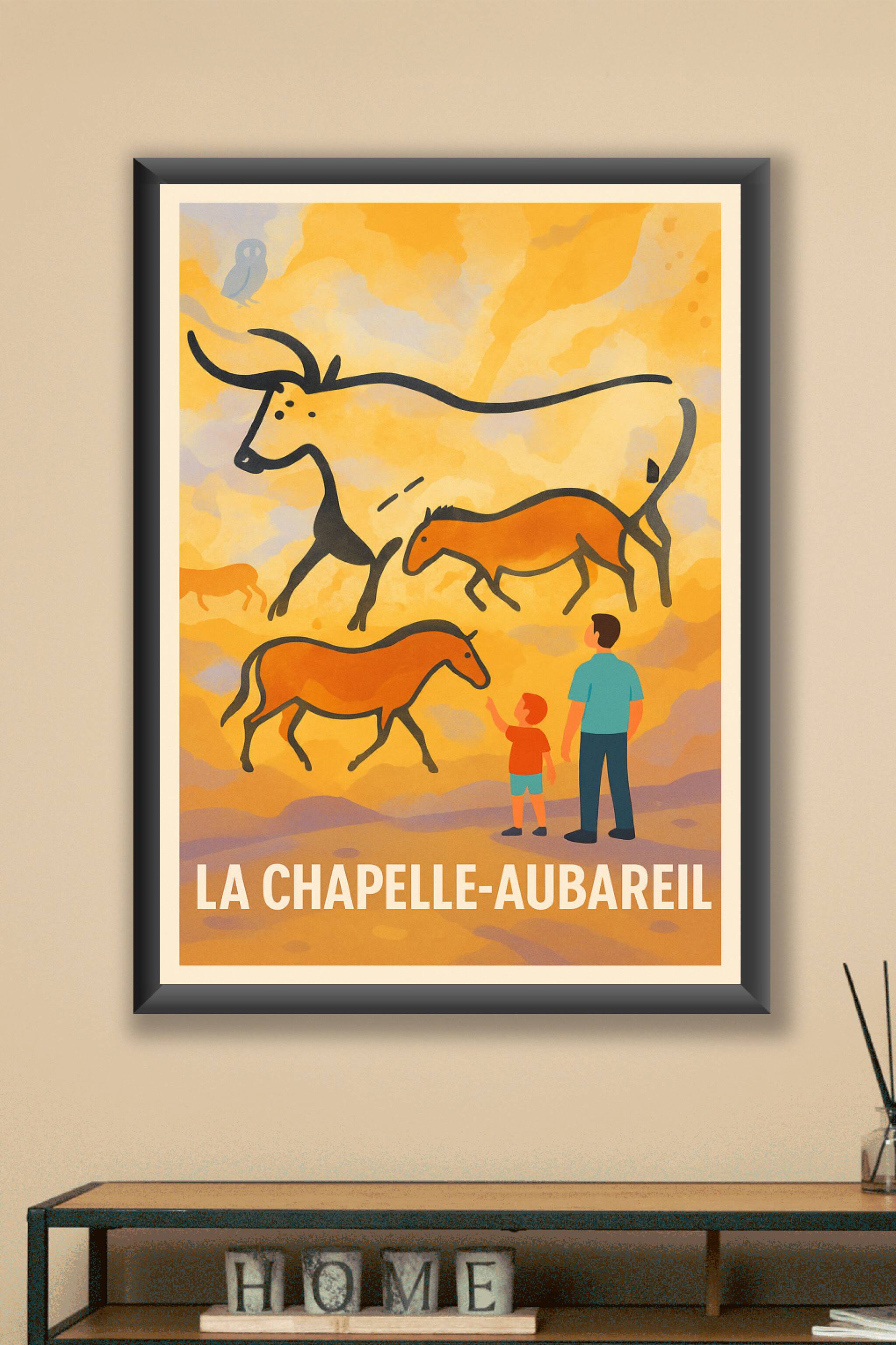Découvrez l'univers fascinant de La Chapelle-Aubareil à travers cette affiche illustrée mettant en scène les célèbres peintures pariétales. Ce poster invite à un voyage visuel dans le temps, où l'homme et la nature dialoguent avec élégance sur les murs des grottes. Imprimée en tirage « Fine Art » sur un papier 305g coton, cette affiche offre une qualité d'impression exceptionnelle pour sublimer votre intérieur. Disponible en formats A1 à A4, avec ou sans cadre, elle s'intègre parfaitement à votre déco ou devient un cadeau original pour les passionnés d'histoire et d'art préhistorique.