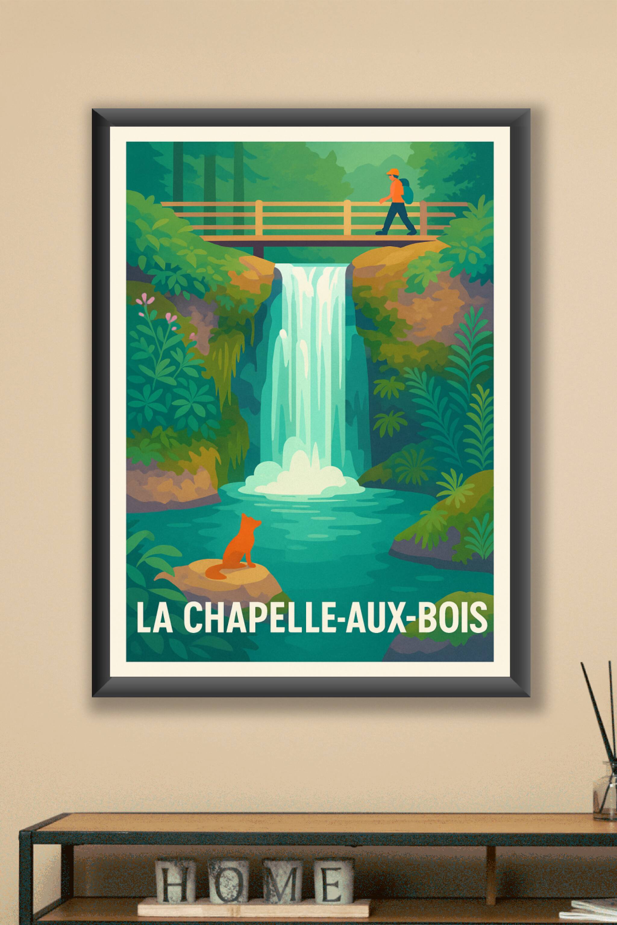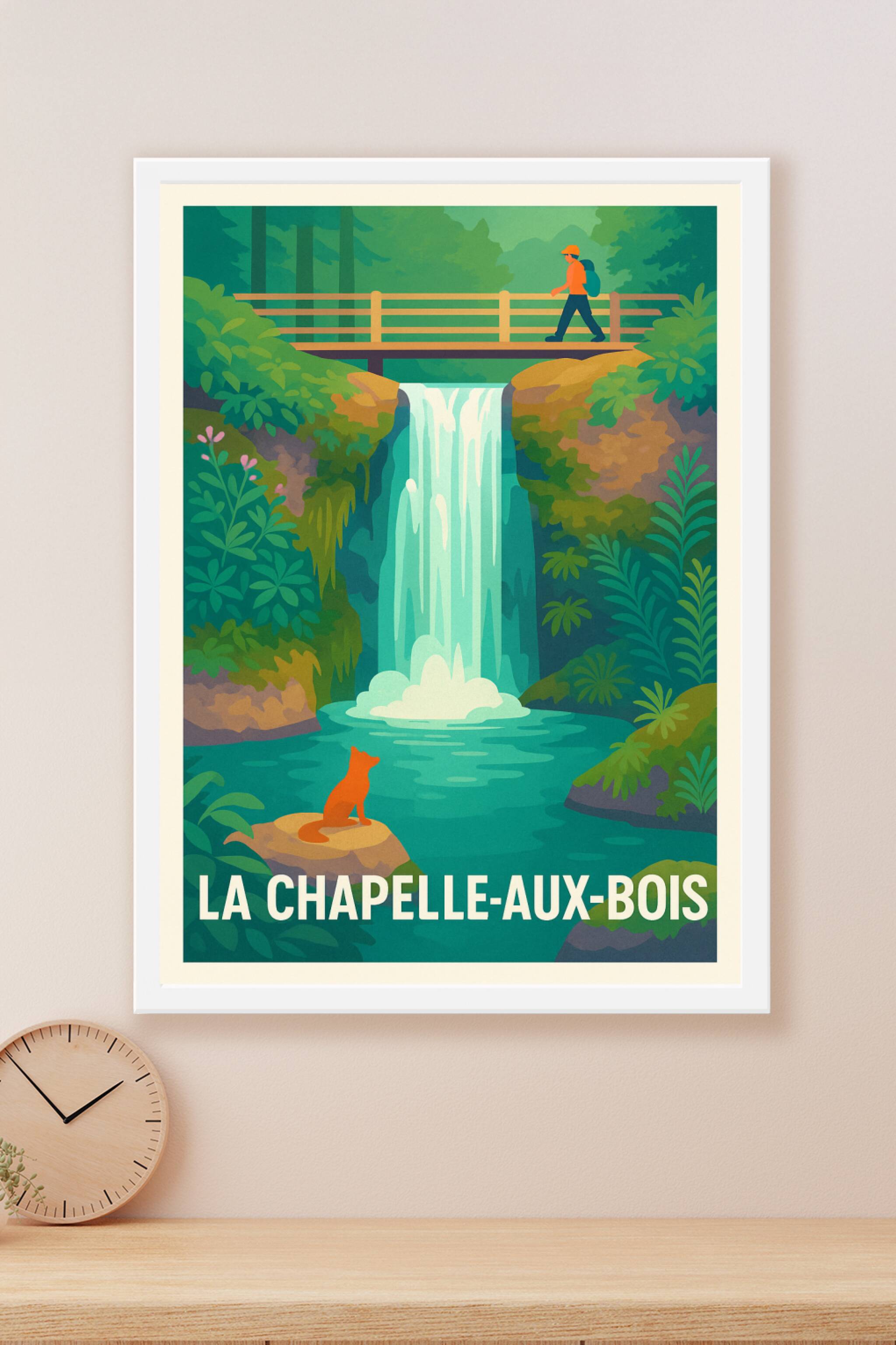 Découvrez la beauté apaisante de La Chapelle-aux-Bois avec cette affiche illustrée mettant en scène une cascade majestueuse entourée d'une végétati...