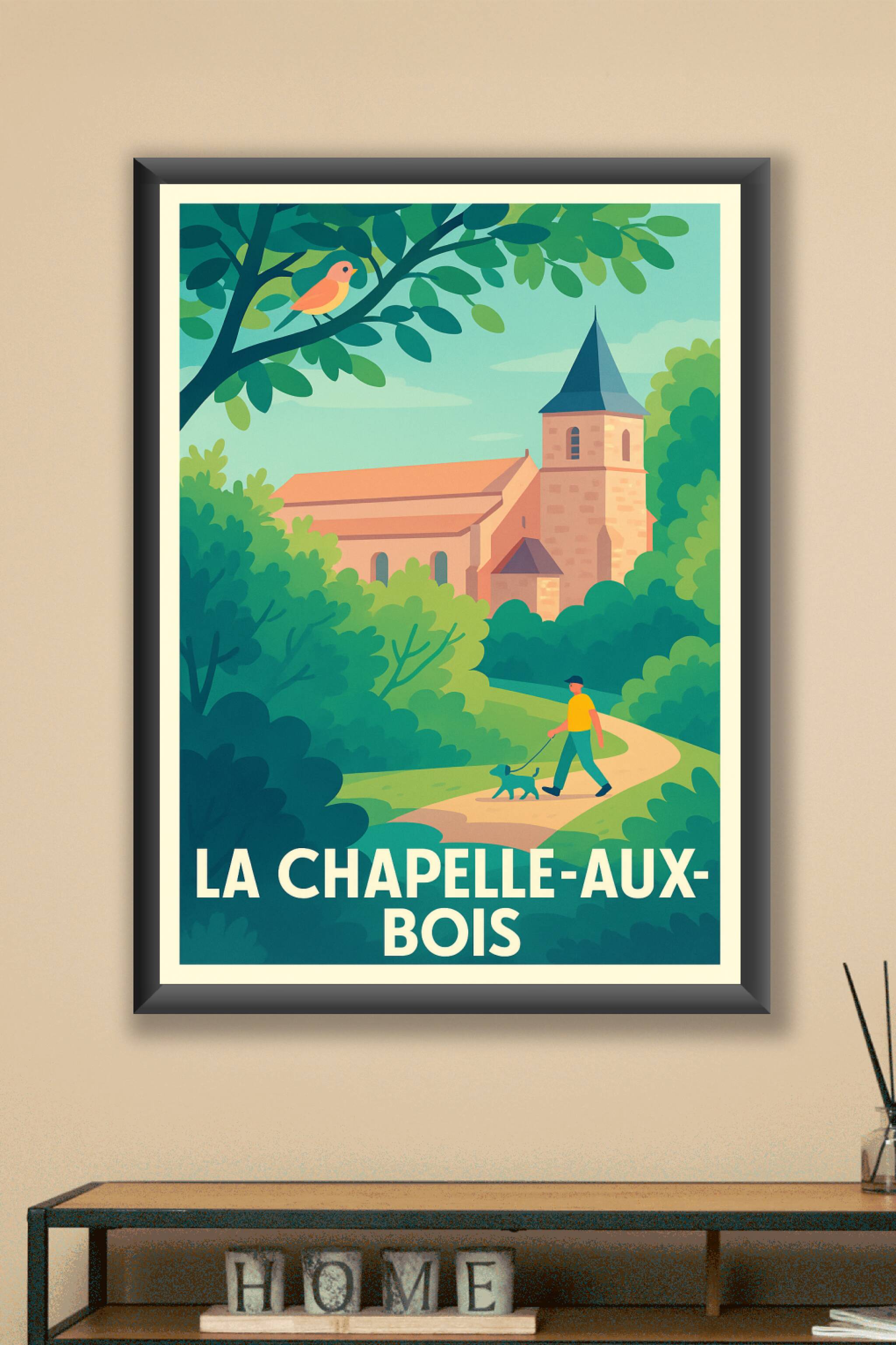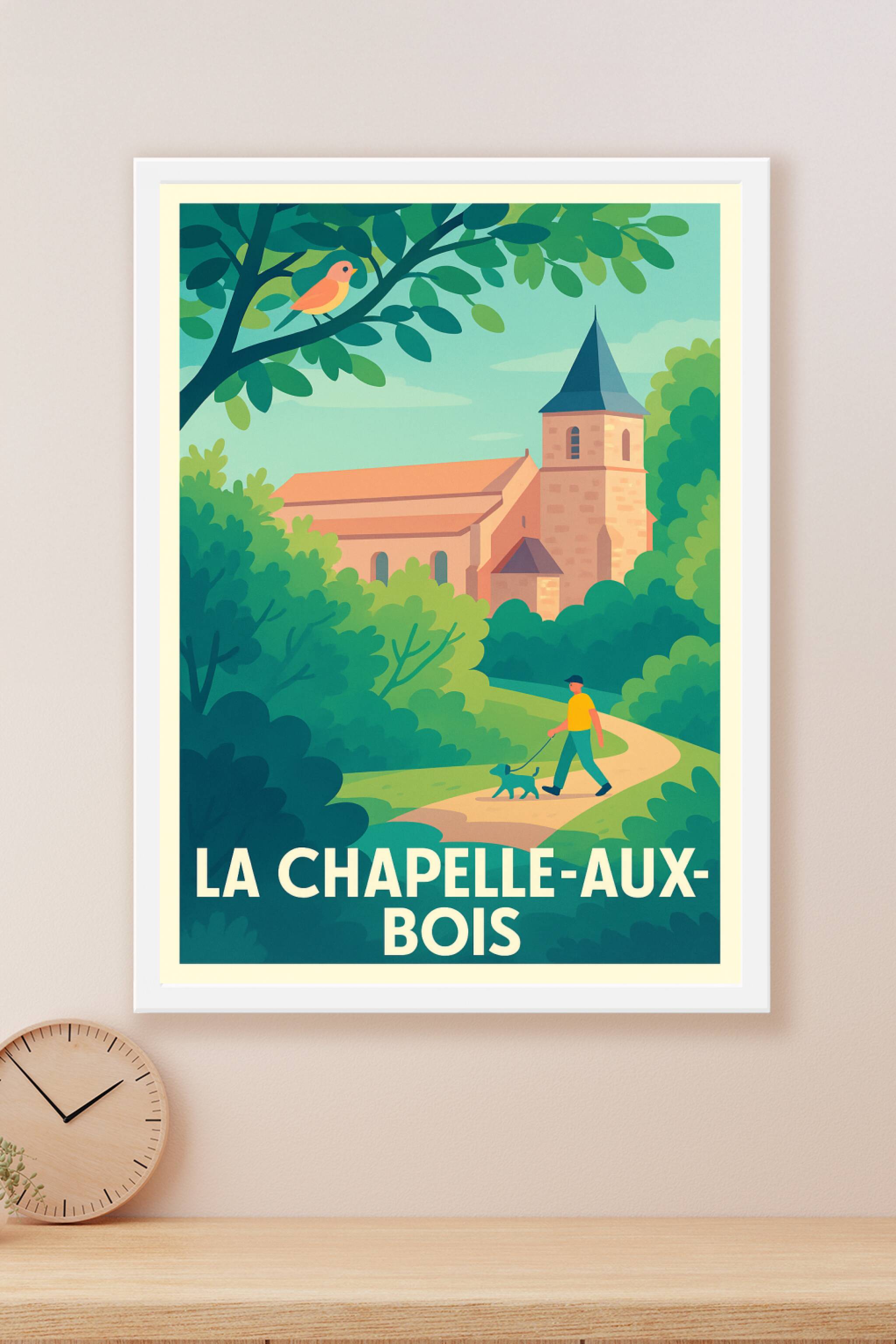 Découvrez l'atmosphère paisible de La Chapelle-aux-Bois avec cette affiche illustrée, capturant un moment de calme où un promeneur se balade avec s...