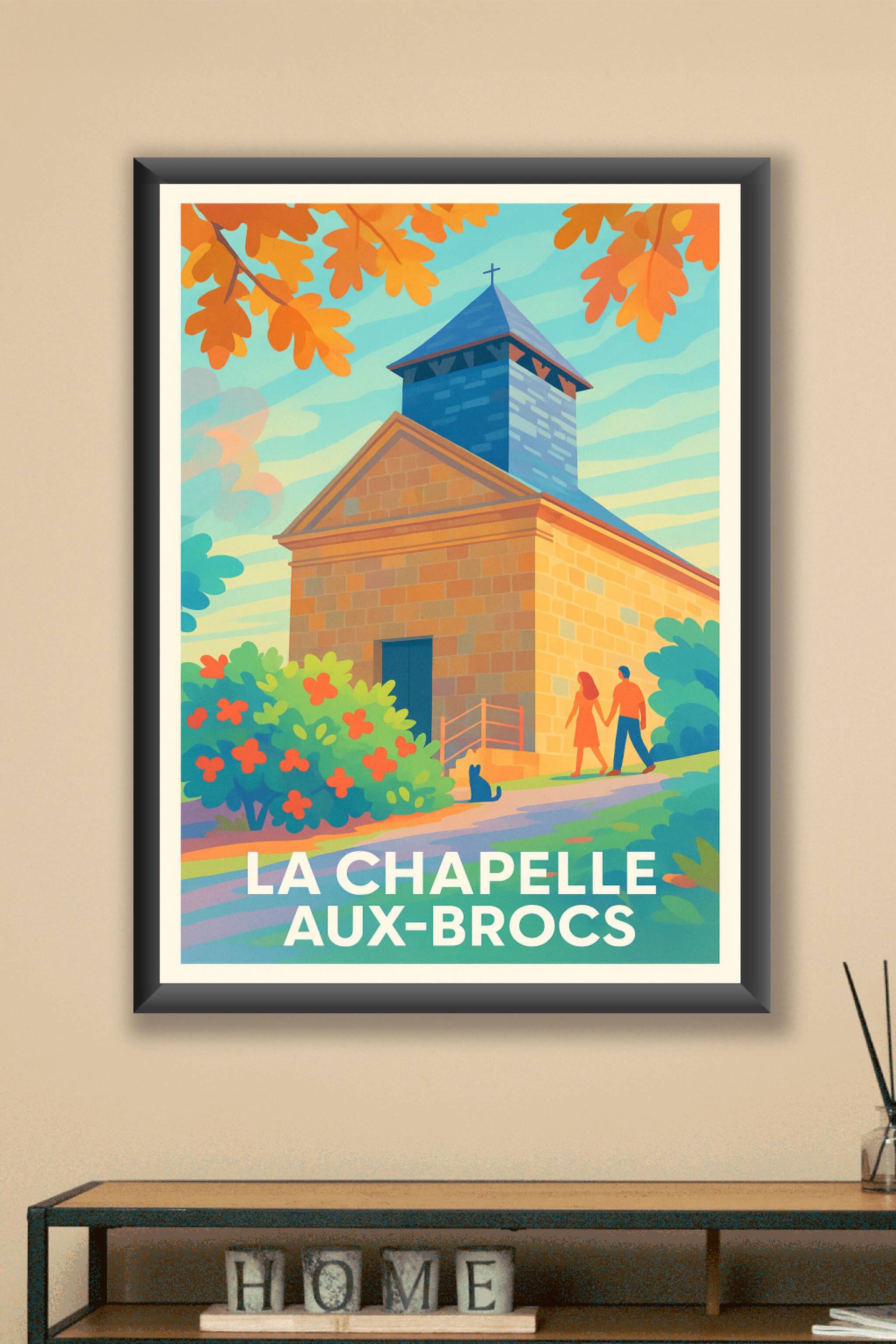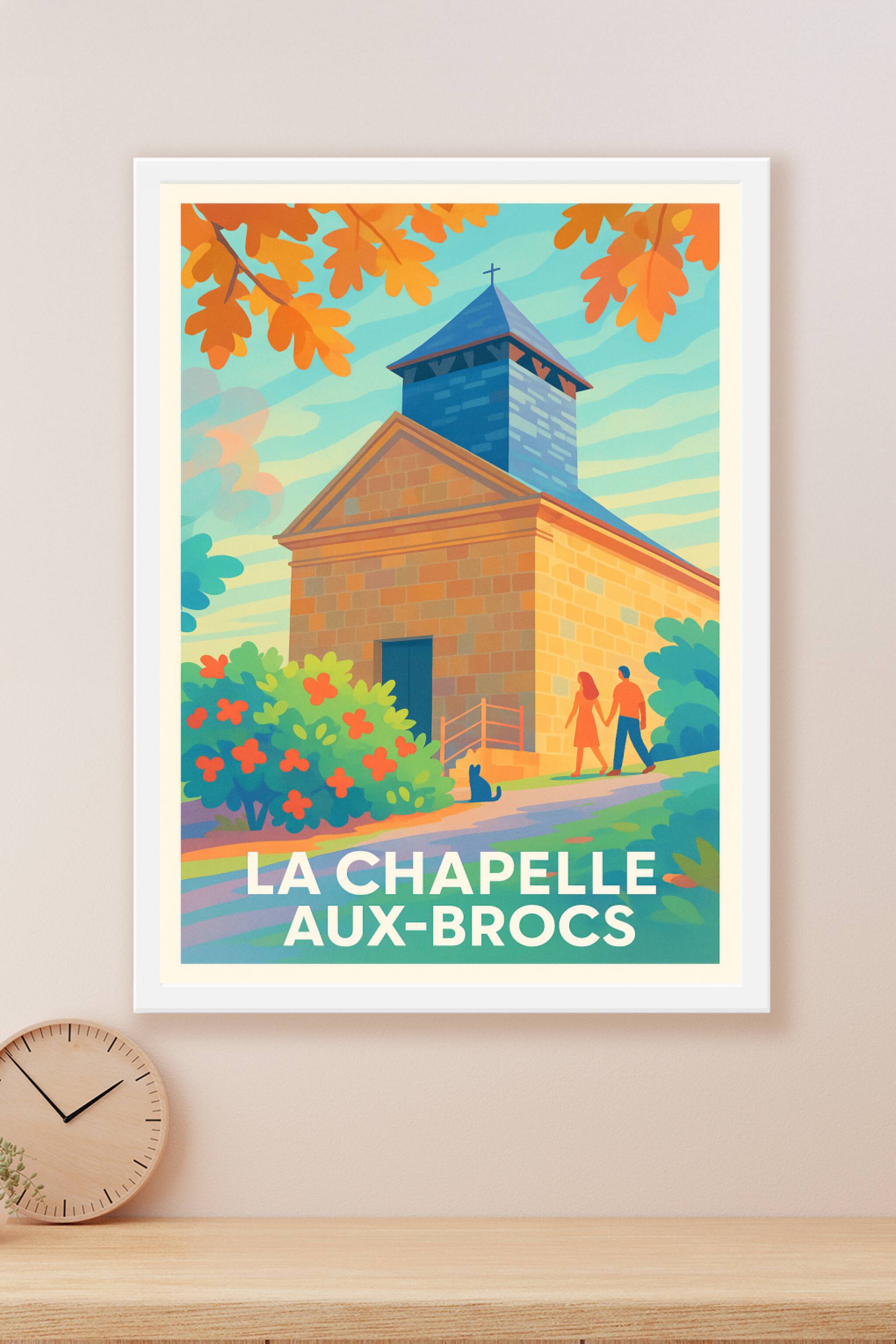 Apportez une touche de sérénité et de charme à votre décoration avec cette affiche illustrée représentant la paisible Chapelle aux Brocs, entourée ...
