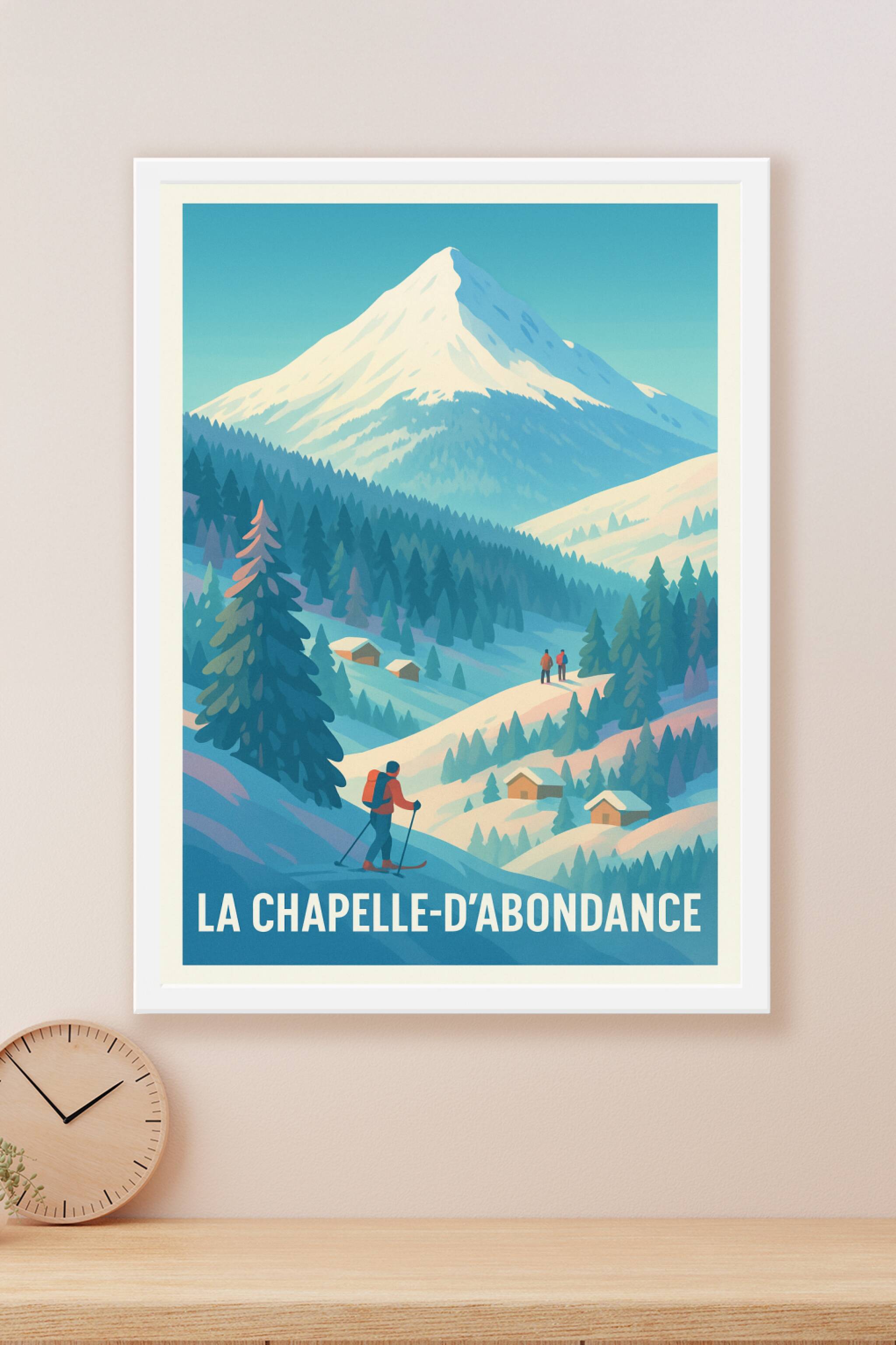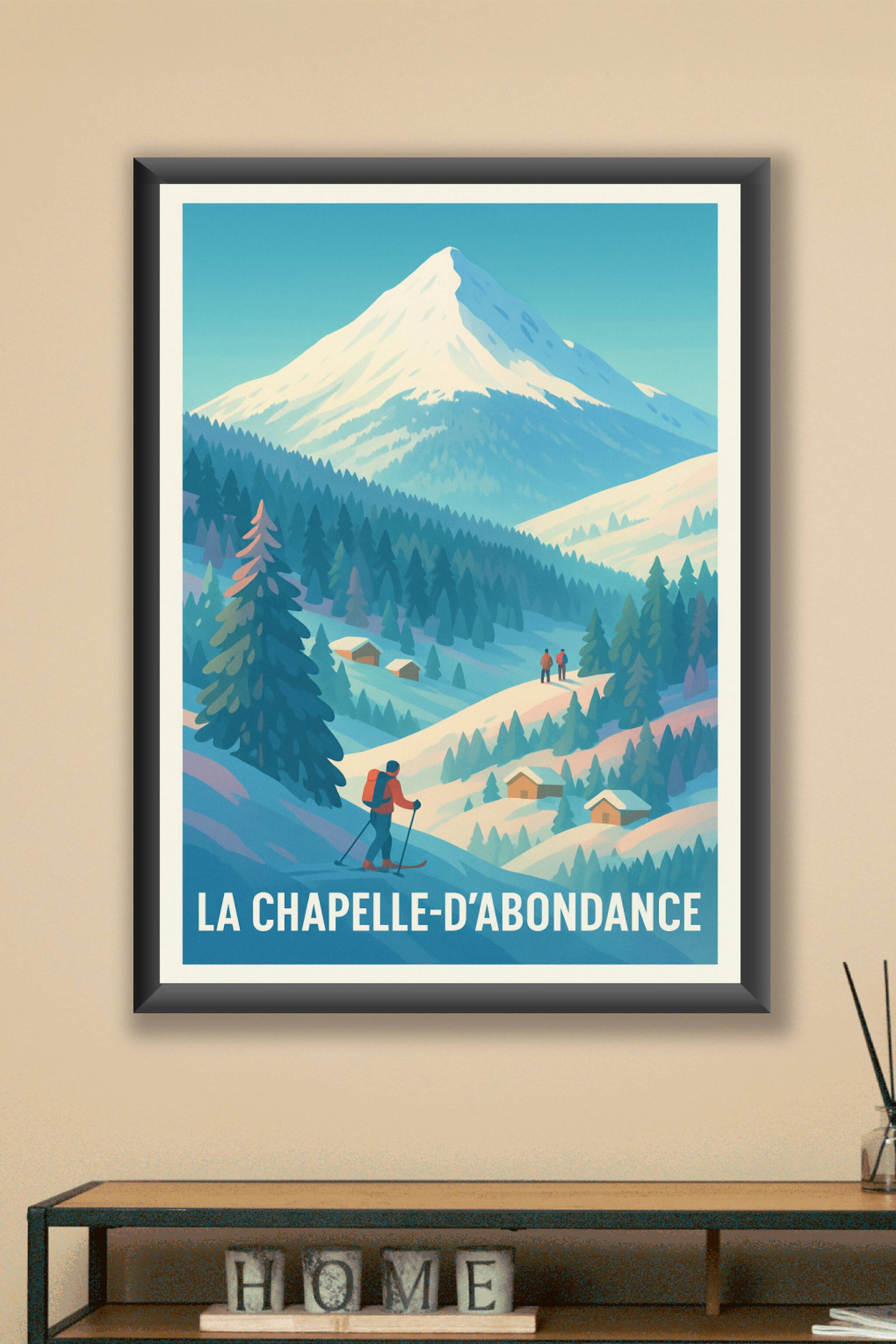 Découvrez l'élégance hivernale de La Chapelle-d'Abondance à travers cette affiche au style vintage et apaisant. L'illustration met en scène les maj...