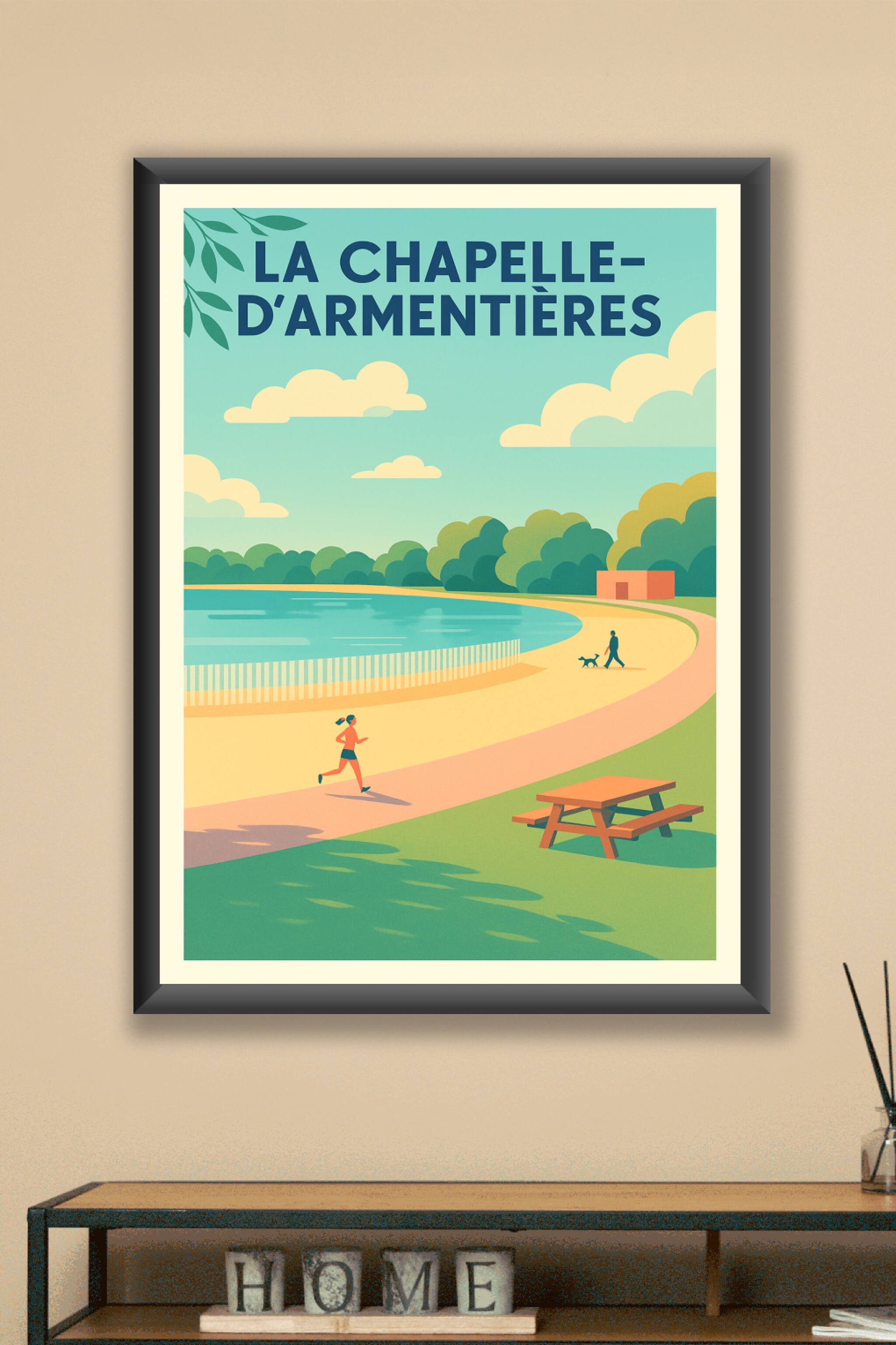 Découvrez la sérénité des bords de l'eau à La Chapelle-d'Armentières avec cette affiche élégante au style épuré et coloré. Ce poster illustre un pa...