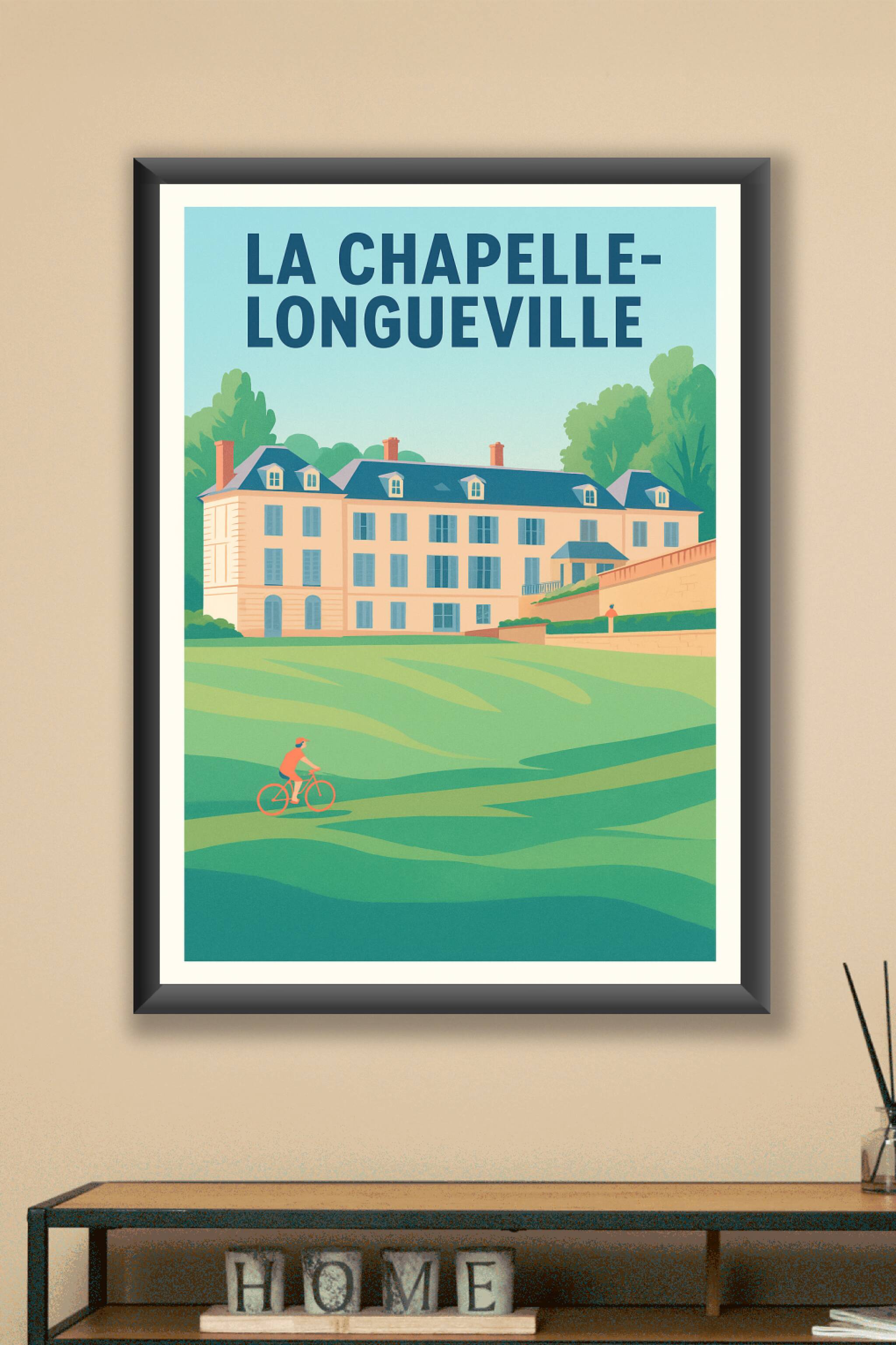 Découvrez la sérénité et le charme de La Chapelle-Longueville à travers cette affiche illustrée mettant en avant un magnifique domaine sur fond de nature verdoyante. Ce poster évoque à la fois calme et balade à vélo, parfait pour une ambiance apaisante chez vous. Imprimée en tirage "Fine Art" sur papier 305g coton d'une qualité exceptionnelle, cette affiche est disponible en formats A1, A2, A3 et A4, avec ou sans cadre, pour s'adapter à tous vos besoins décoratifs. Bénéficiez d'une impression haut de gamme, 100% fabriquée en France, pour sublimer votre intérieur ou offrir un souvenir élégant aux passionnés de cette charmante commune.