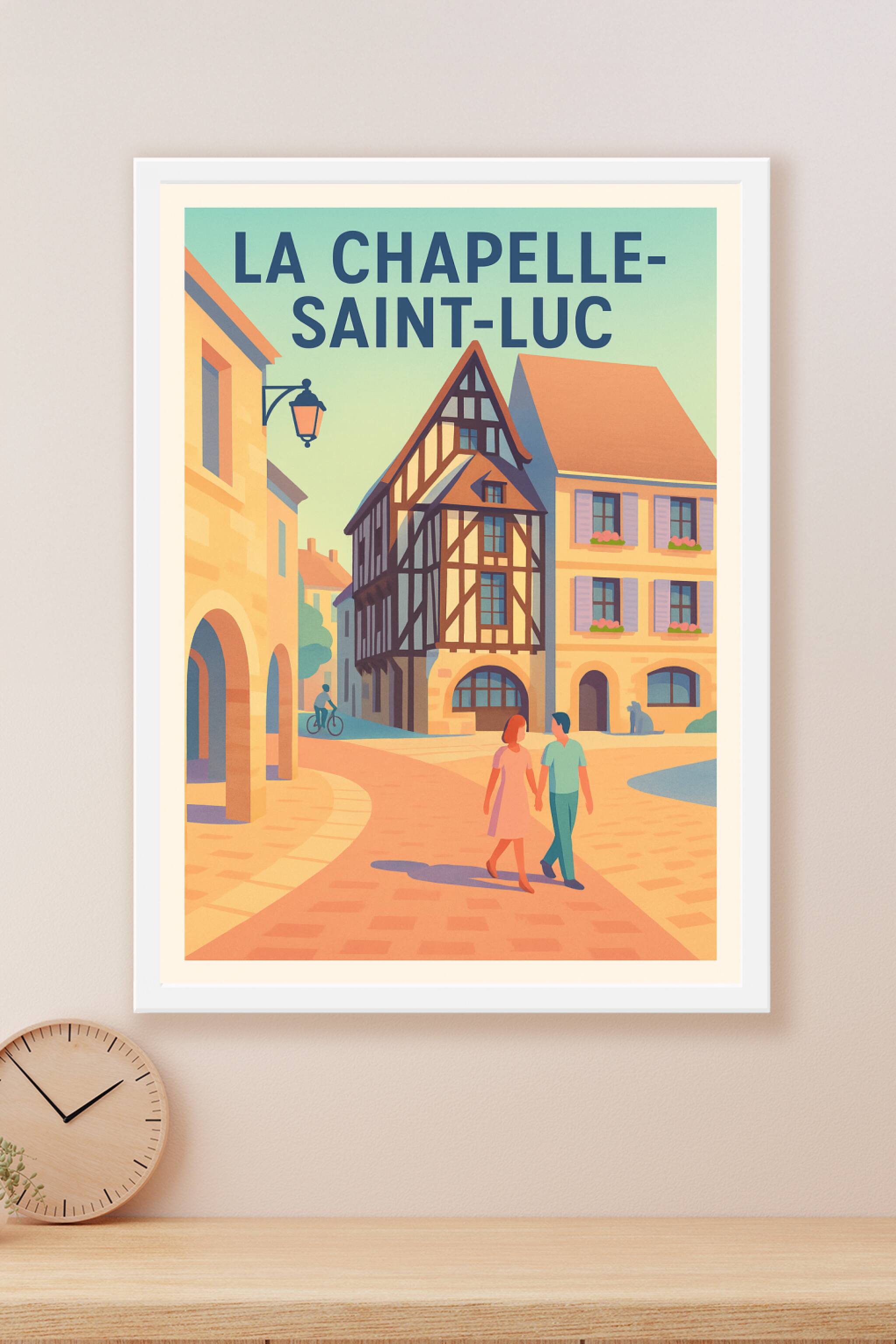 Découvrez cette affiche élégante représentant une scène paisible et lumineuse du centre historique de La Chapelle-Saint-Luc. Ce poster vintage met ...