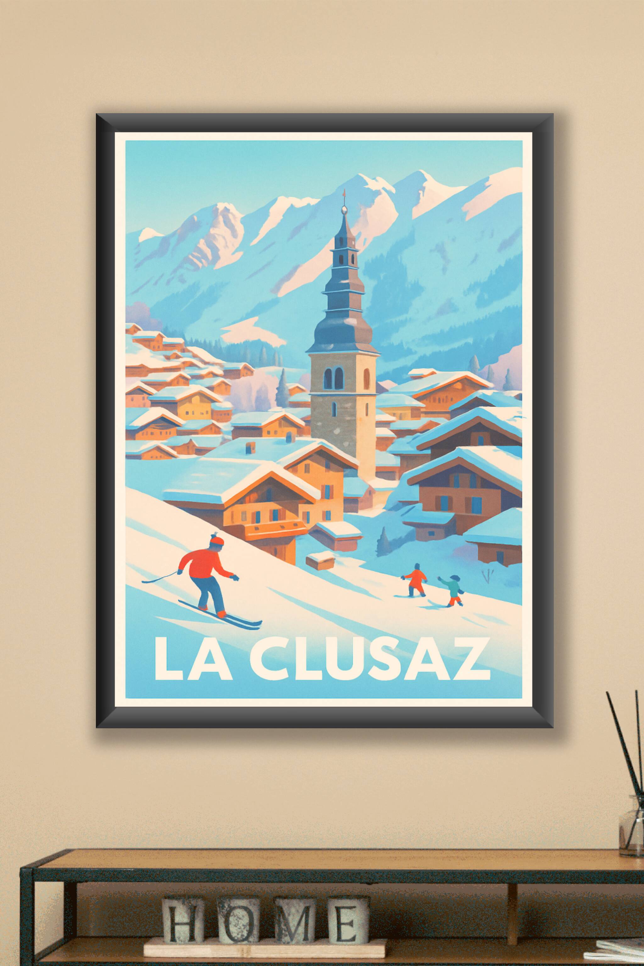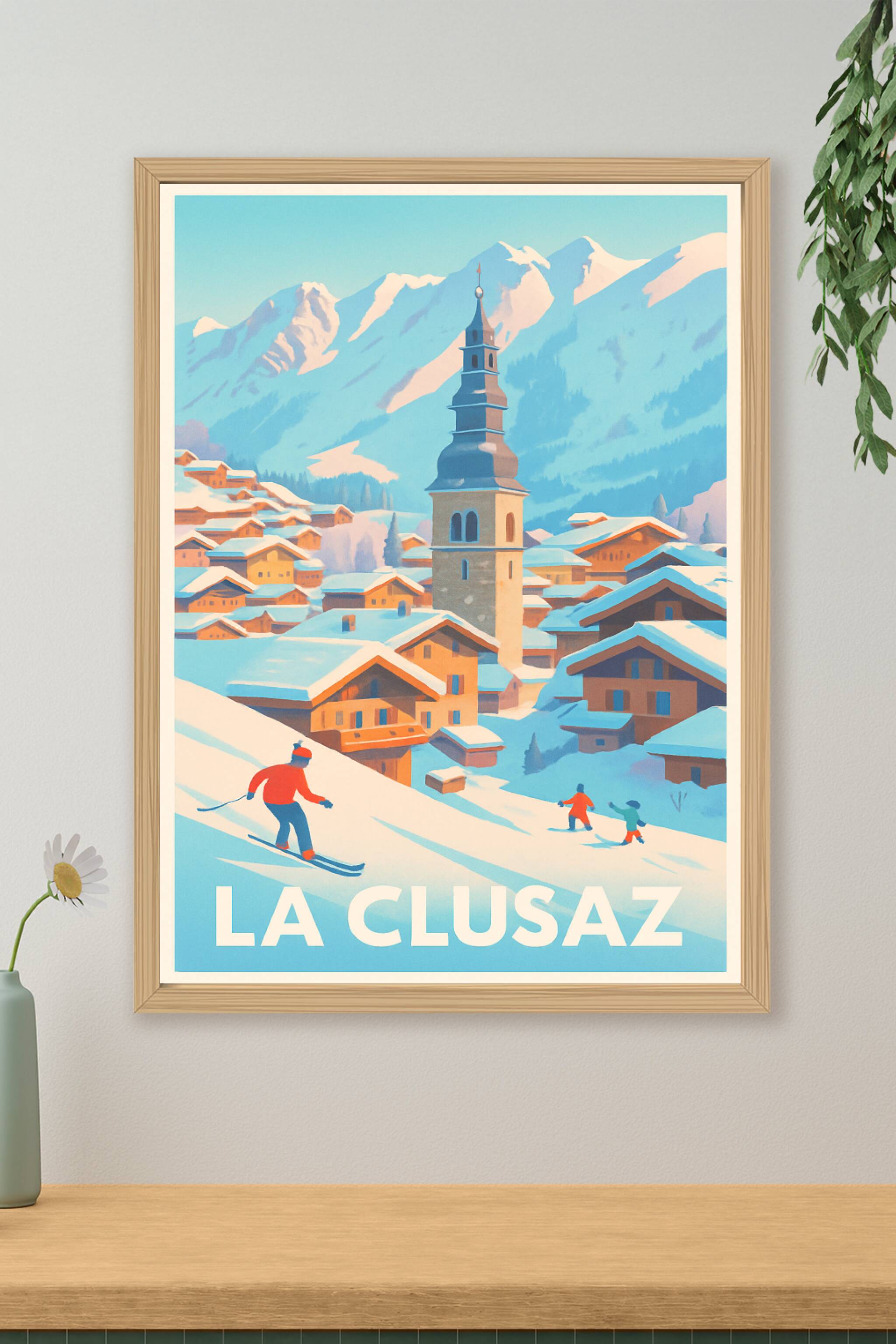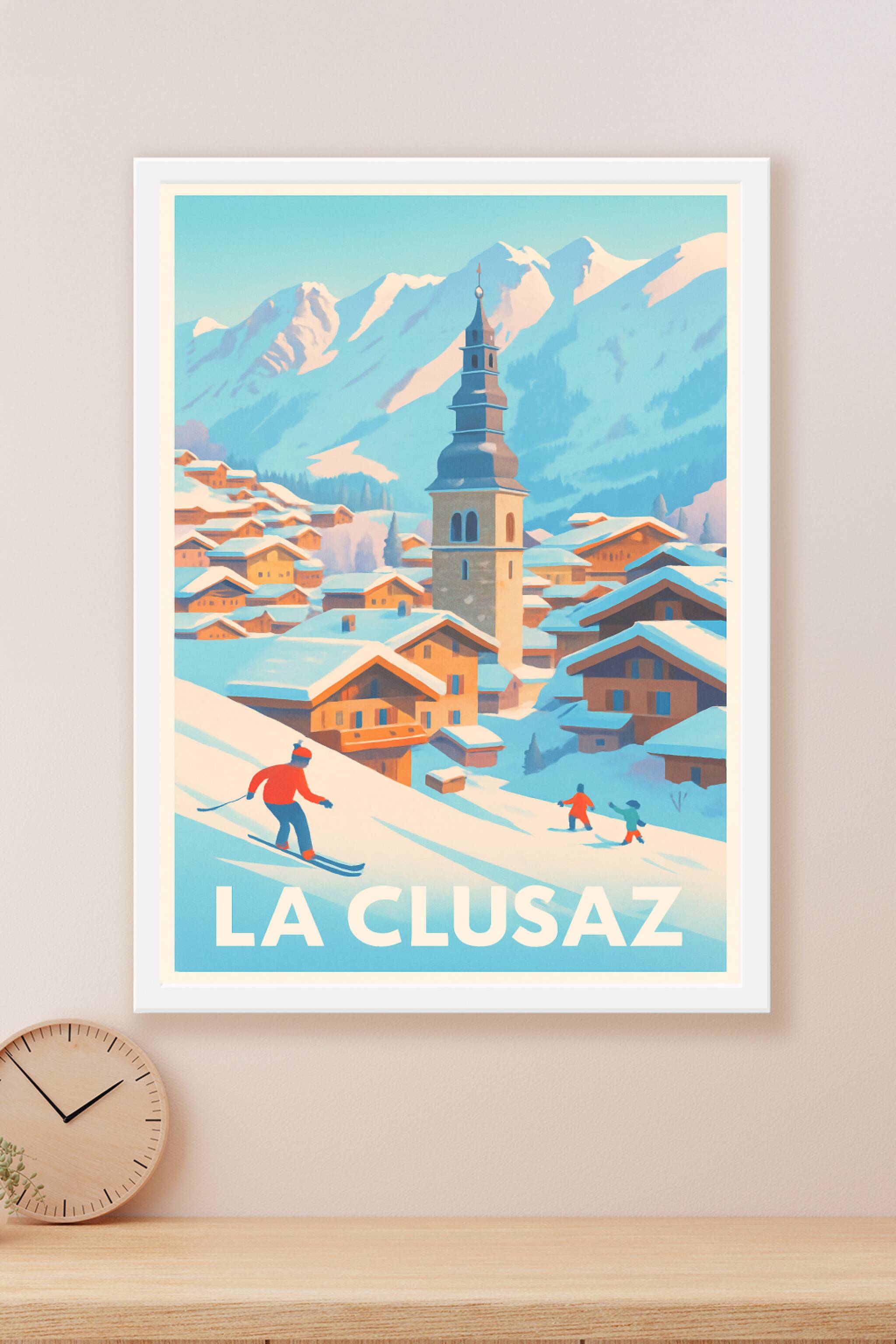Découvrez la magie des Alpes avec cette affiche vintage illustrant le village de La Clusaz sous un manteau de neige immaculée. Ce poster met en scè...