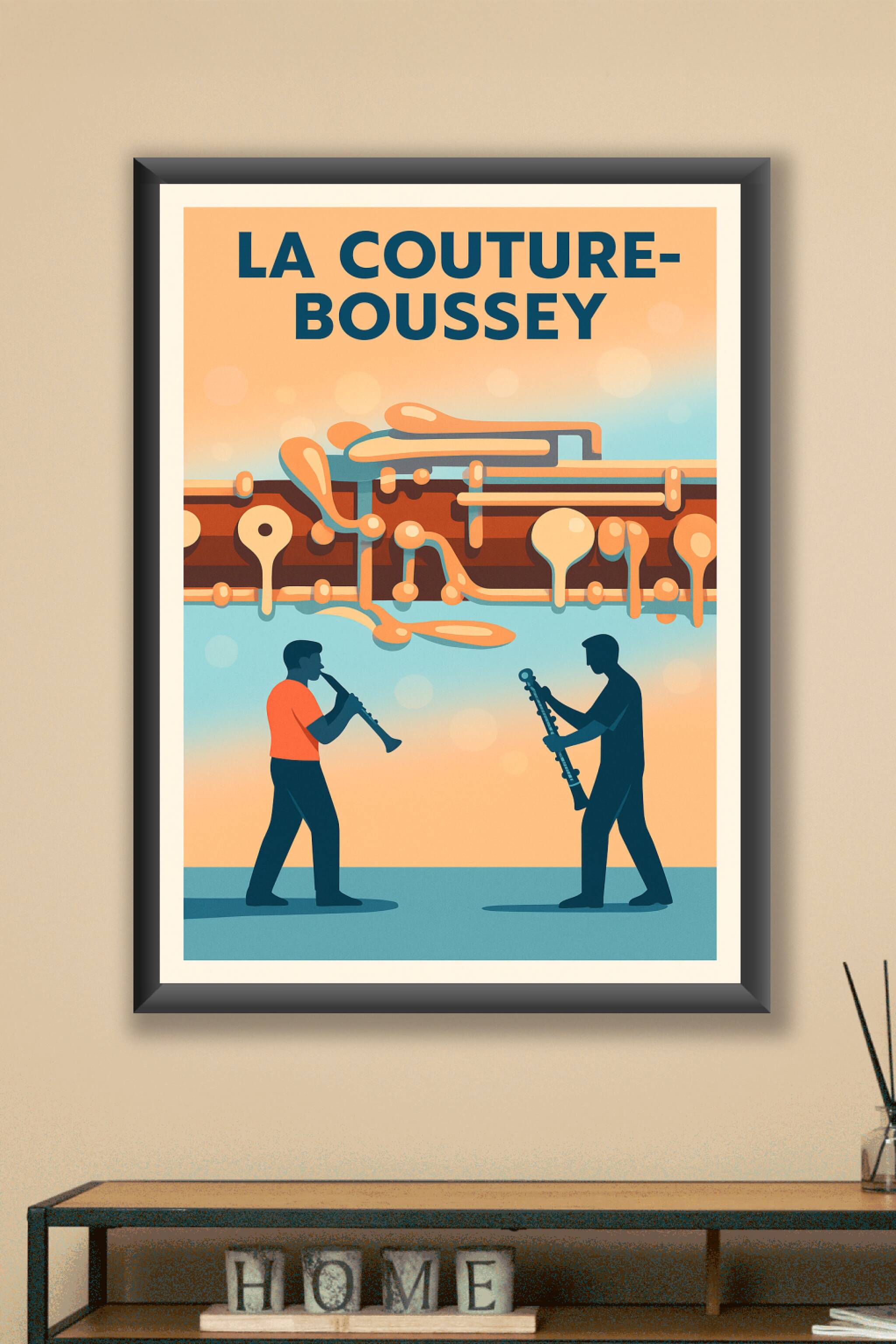 Découvrez cette affiche unique célébrant La Couture-Boussey, berceau renommé des instruments à vent. Cette création graphique met en scène deux mus...