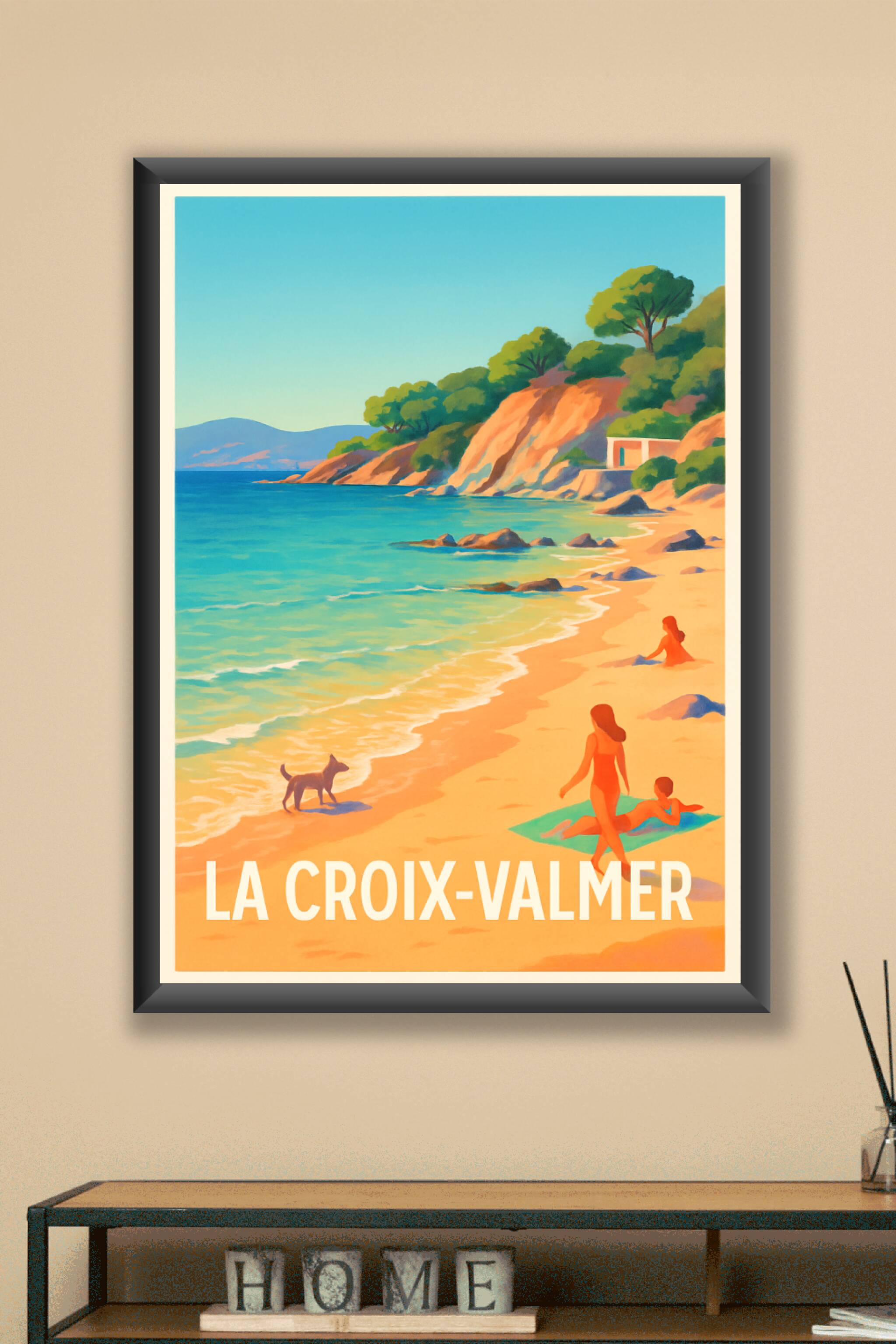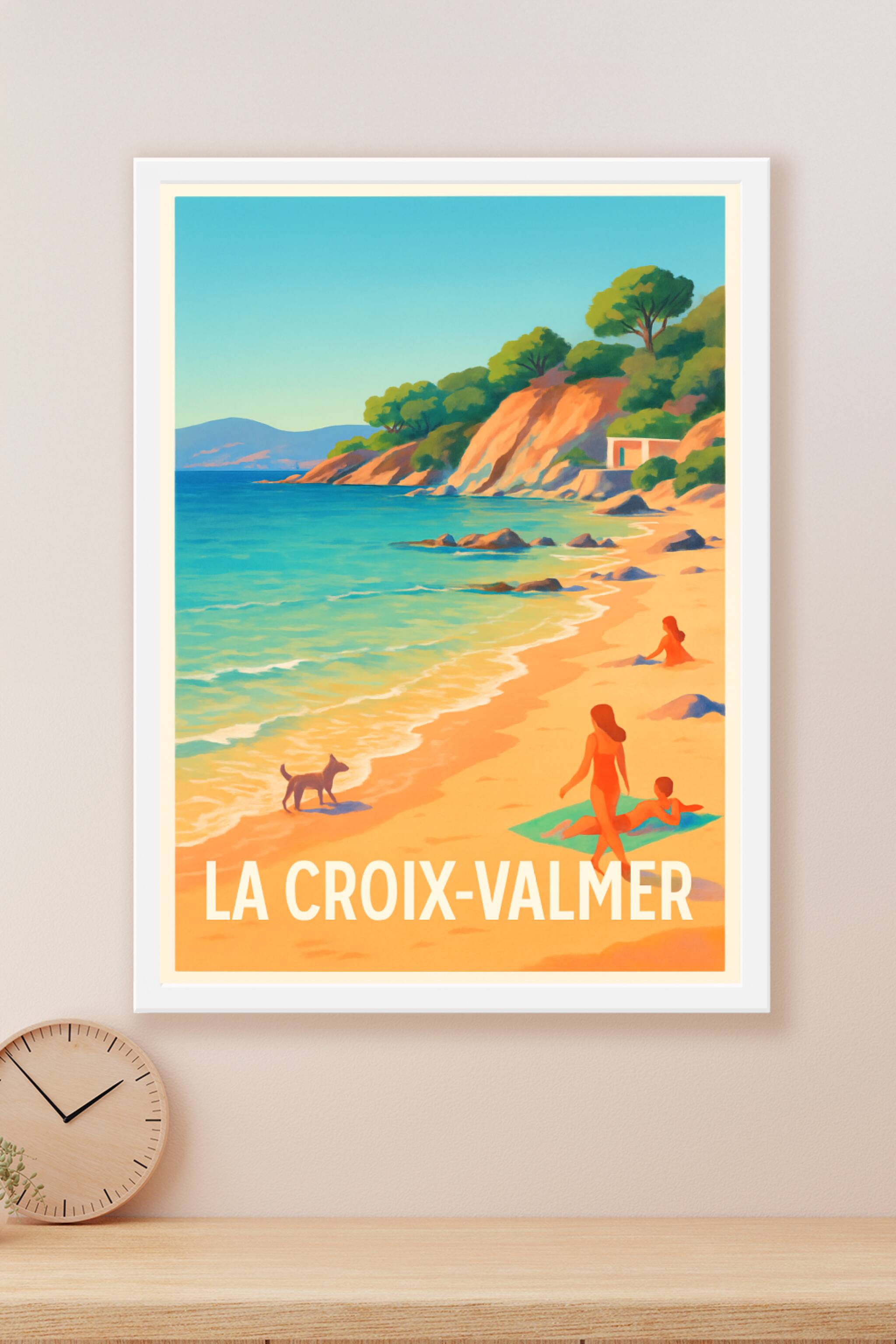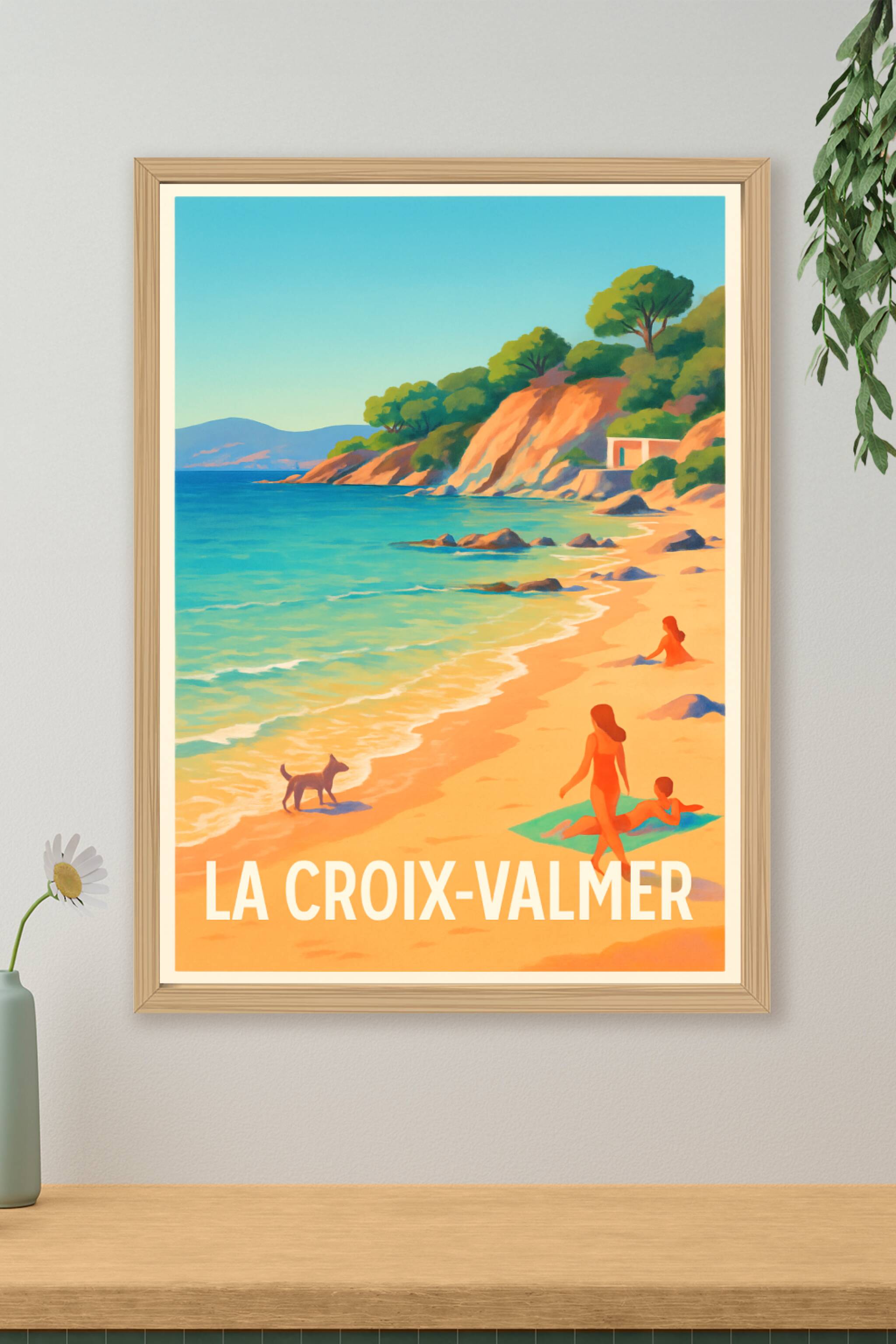 Découvrez la sérénité éclatante de La Croix-Valmer avec cette affiche imprimée dans un style peint délicatement rehaussé par des couleurs chaudes e...