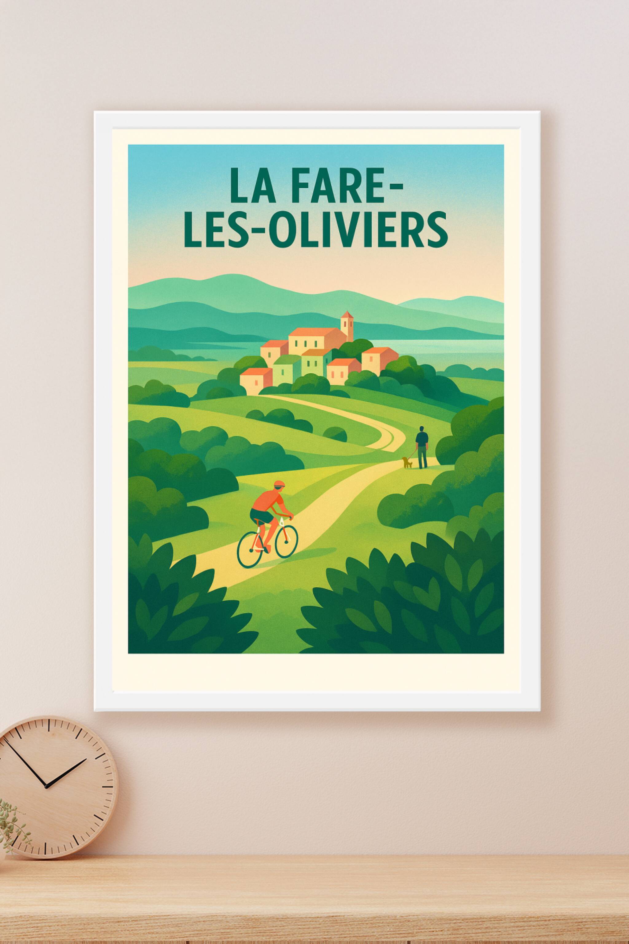 Découvrez la douceur de vivre de La Fare-les-Oliviers à travers cette affiche illustrée au style vintage et apaisant. Ce poster met en scène les pa...