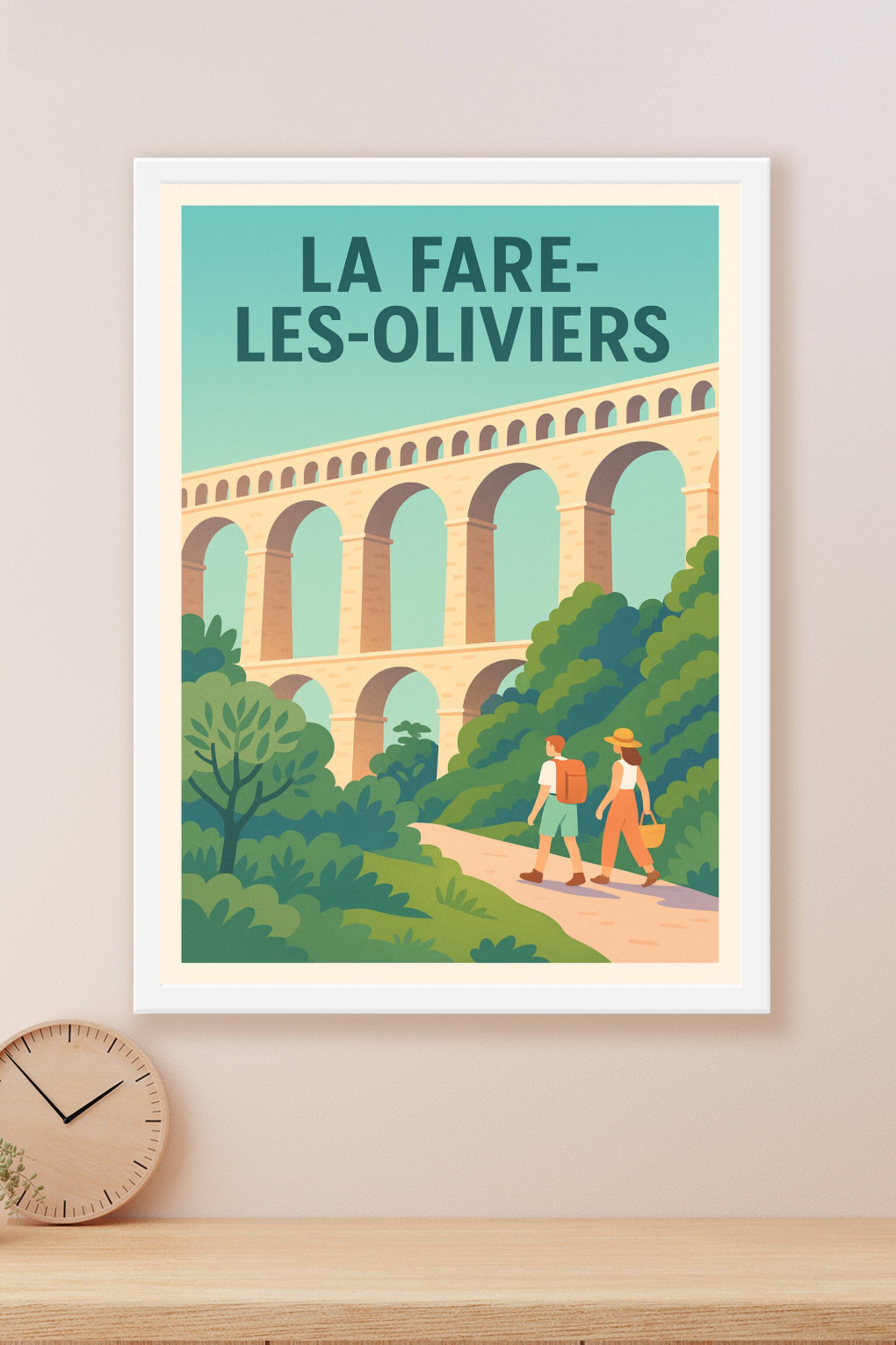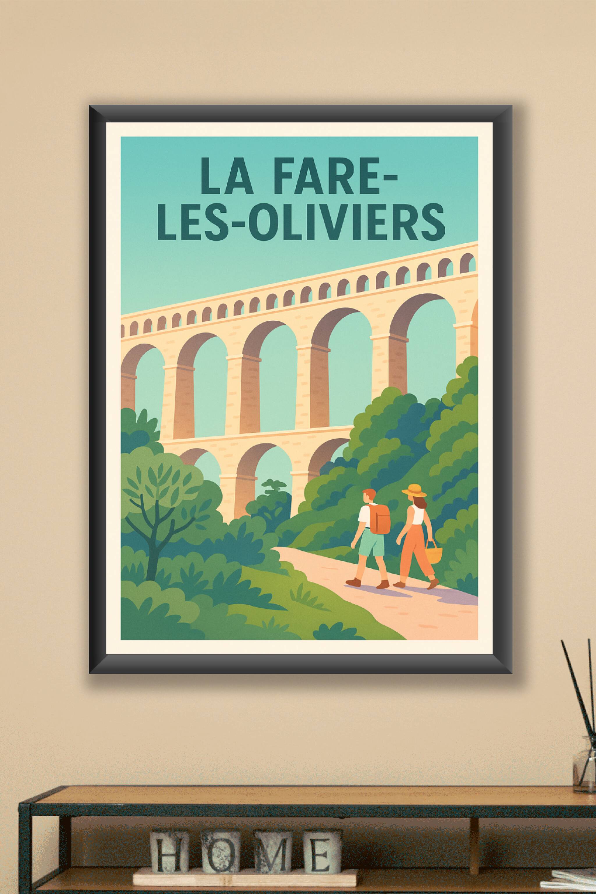 Découvrez la sérénité de La Fare-les-Oliviers avec cette affiche au style vintage mettant en valeur son célèbre aqueduc entouré de verdure luxurian...
