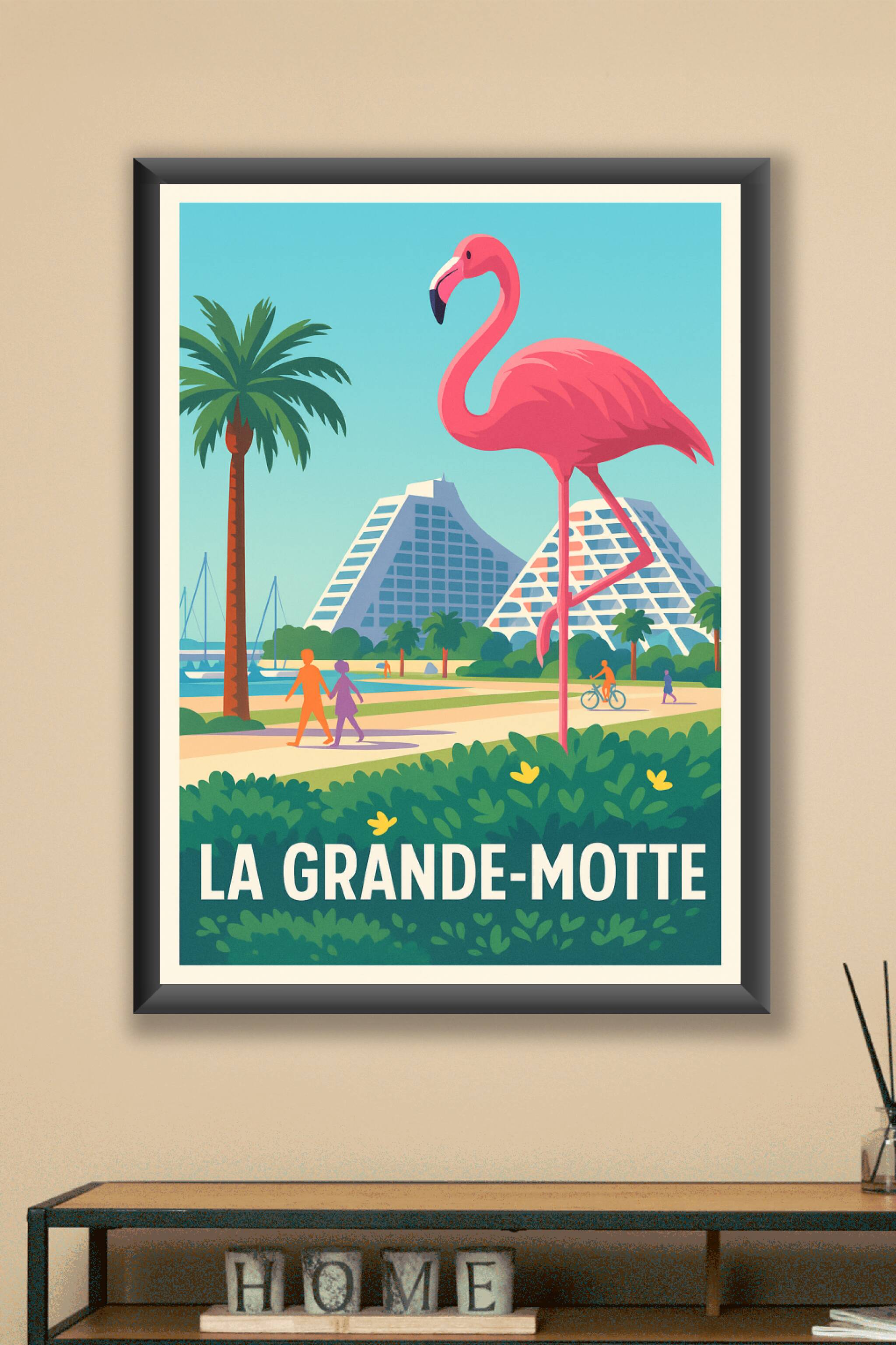 Apportez une touche de douceur méditerranéenne à votre intérieur avec cette affiche illustrée représentant La Grande-Motte, célèbre pour ses pyrami...