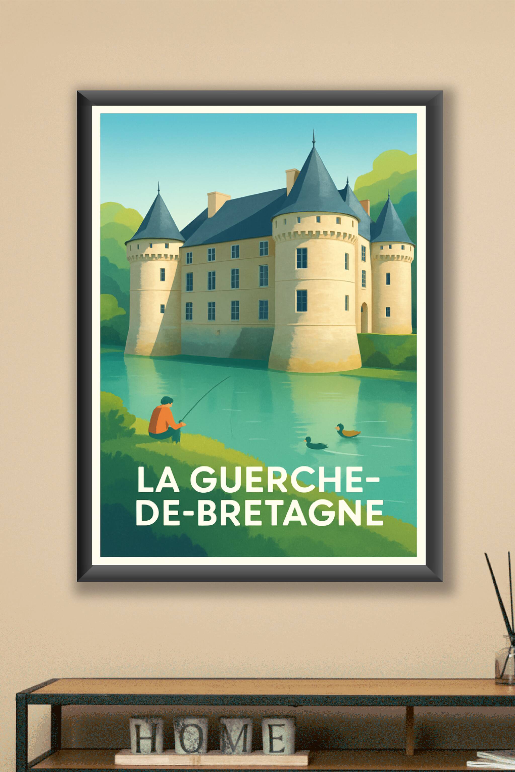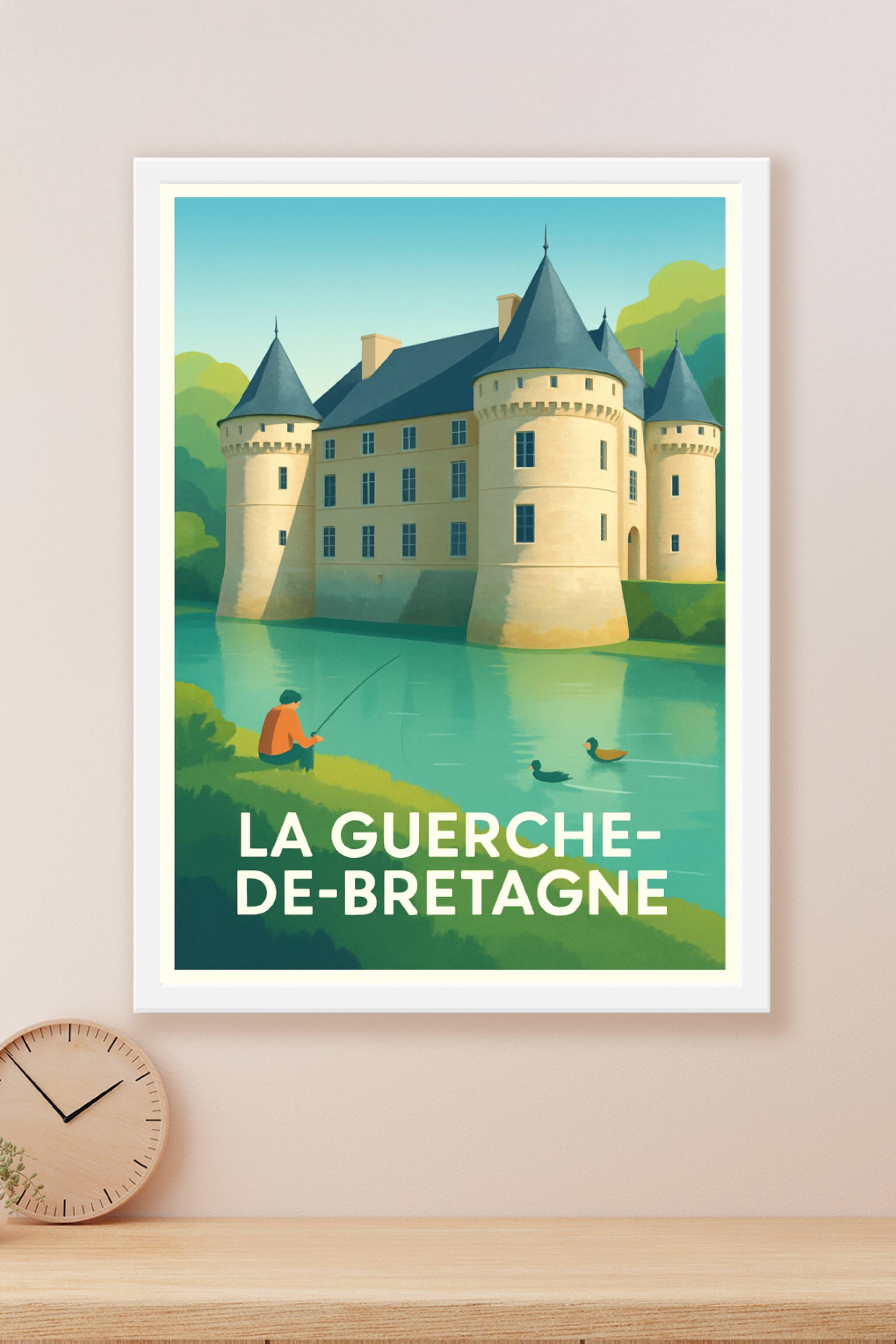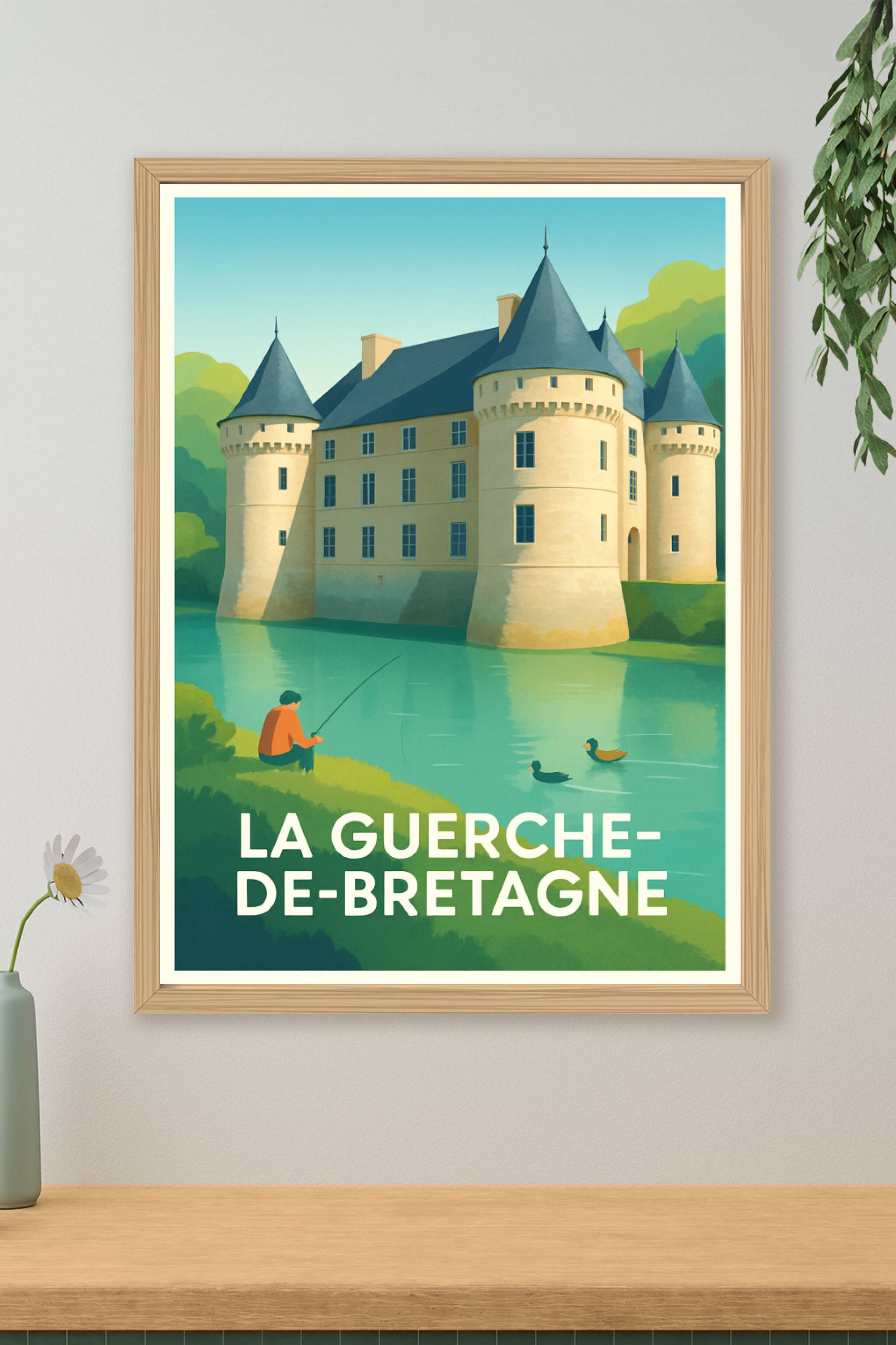 Découvrez l'élégance paisible de La Guerche-de-Bretagne grâce à cette affiche illustrée mettant en scène son célèbre château entouré d'un bassin ca...