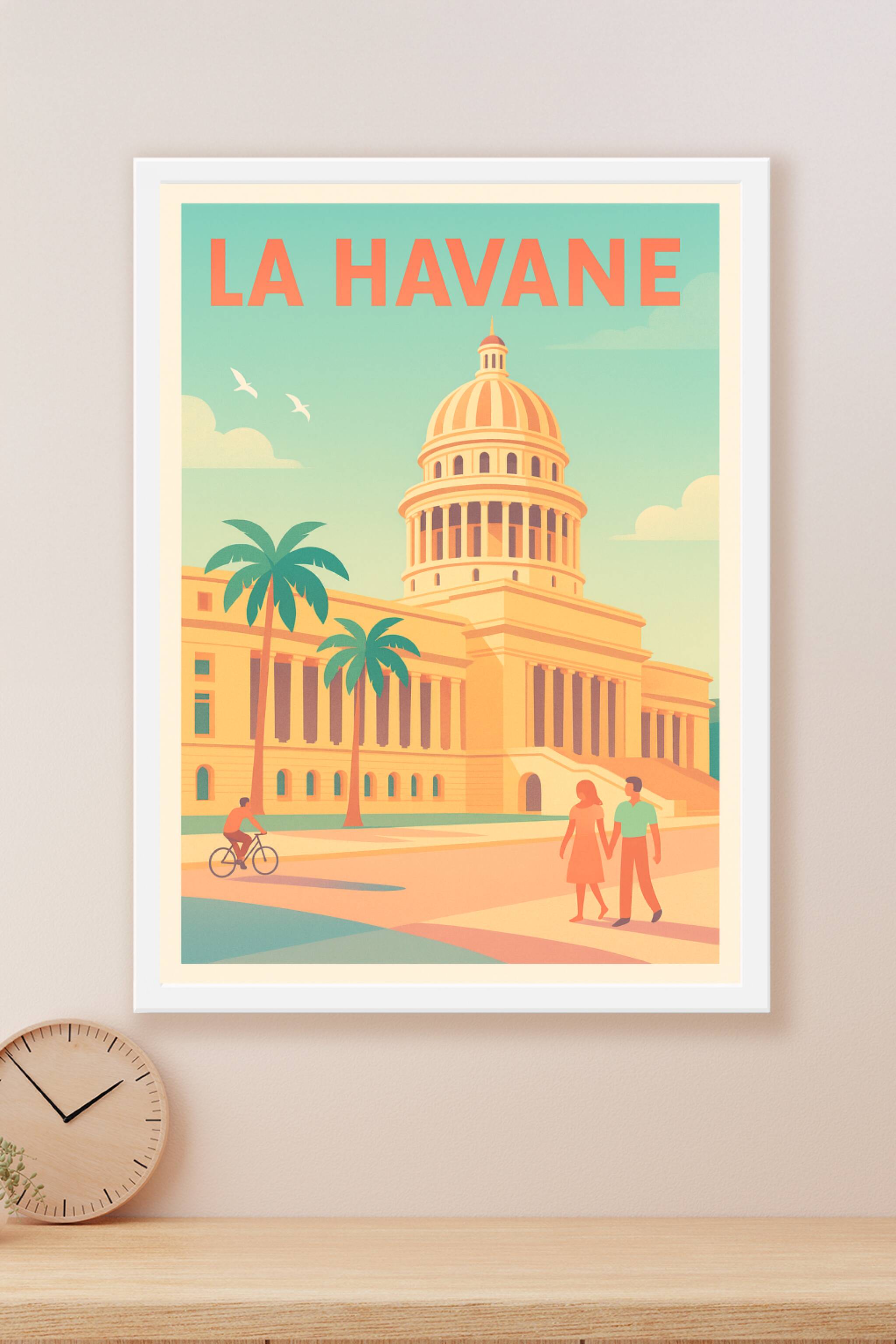 Découvrez l'élégance intemporelle de La Havane avec cette affiche illustrée mettant en scène l'emblématique Capitole et ses palmiers sous un ciel a...