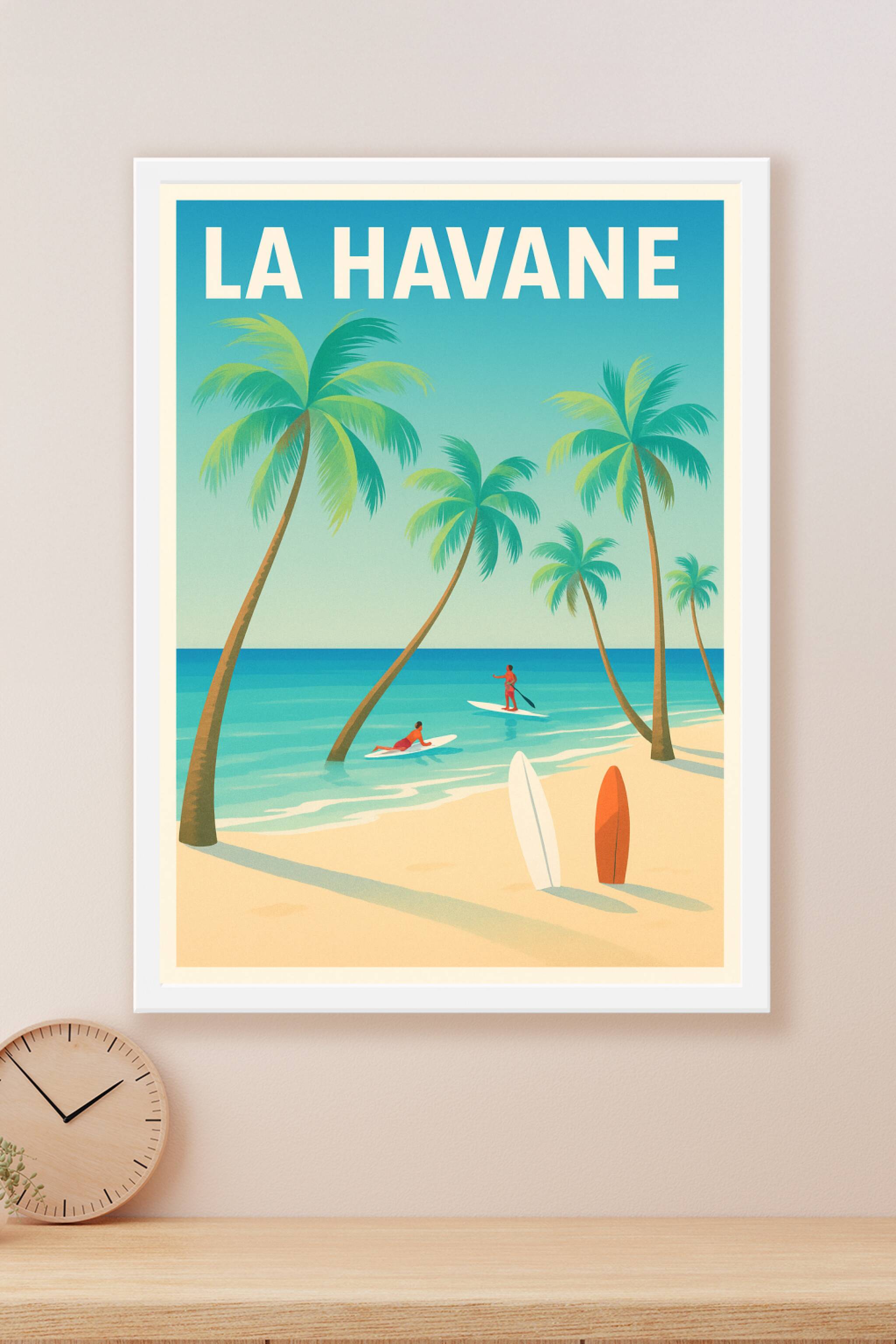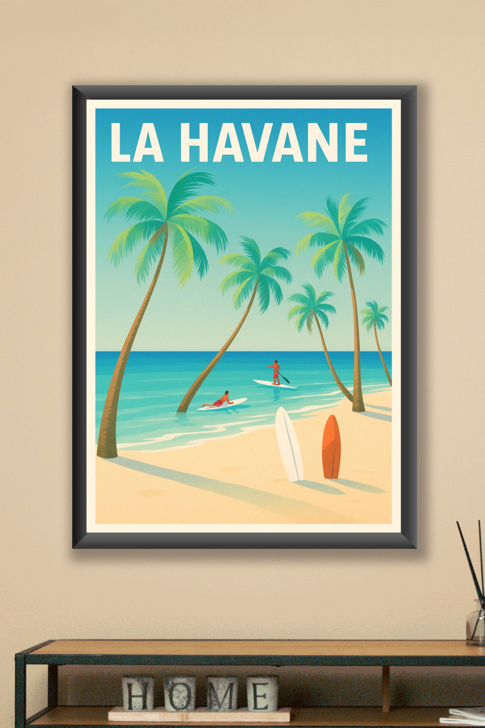 Apportez une touche d'exotisme et de détente à votre intérieur avec cette affiche inspirée des plages paradisiaques de La Havane. Le poster met en scène une scène idyllique entre palmiers, mer turquoise et surfeurs, idéale pour ceux qui rêvent d'évasion sous le soleil des Caraïbes. Imprimée en tirage "Fine Art" sur papier 305g coton, cette affiche offre une qualité d'impression exceptionnelle, avec des couleurs vives et durables. Disponible en formats A1 à A4, avec ou sans cadre, ce poster devient un élément clé de votre décoration murale, parfait pour créer une ambiance relaxante et chaleureuse chez vous ou pour offrir un cadeau unique aux passionnés de voyage.