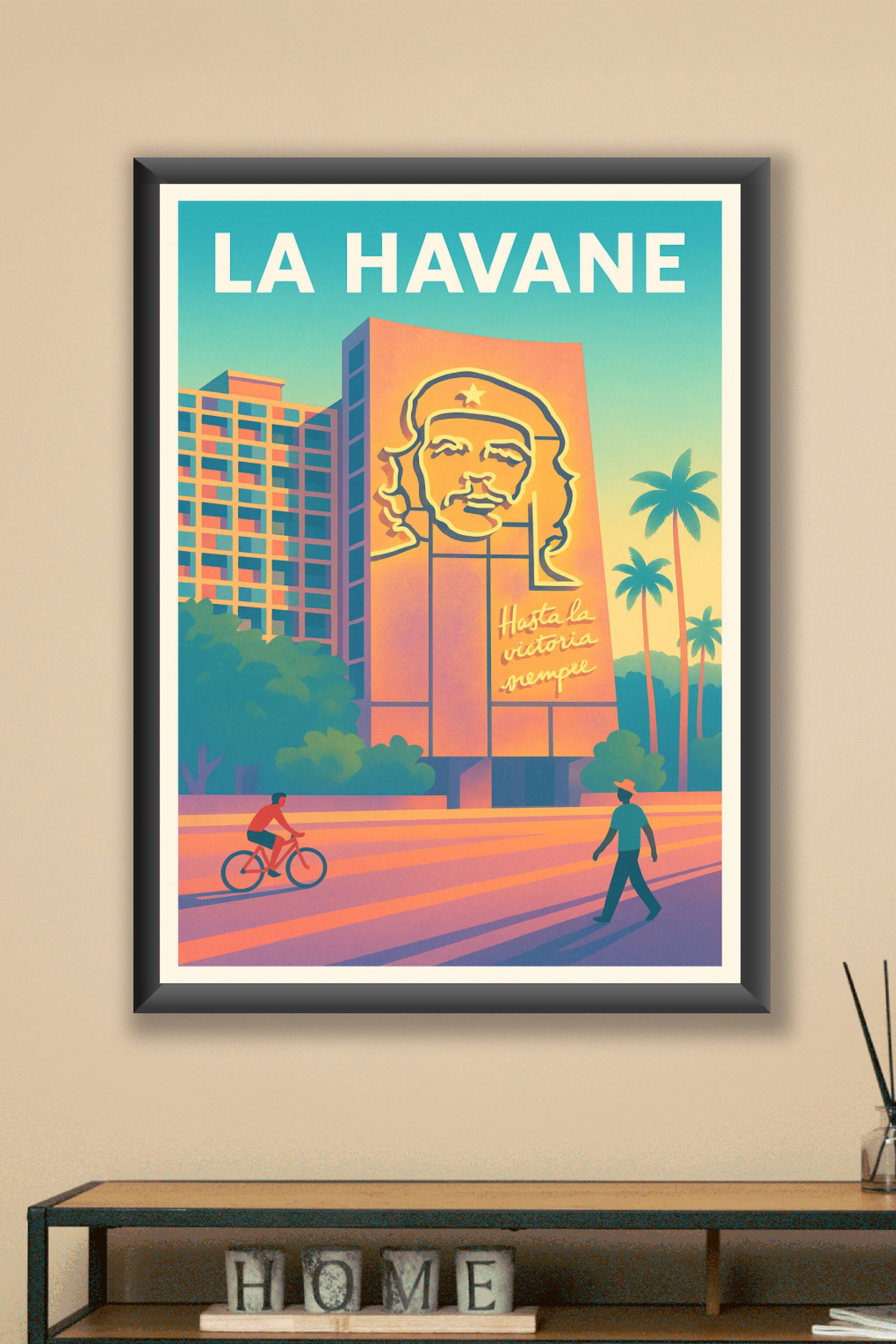 Découvrez l'essence de La Havane à travers cette affiche captivante illustrant le célèbre portrait du Che Guevara sur une façade emblématique, baig...