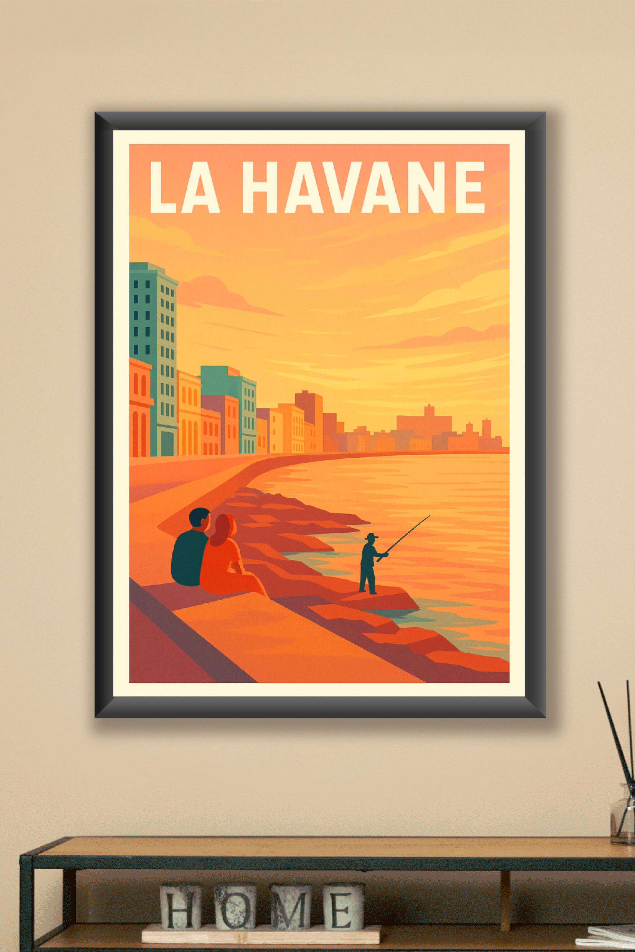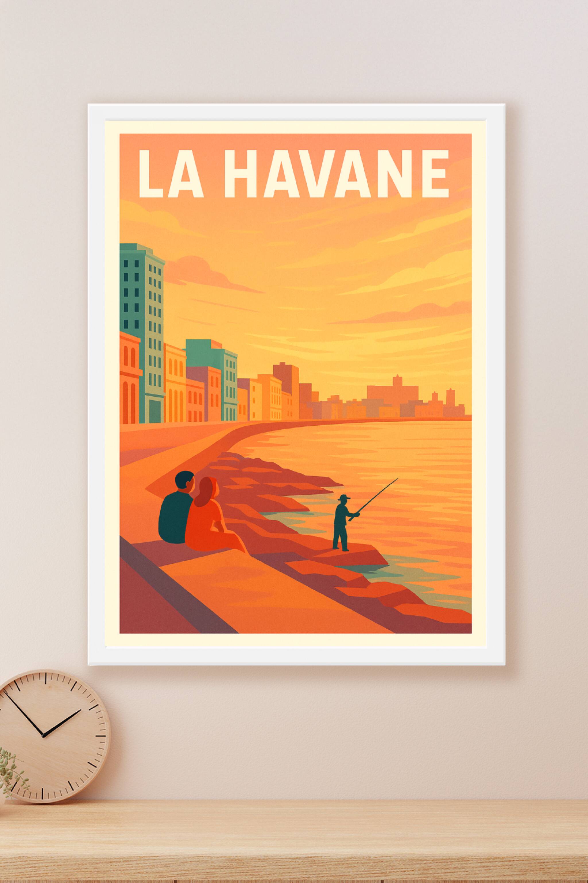 Découvrez la magie tranquille de La Havane avec cette affiche illustrée mettant en scène une promenade en bord de mer au crépuscule. Les couleurs c...