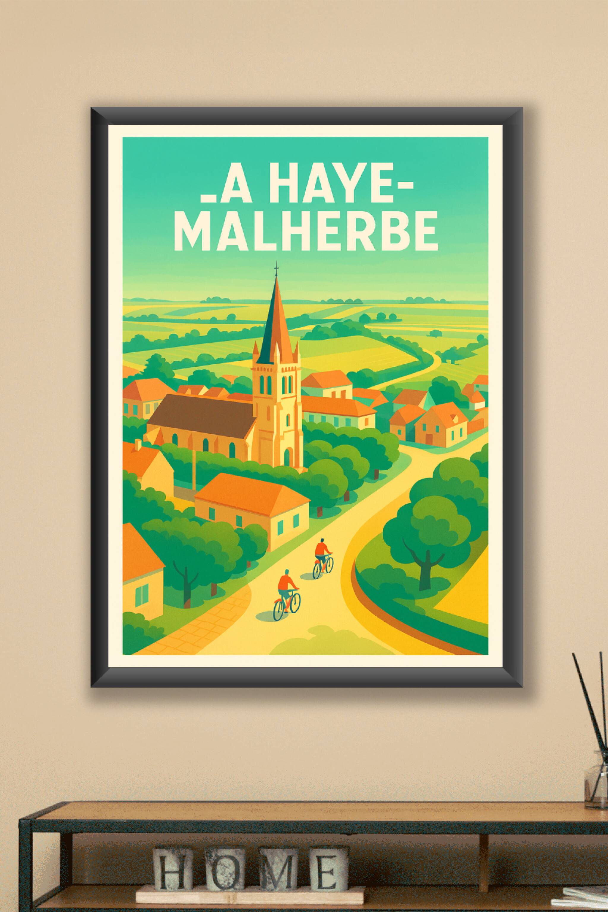 Découvrez la douceur de vivre de La Haye-Malherbe à travers cette affiche au style rétro modernisé, représentant ses paisibles paysages et son arch...