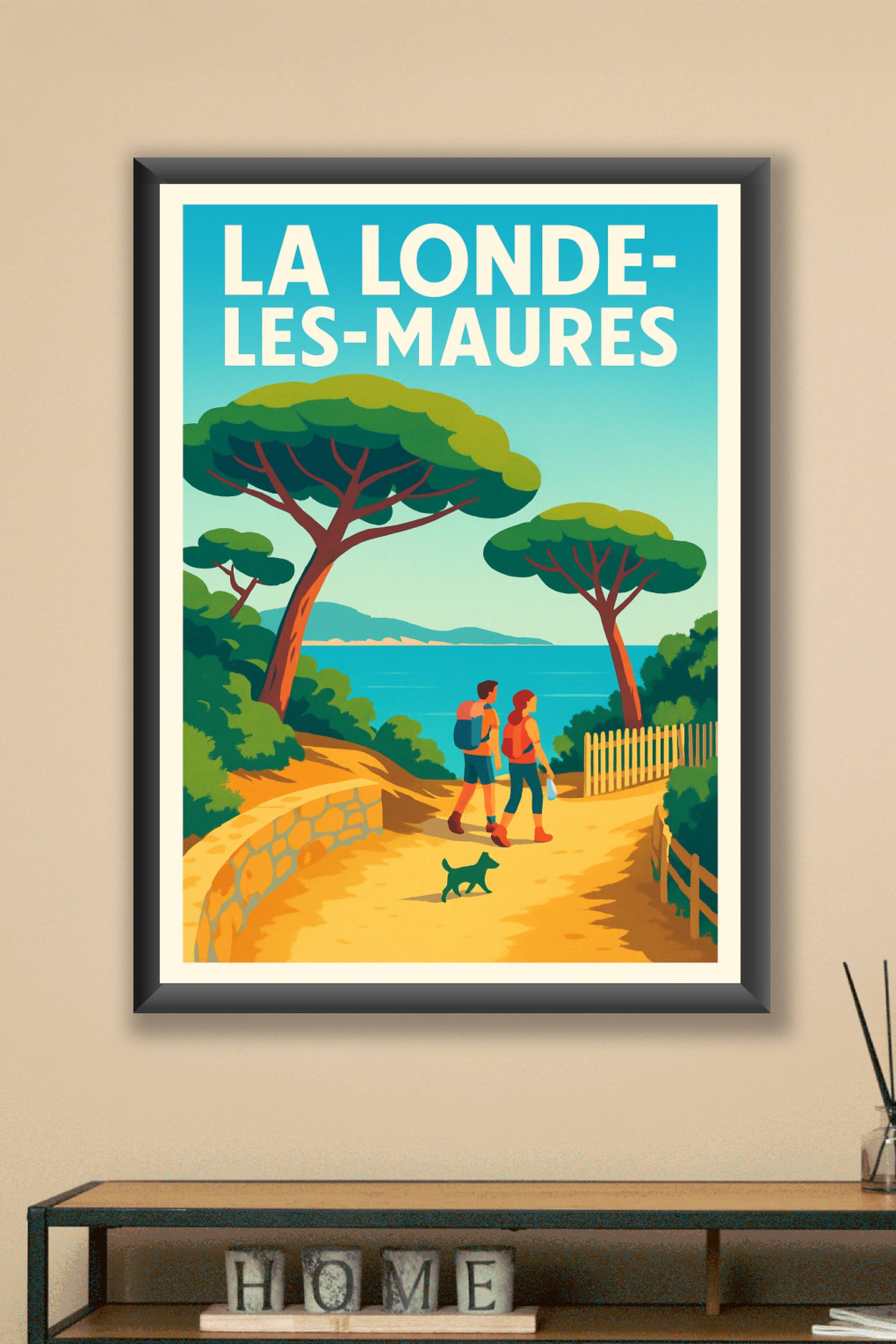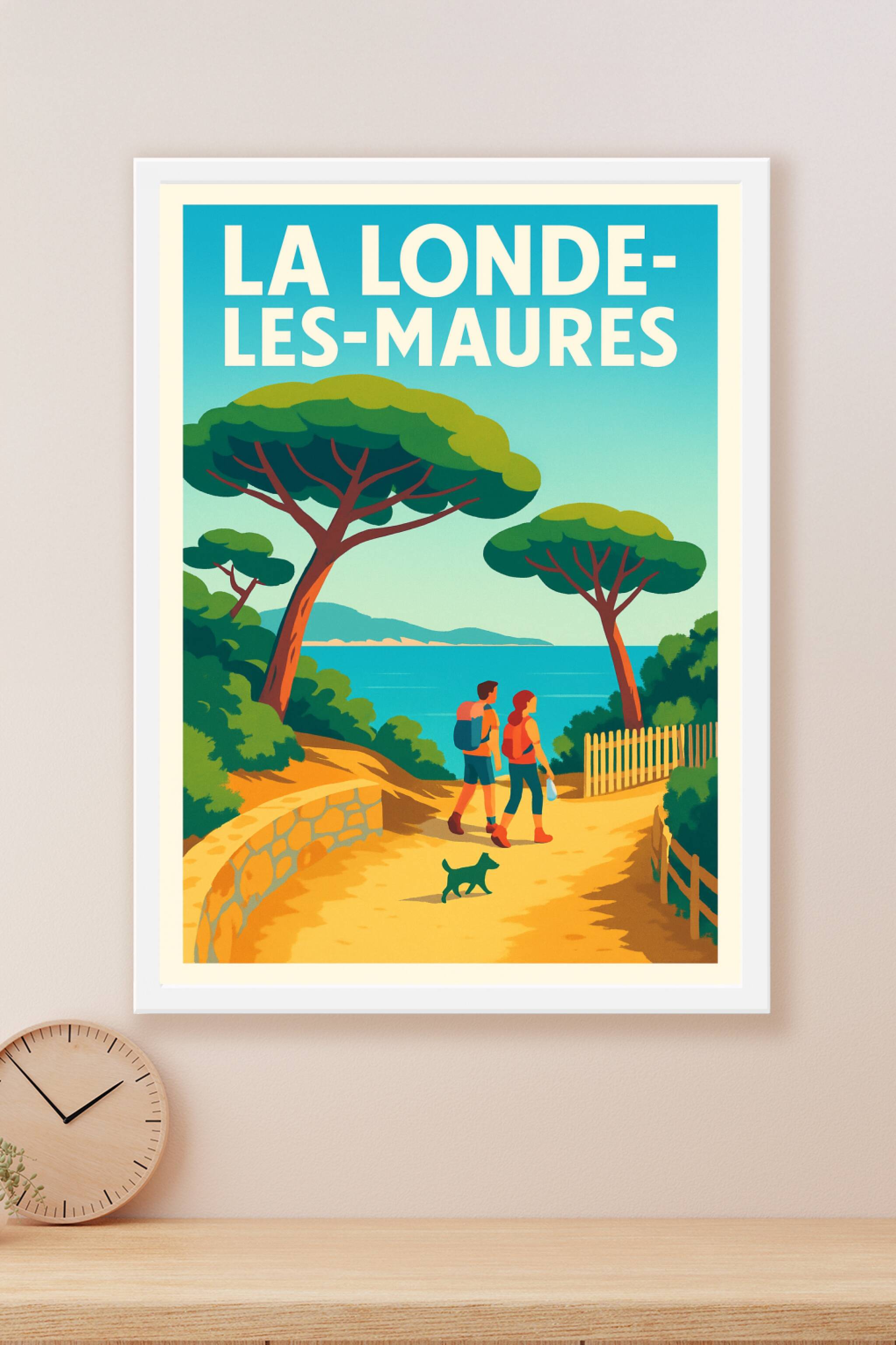 Découvrez la douceur de vivre de La Londe-les-Maures avec cette affiche illustrée qui capture l'essence d'une balade en bord de mer sous les pins p...