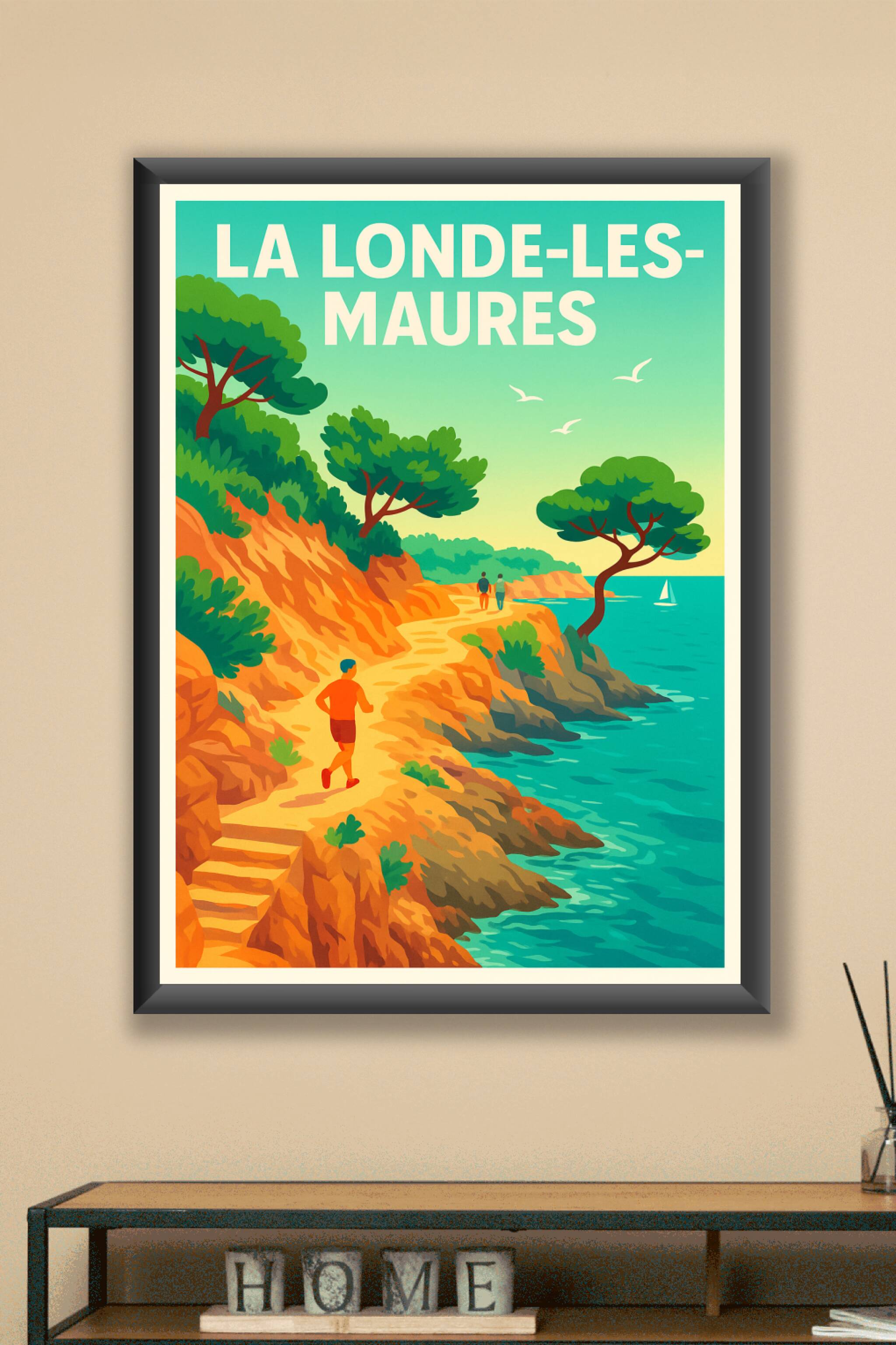 Découvrez la beauté naturelle et méditerranéenne de La Londe-les-Maures avec cette affiche aux couleurs vives et apaisantes. Ce poster illustre un sentier côtier baigné de lumière, entouré de falaises orangées et d'une mer turquoise, parfait pour les amoureux de la randonnée et du littoral.Chaque affiche est imprimée en tirage "Fine Art" sur papier 305g coton, garantissant une qualité d'impression exceptionnelle et des couleurs éclatantes qui résistent au temps. Disponible en plusieurs formats, de A1 à A4, avec ou sans cadre, ce poster s'adapte à toutes vos envies de décoration intérieure.Fabriquée avec soin en France, cette affiche de La Londe-les-Maures saura apporter une touche d'évasion et de fraîcheur à votre maison ou constituer un cadeau raffiné pour les passionnés de la Côte d'Azur.