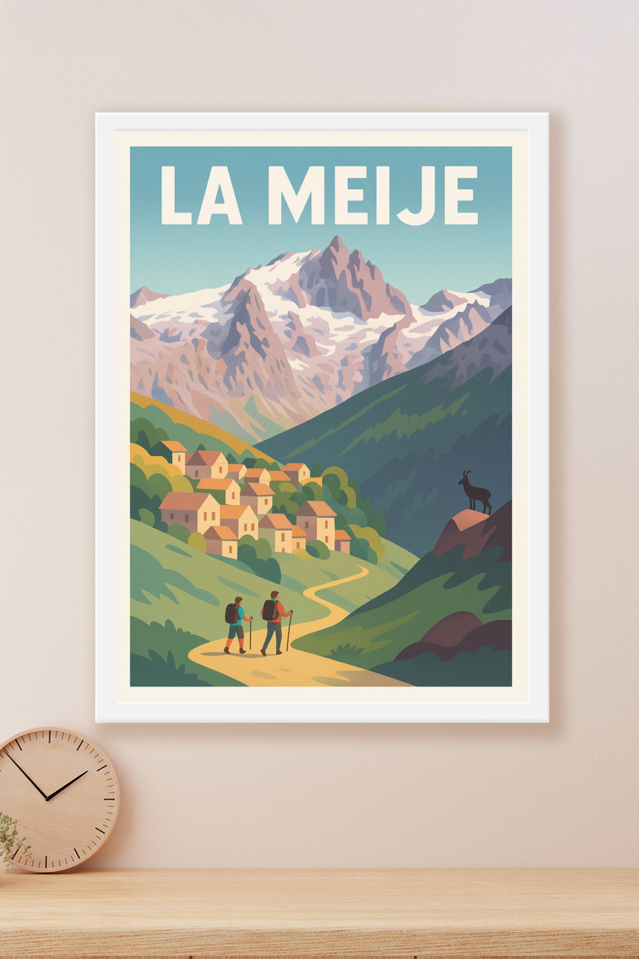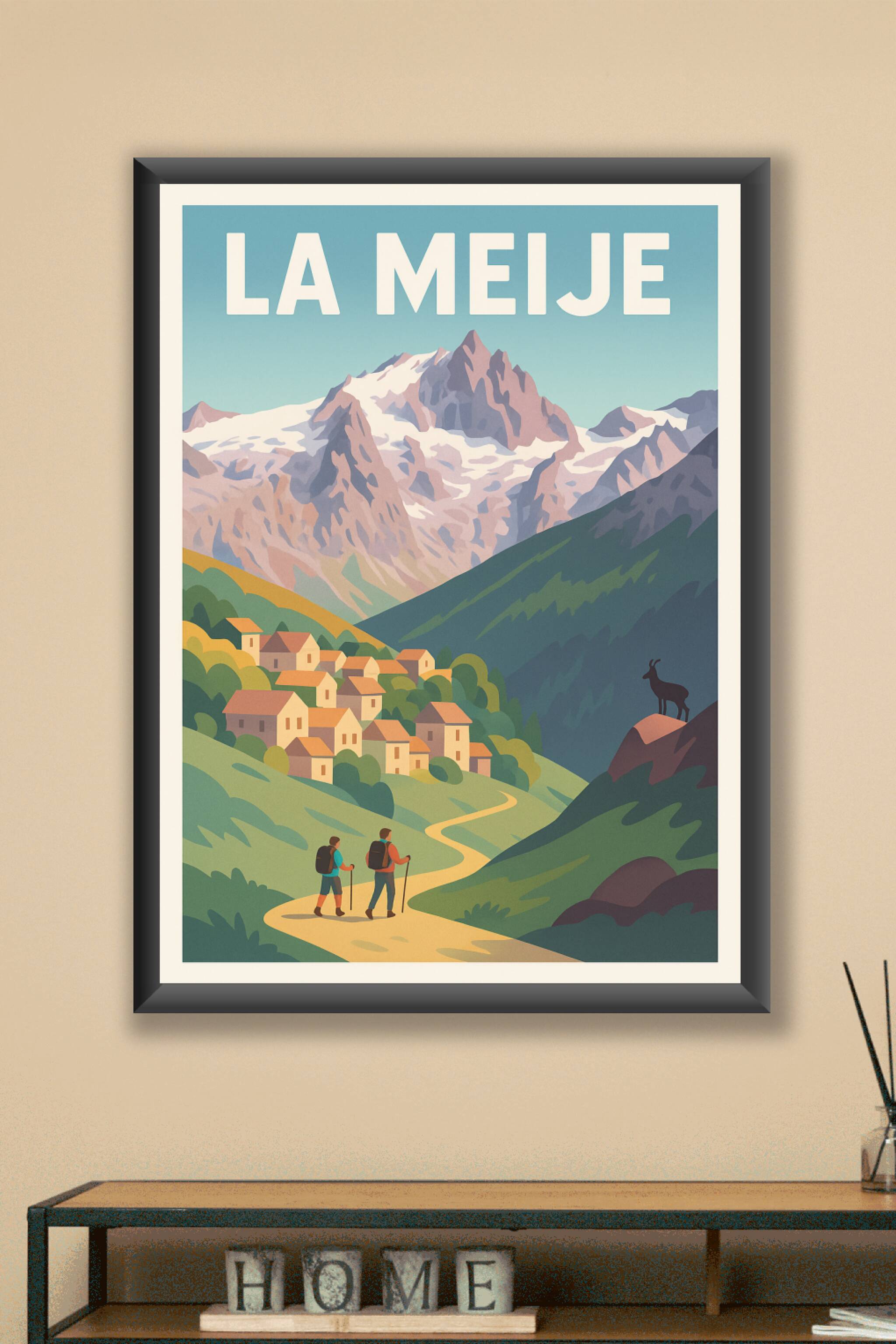 Découvrez la beauté majestueuse et sauvage de La Meije grâce à cette affiche au style vintage qui capture parfaitement l'ambiance des Alpes françai...