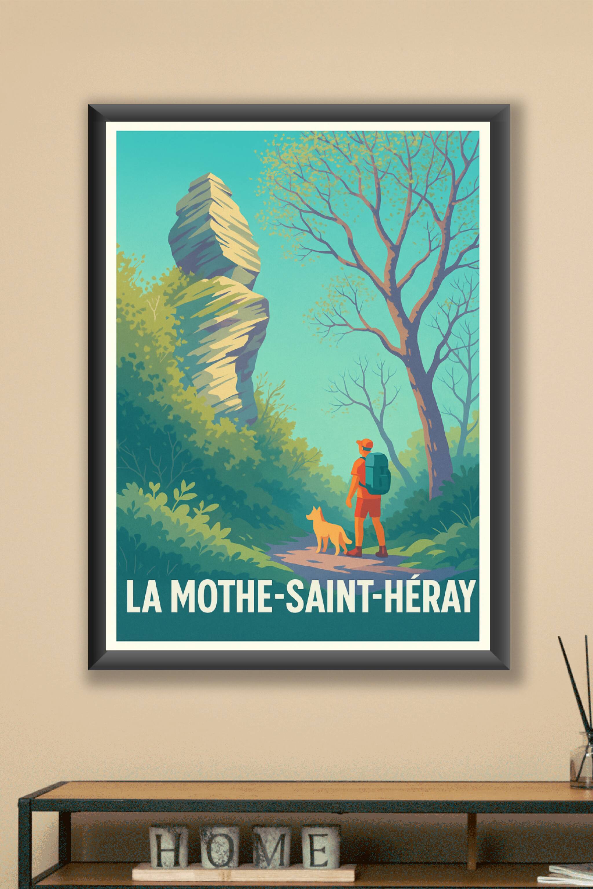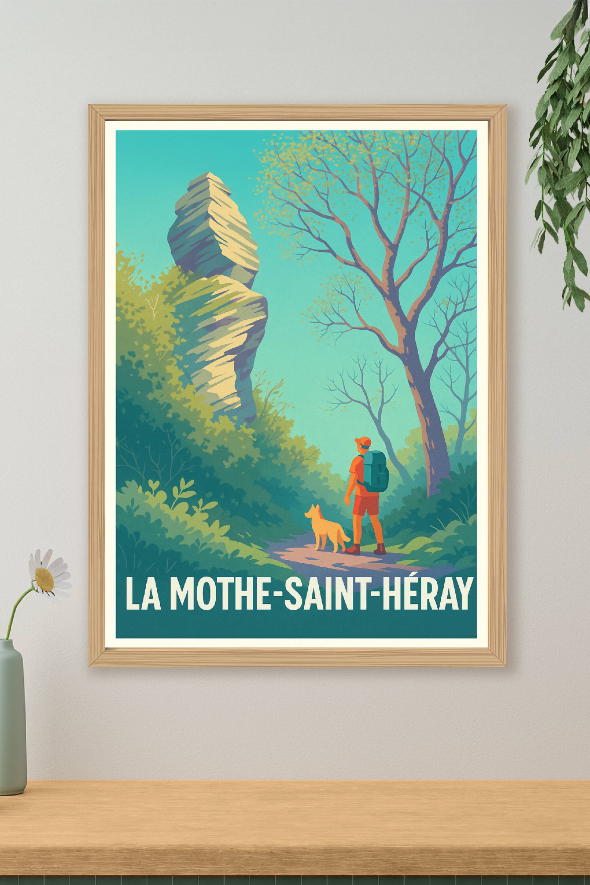 Découvrez la beauté sauvage et apaisante de La Mothe-Saint-Héray avec cette affiche inspirante qui capture un moment de randonnée contemplative en pleine nature. Un promeneur accompagné de son chien admire les paysages verdoyants et la roche emblématique, invitation au voyage et à l'aventure.L'affiche est imprimée en tirage "Fine Art" sur papier 305g coton, garantissant une qualité d'impression remarquable et une finesse de détails exceptionnelle. Disponible du format A1 à A4, avec ou sans cadre, ce poster s'adapte parfaitement à votre décoration d'intérieur.Offrez-vous cette sublime affiche ou ce poster premium, entièrement fabriqué en France, pour apporter une touche d'évasion et de sérénité à votre espace de vie.