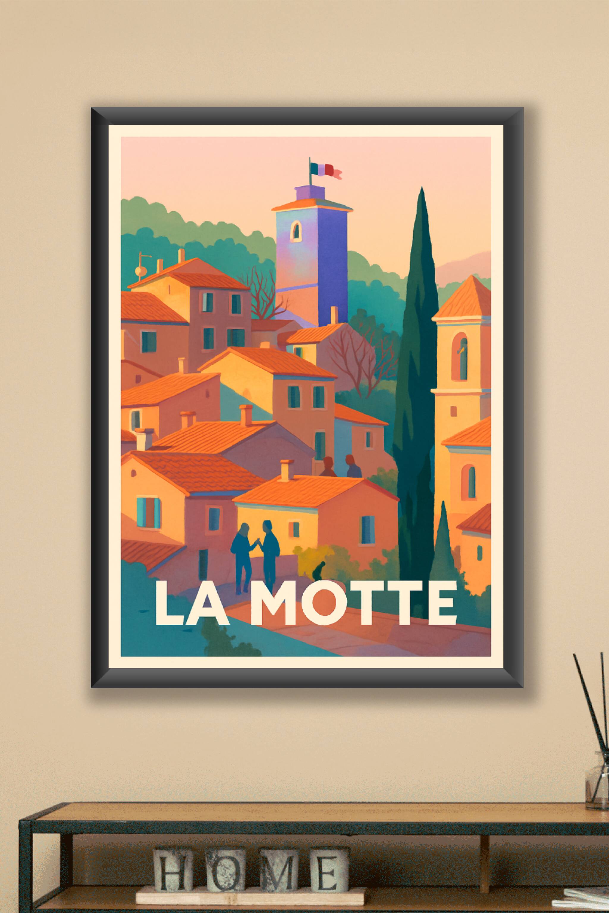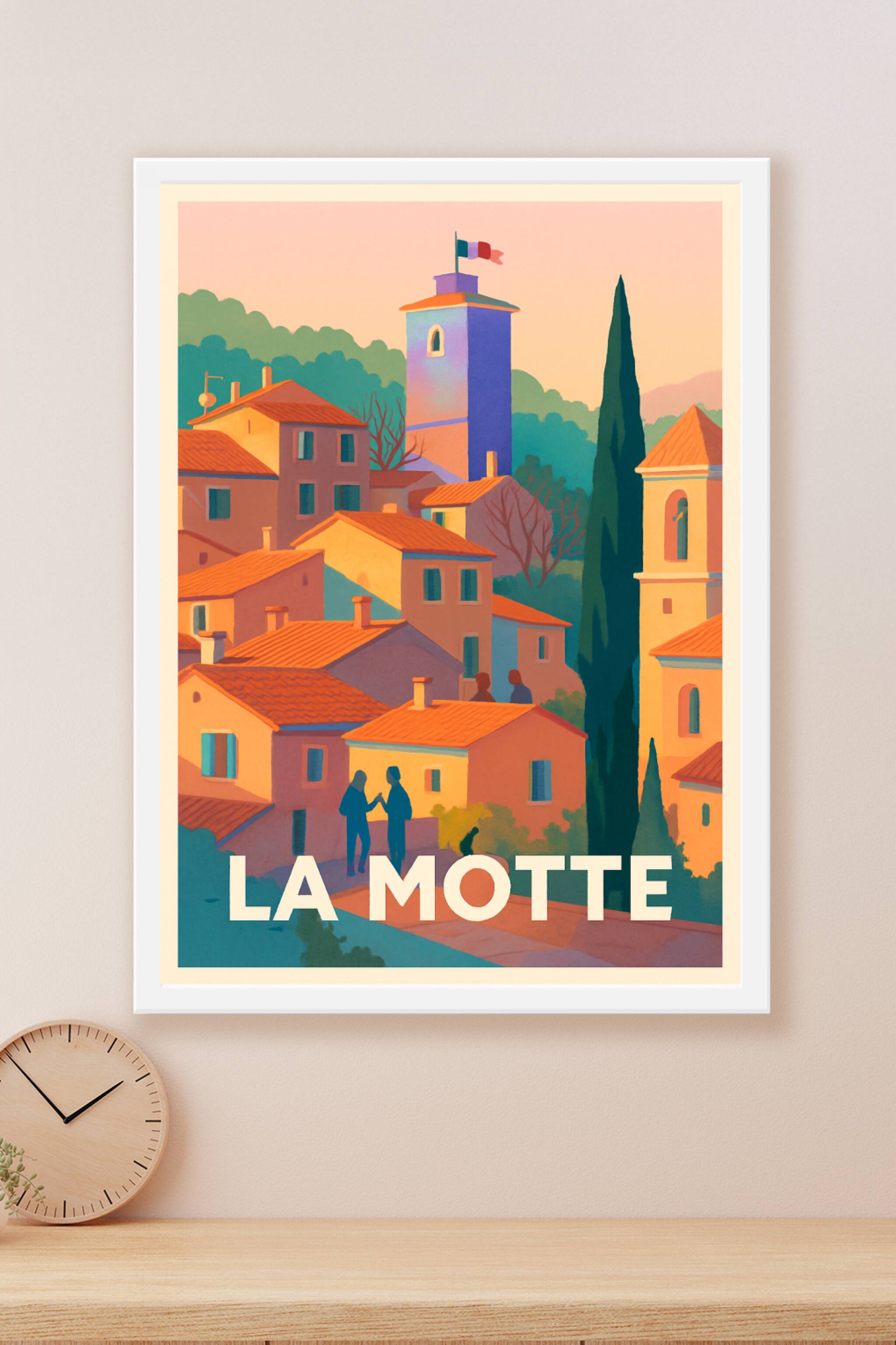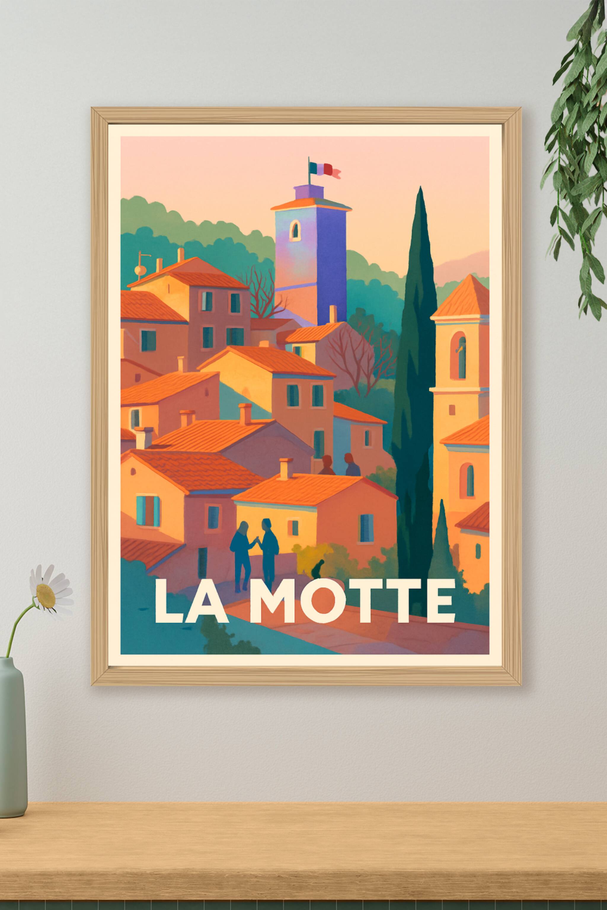 Découvrez l'atmosphère paisible et colorée de La Motte avec cette affiche illustrée mettant en scène les toits rouges et les collines environnantes...